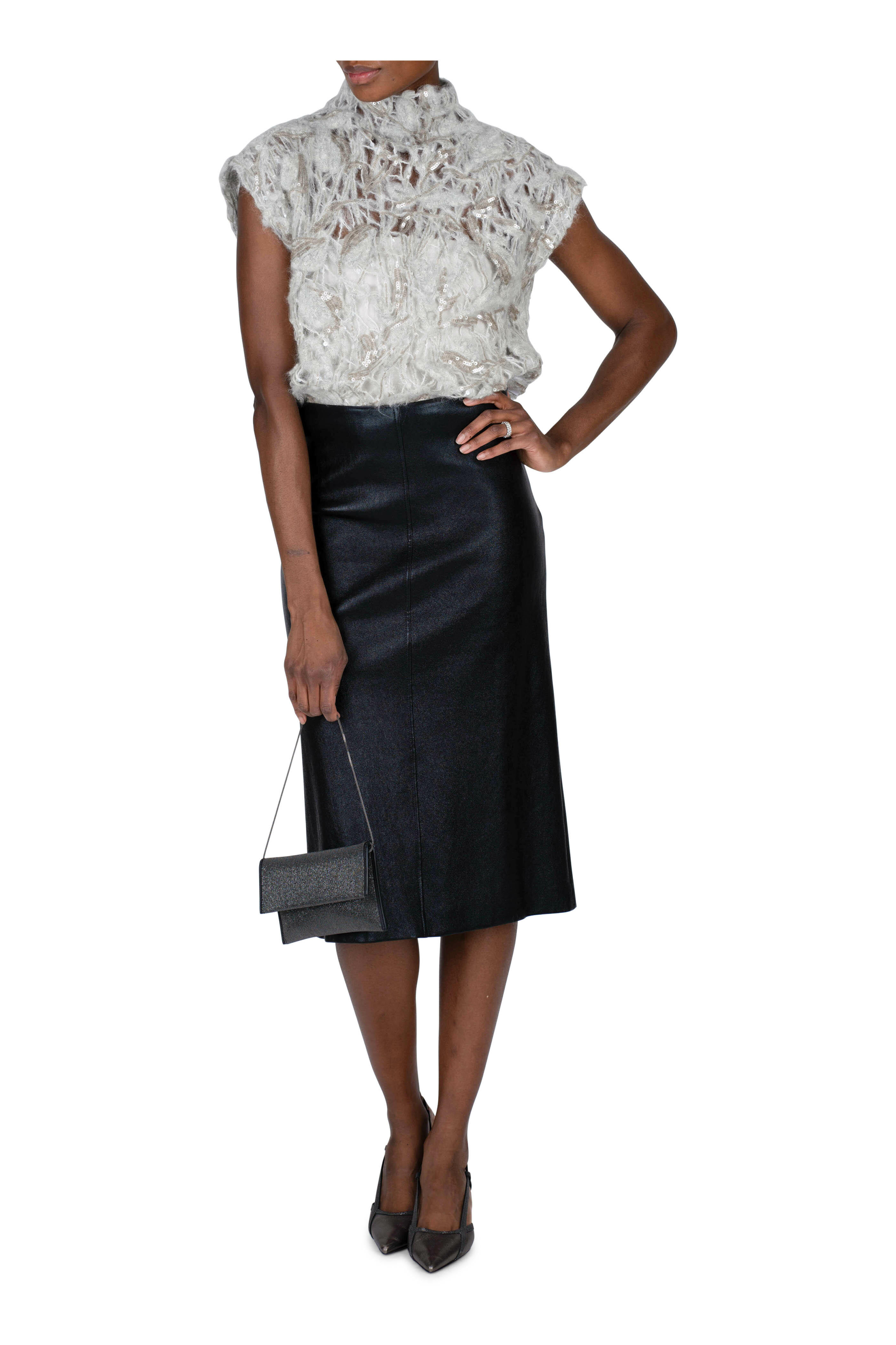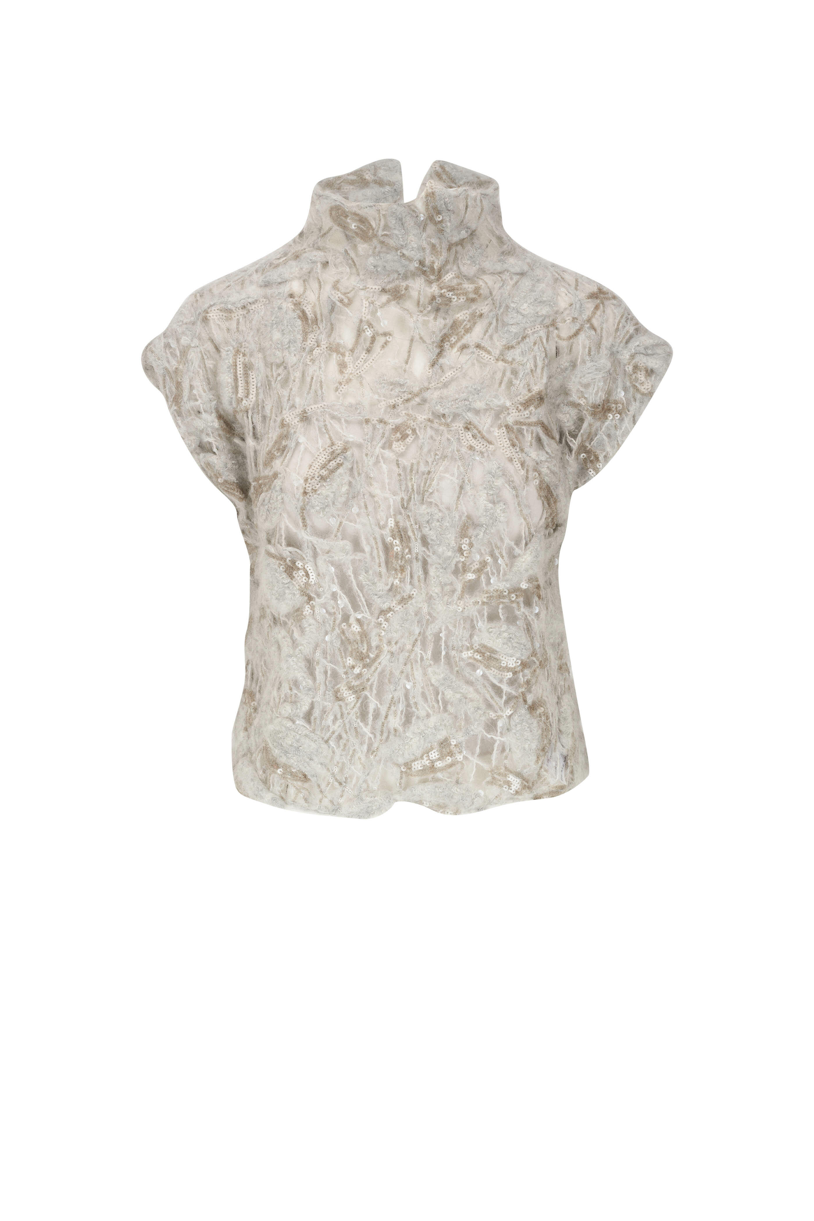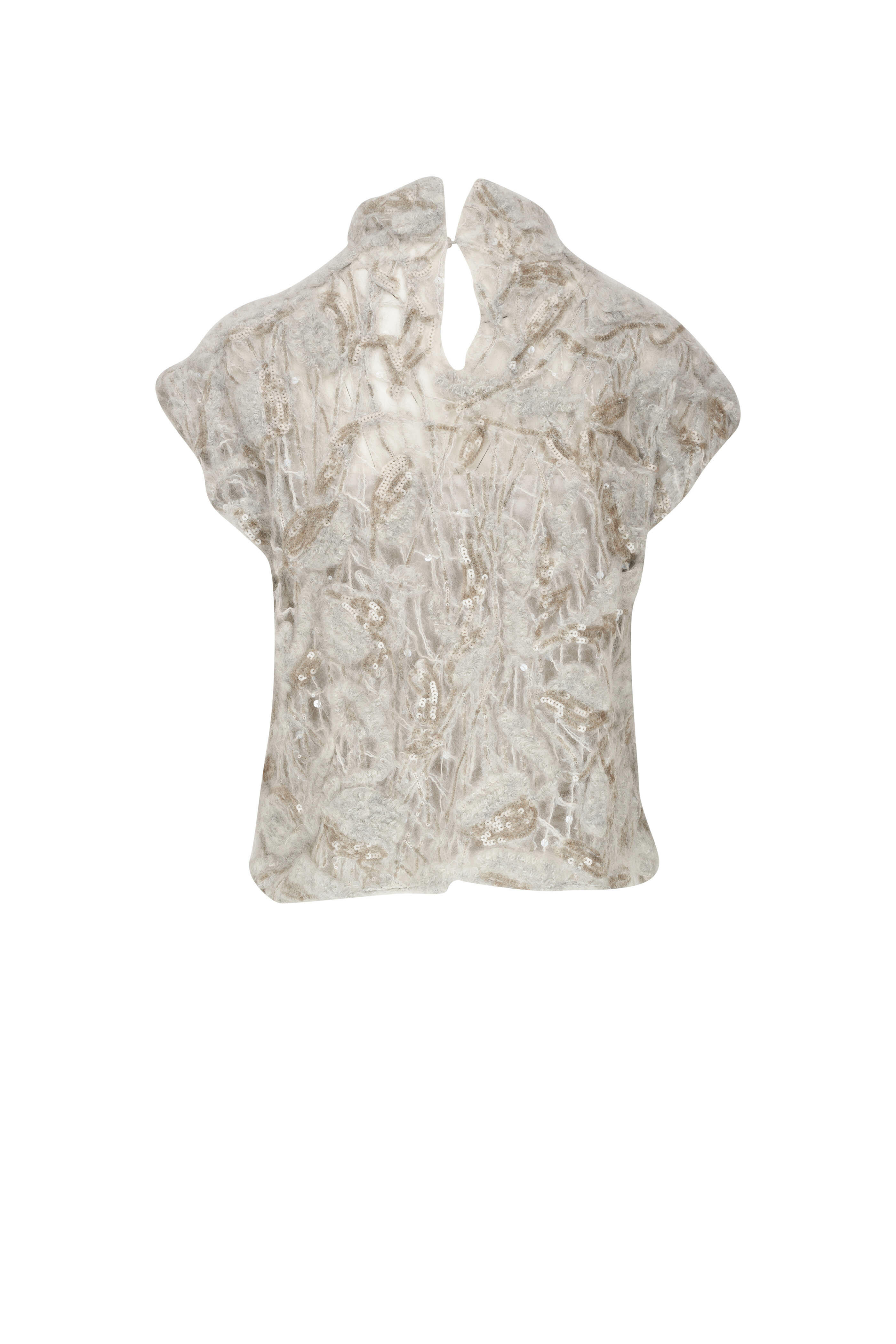 Mock neckline. Keyhole button back. Cap sleeves. Made in Italy. 81% mohair, 11% polyamide, 8% wool; 100% polyester pallietes. Hand wash.