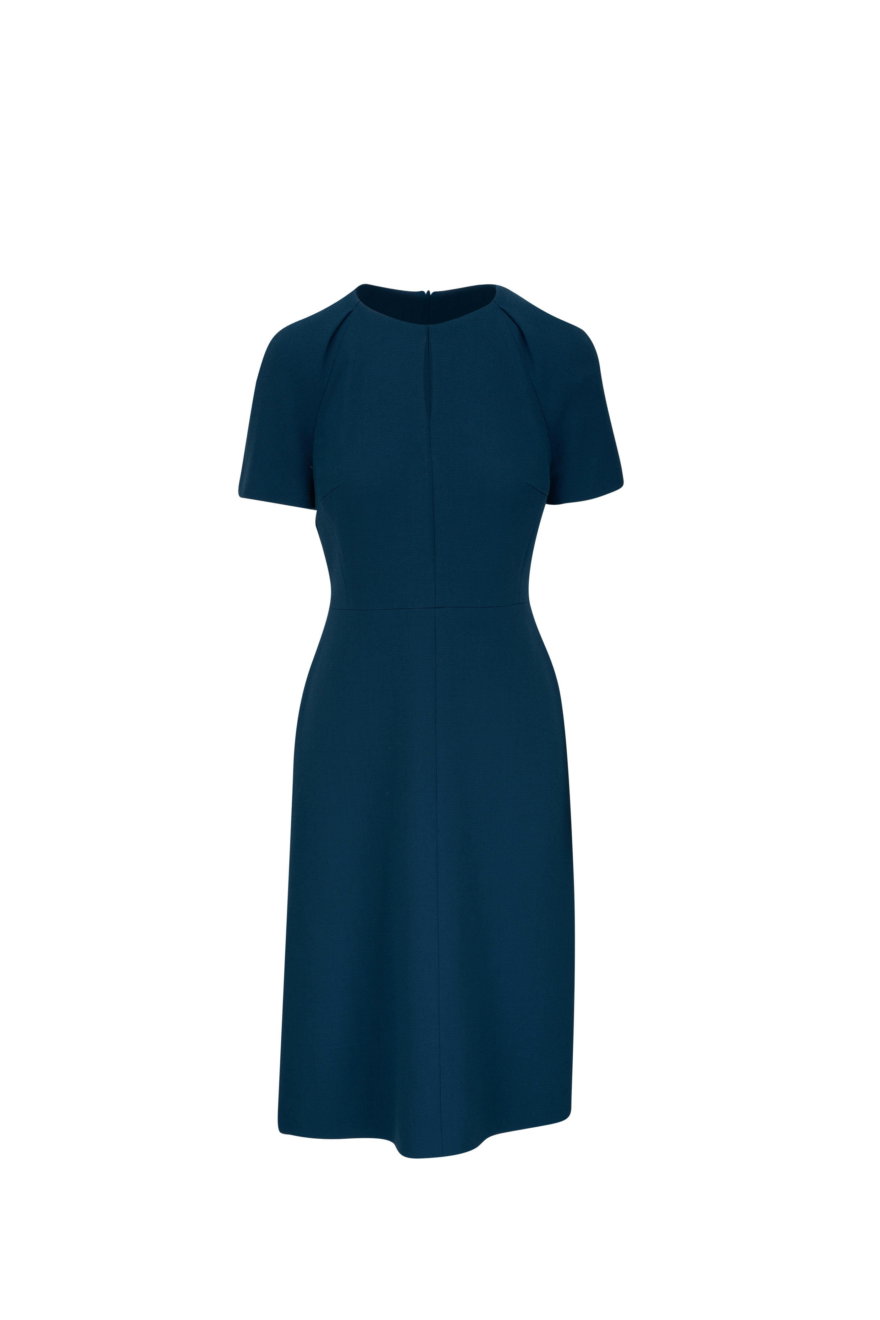 Round, keyhole neckline. Concealed back zip. Short sleeves. Straight hem. Made in Italy. 43" shoulder to hem. 100% wool; fully lined. Dry clean.