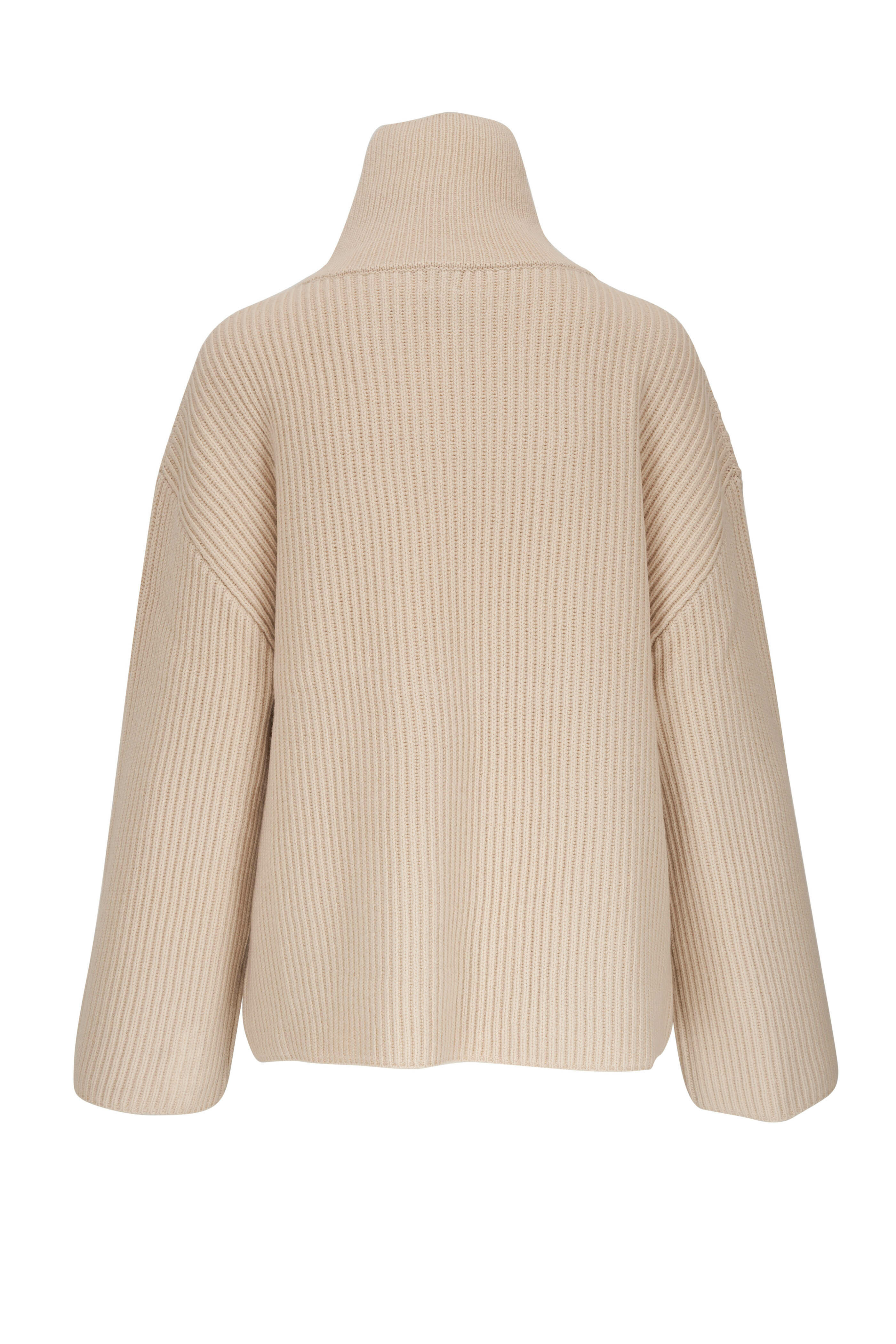 Stone Beige Wrapped Turtleneck Ribbed Sweater