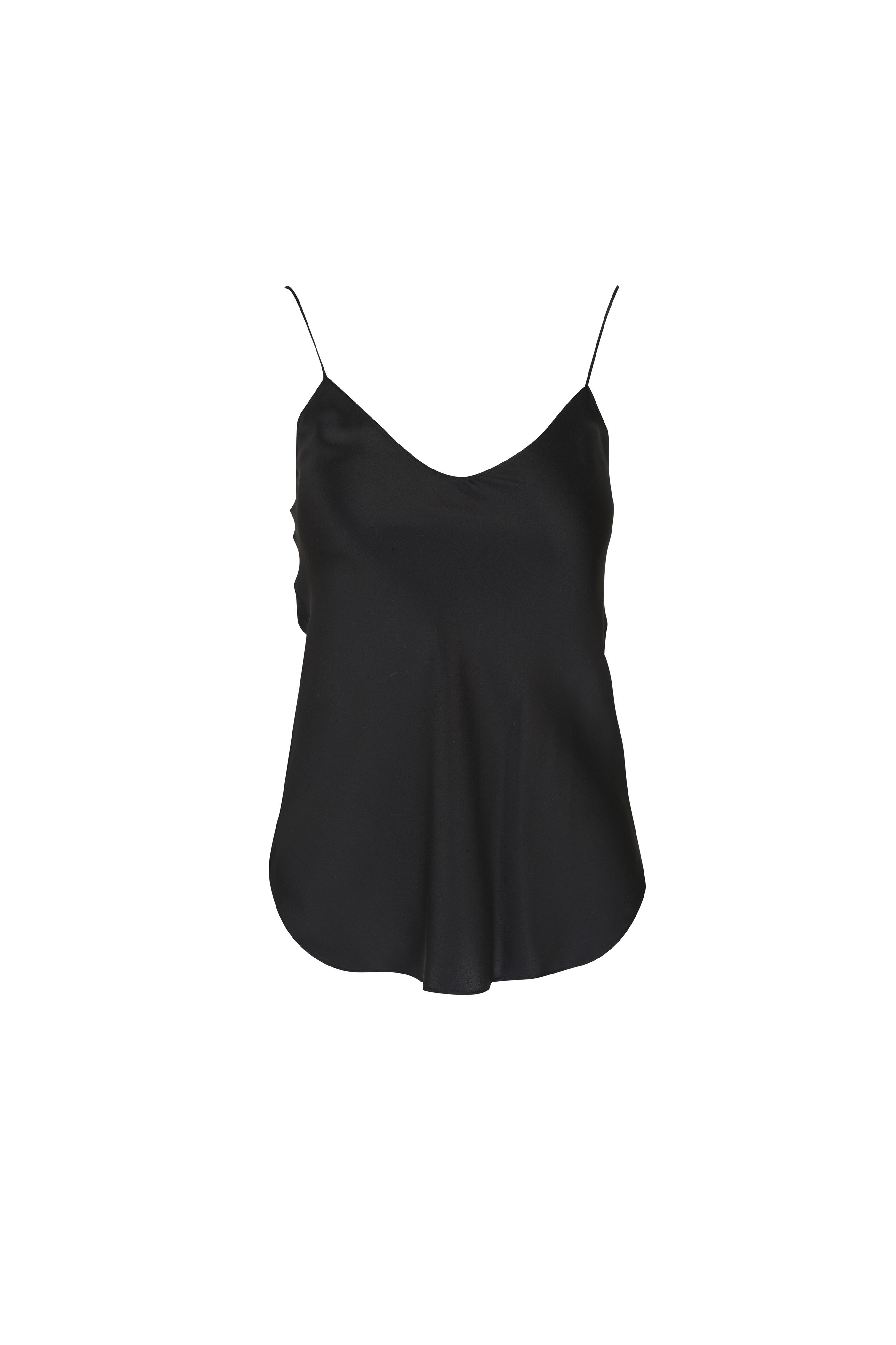 V-neckline. Adjustable spaghetti straps. Curved hem. Made in the USA. 100% silk. Dry clean.