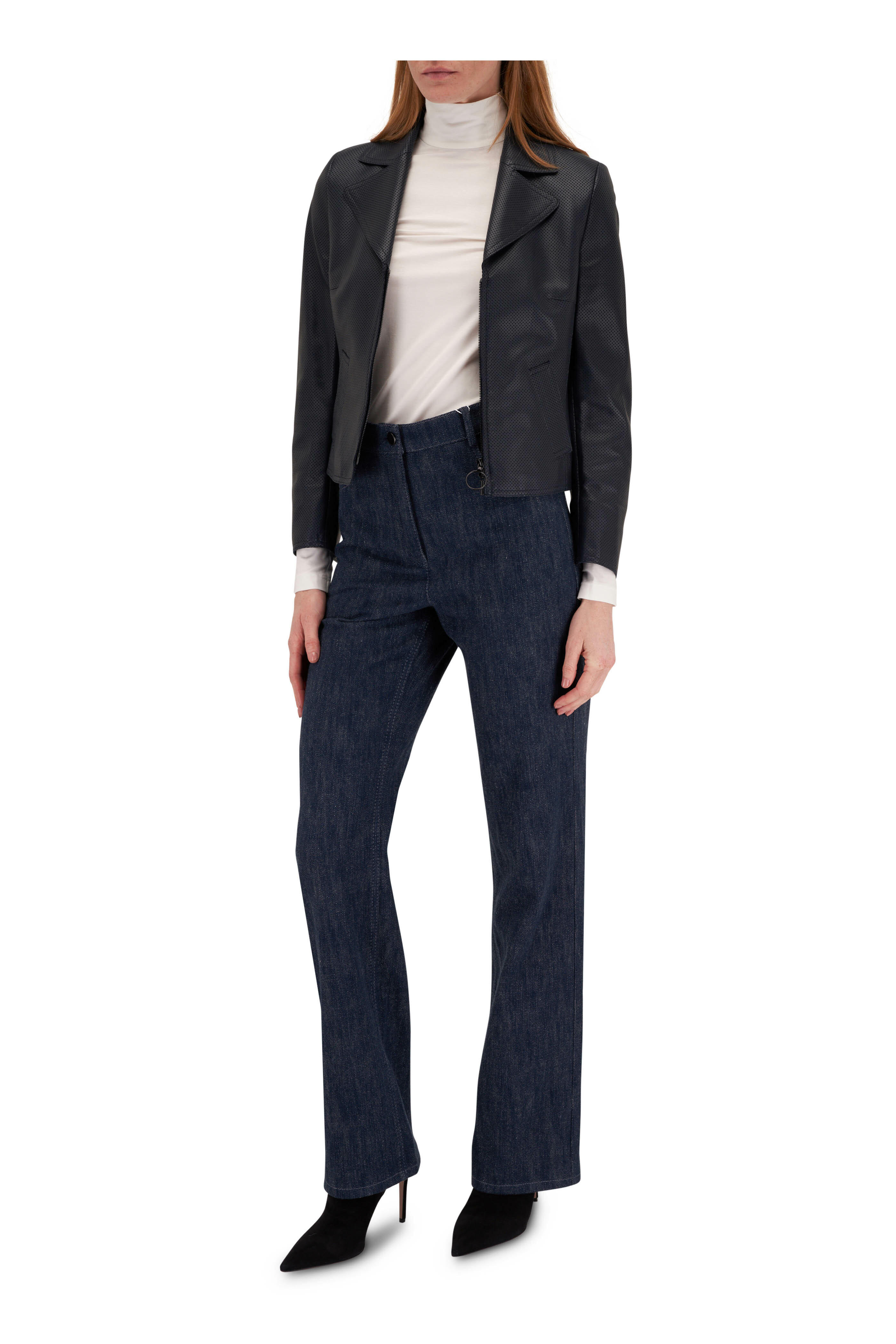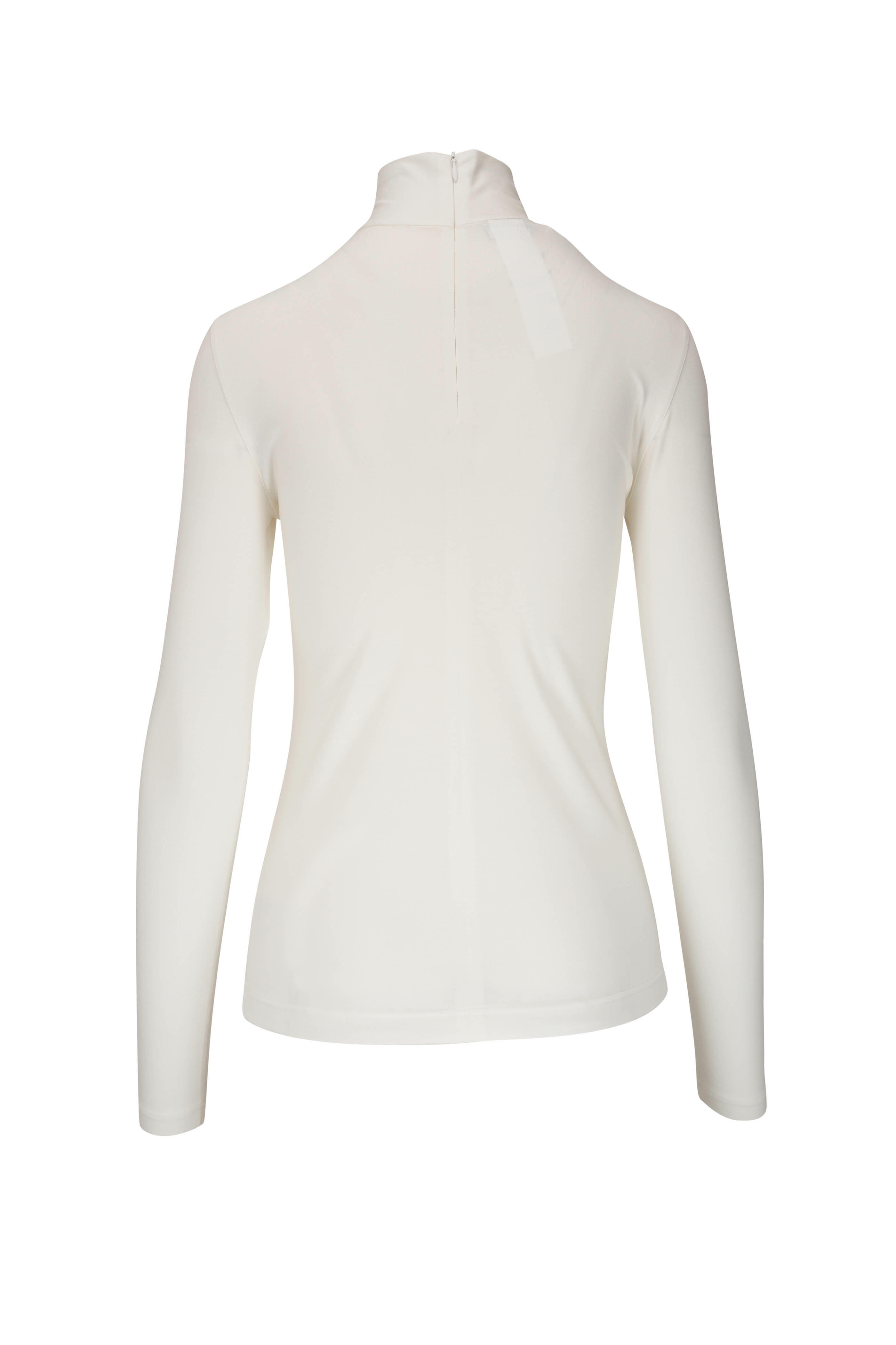 Turtleneck. Concealed back-zip closure. Circle patch at hem. Imported. 95% modal, 5% elastane. Dry clean.