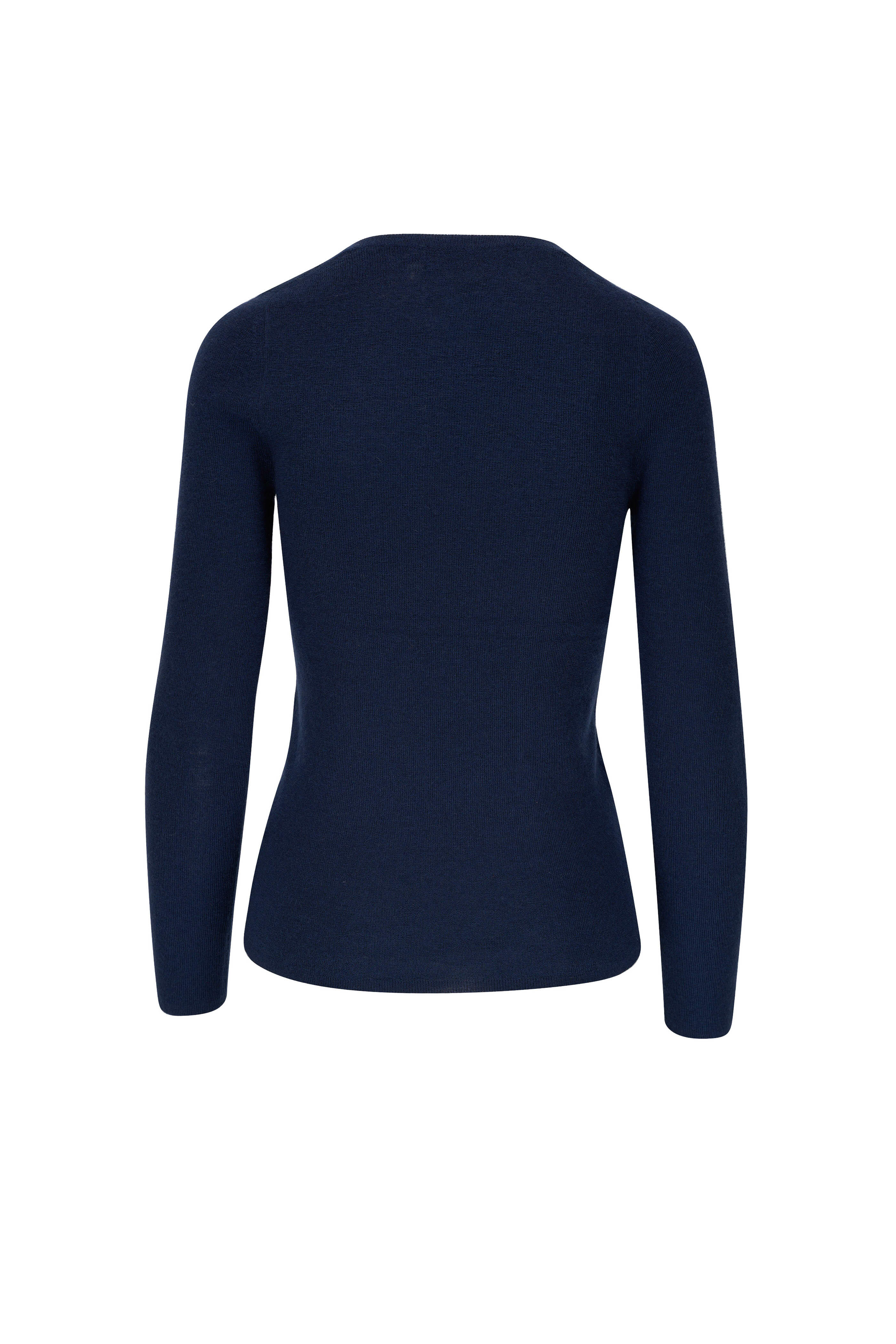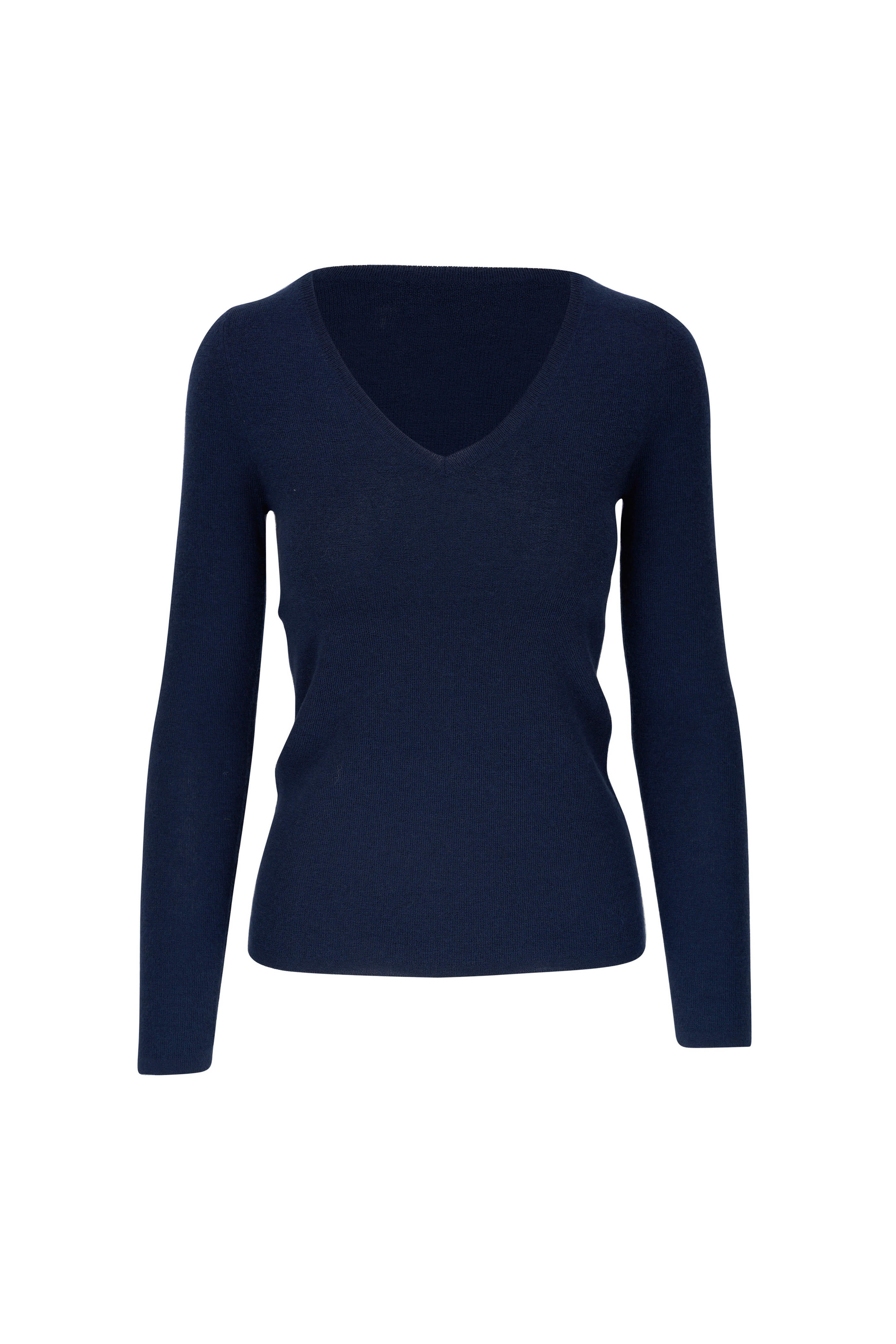 V-neckline. Ribbed trims. Made in the USA. 100% cashmere. Dry clean.
