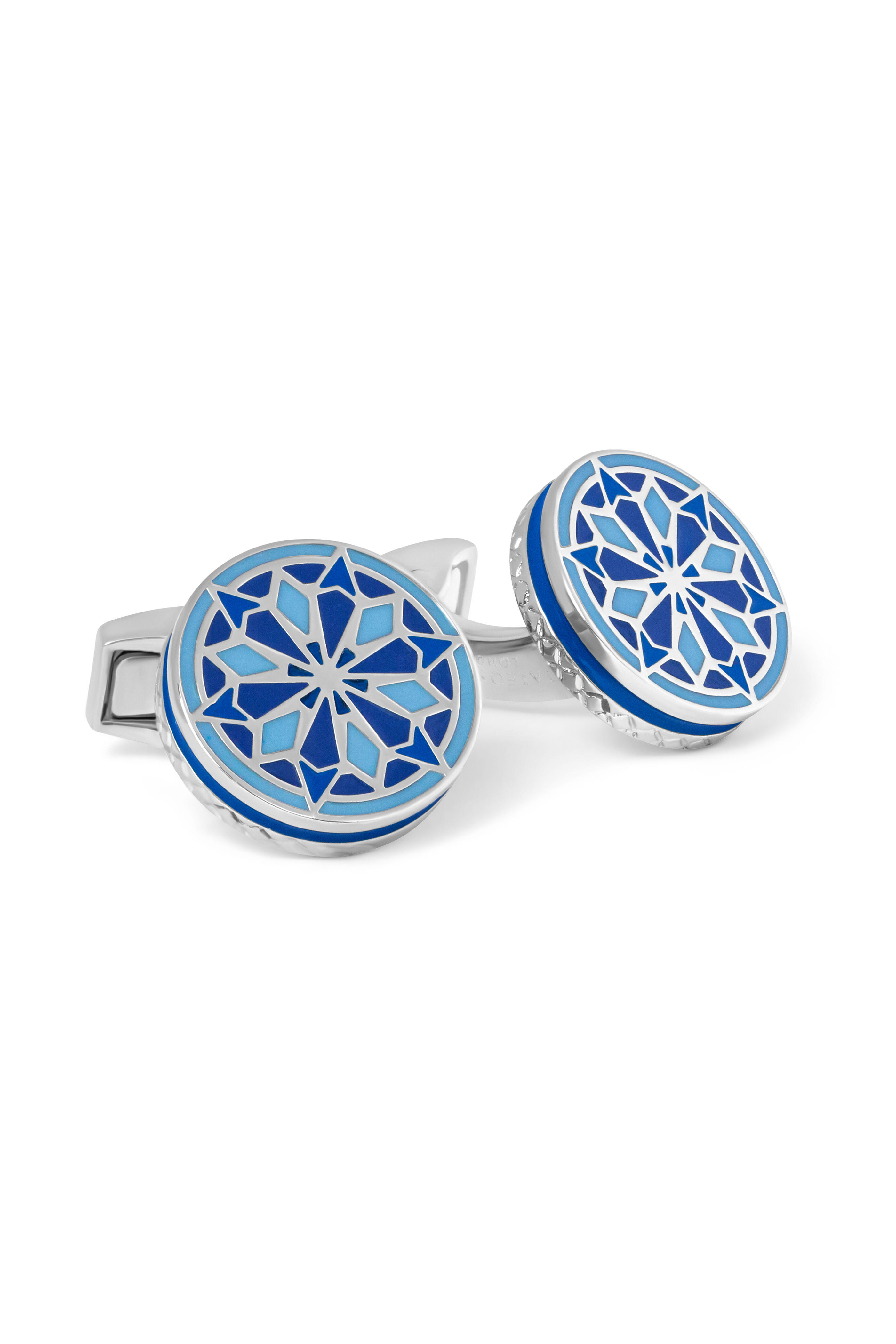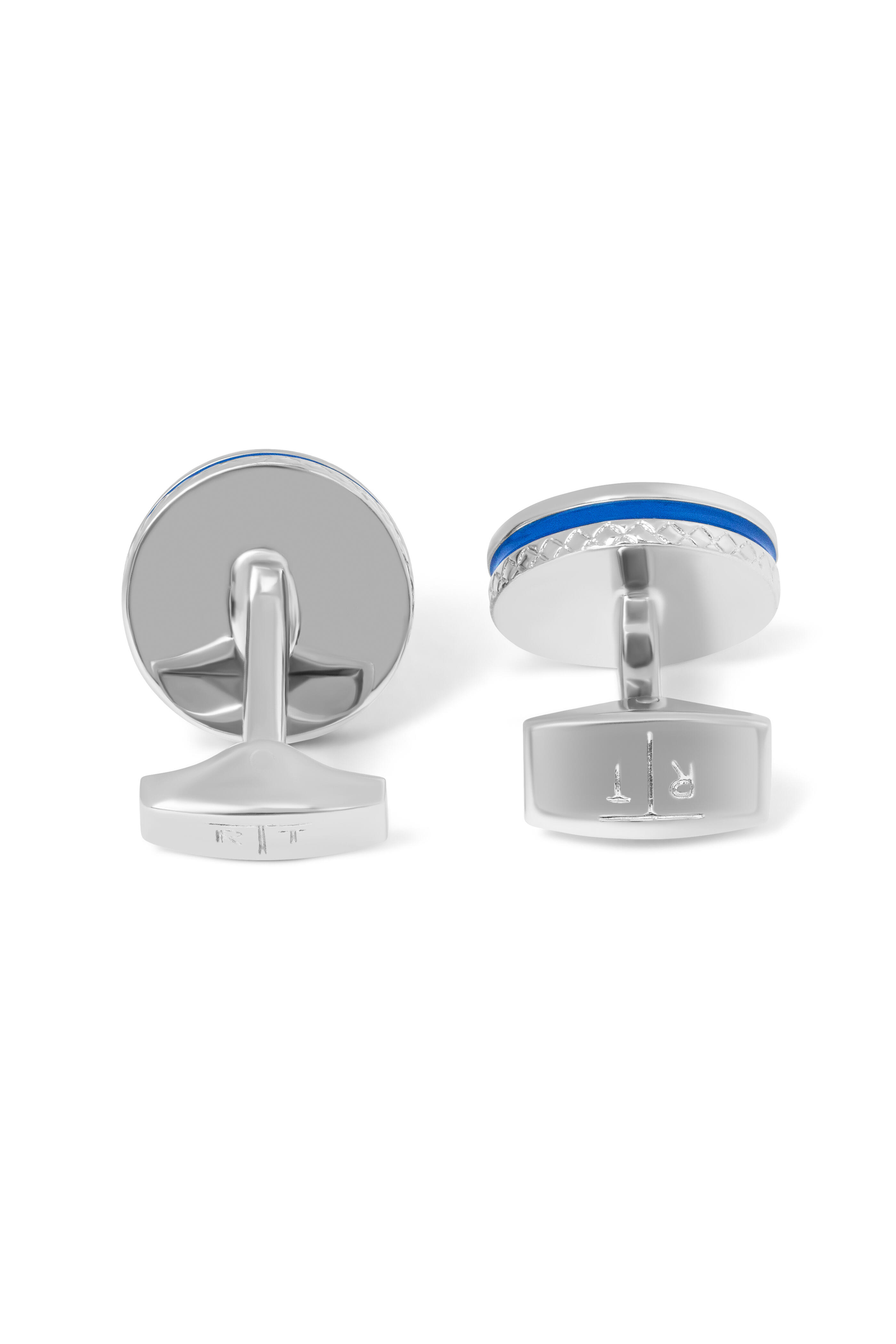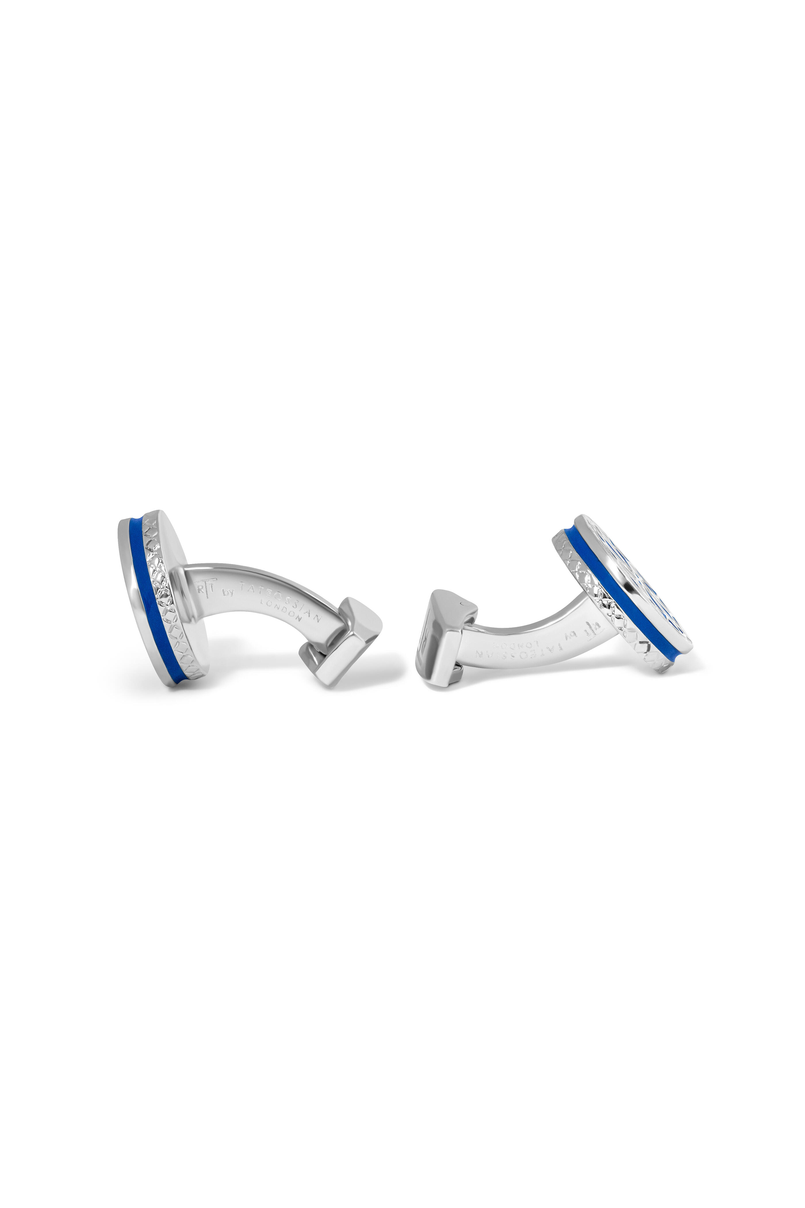 Hand-Painted Blue Enamel. Brushed Stainless Steel. Palladium Finish.