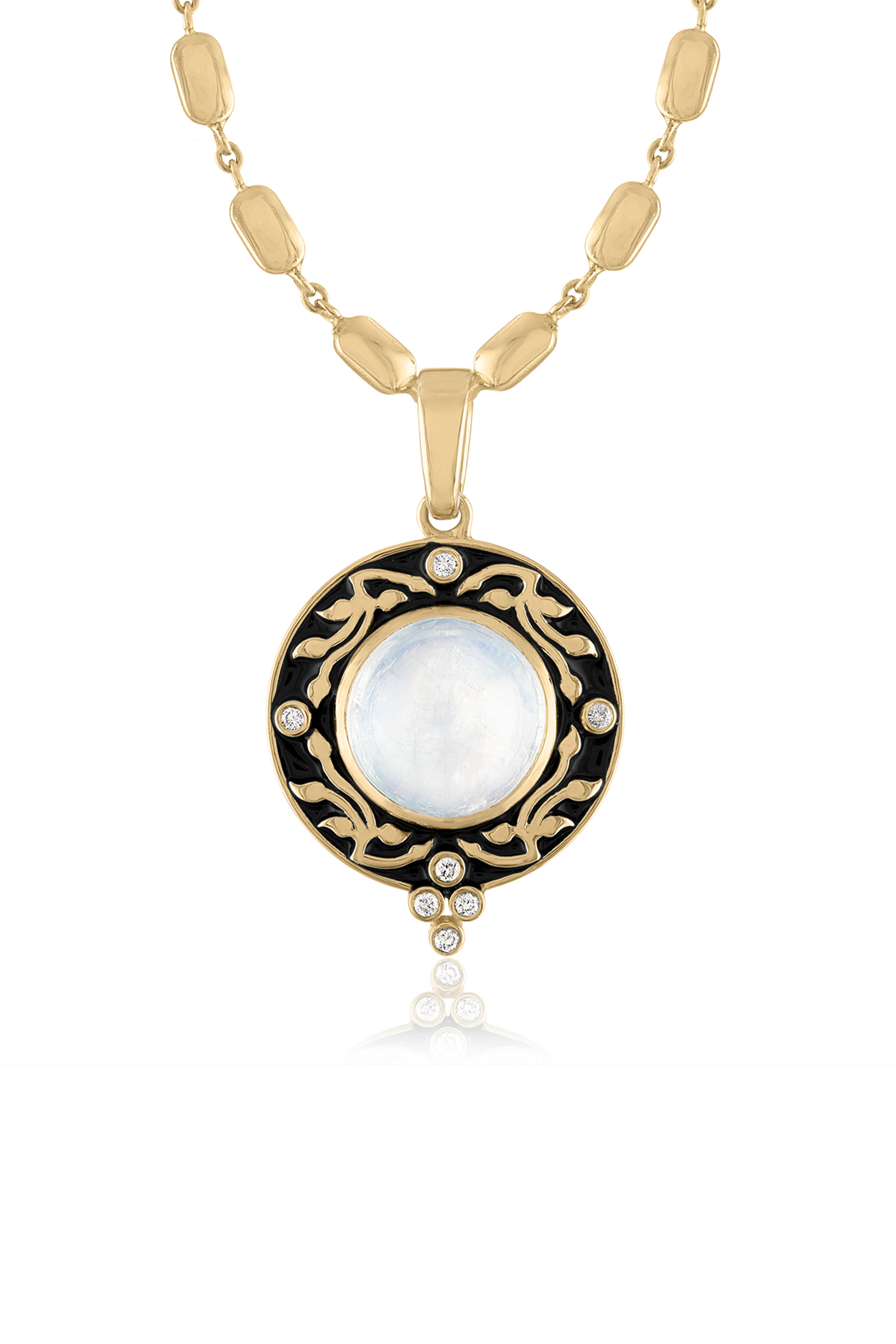 Modern Renaissance Collection. 14K Yellow Gold: 4.35g. Diamonds: 0.06CT. Moonstone: 5.07CT. Black Enamel. Measures: 29mm x 18mm; 18" Long.