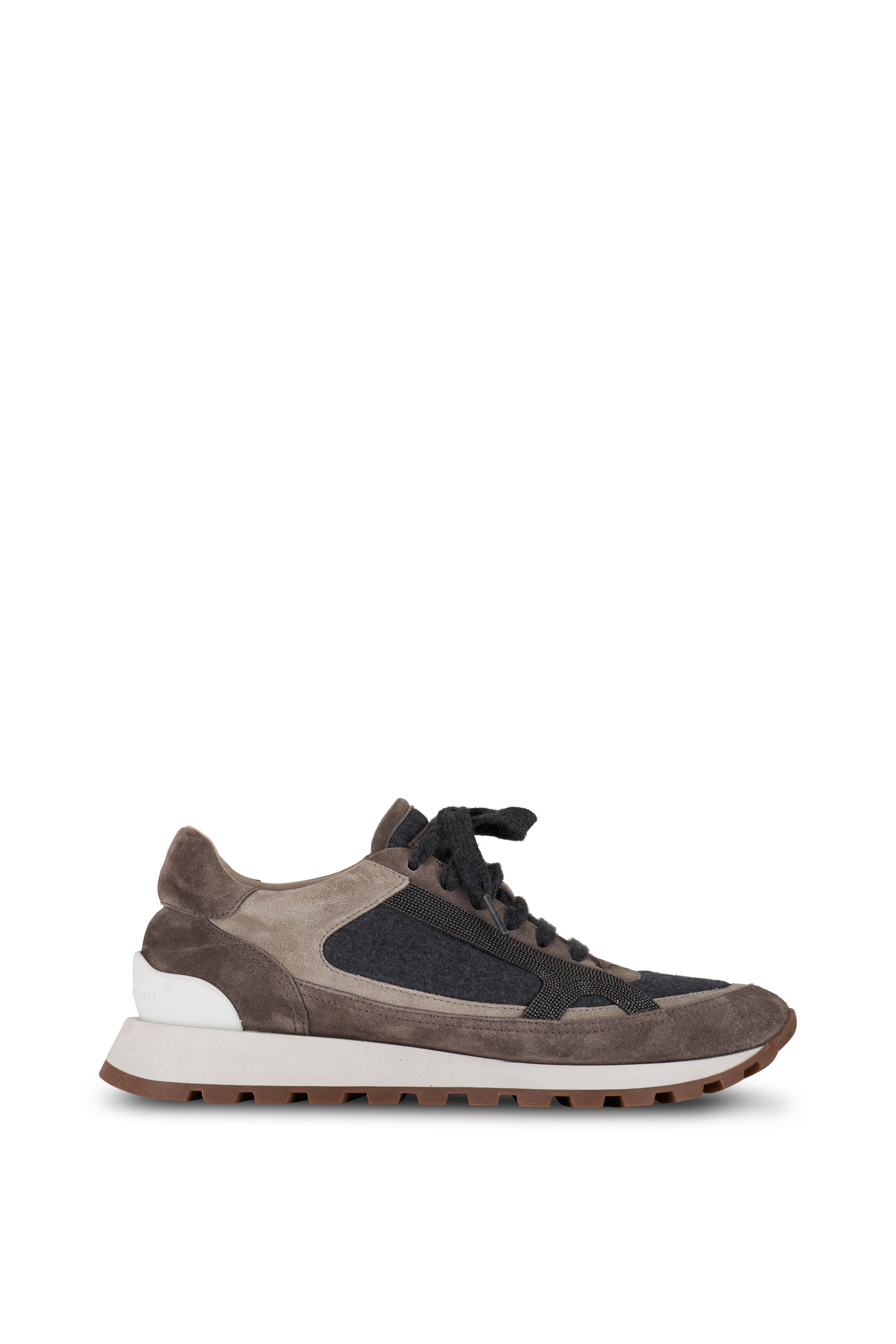 Suede/cashmere upper. Tapered toe. Lace up closure. Leather lining and insole. Monili detailing at side and vamp. Rubber sole. Made in Italy.