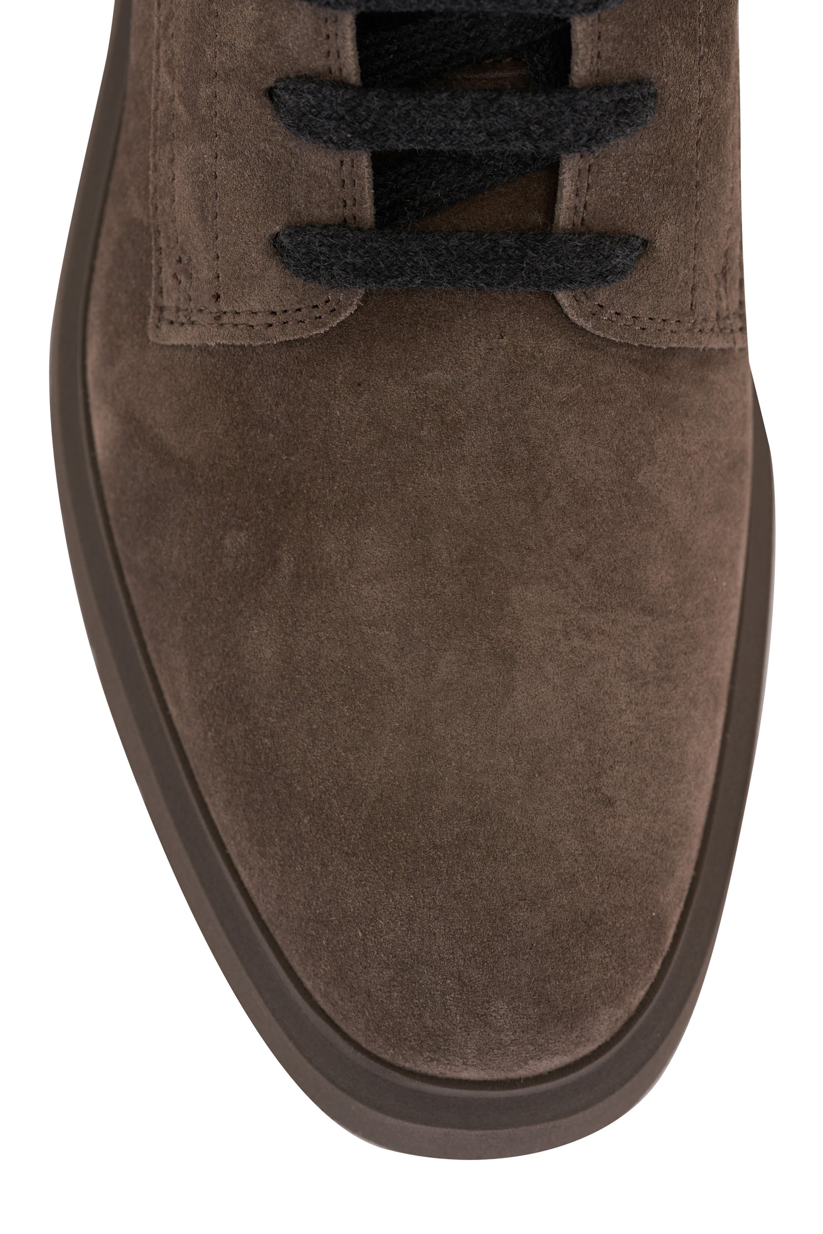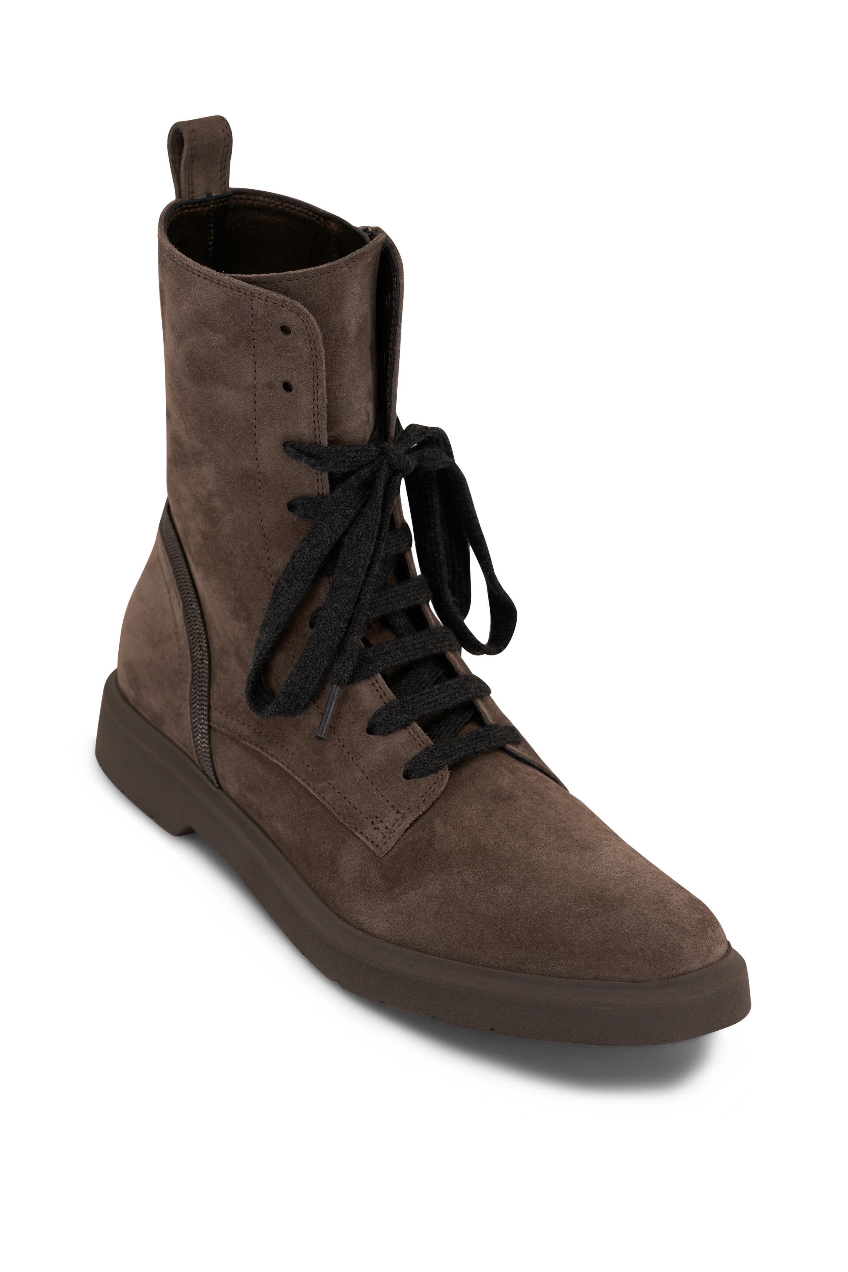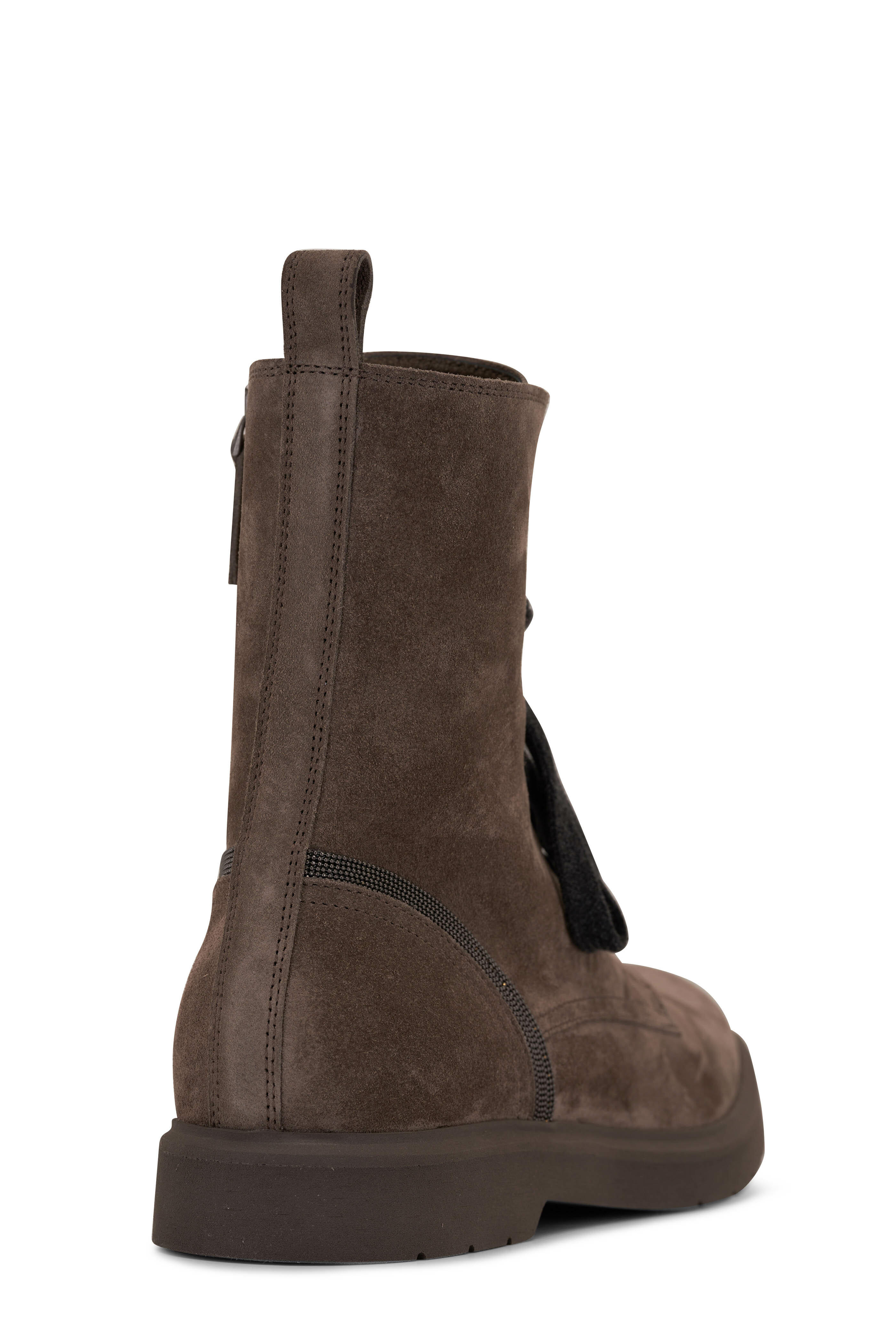 Suede upper. Round toe. Lace-up closure. Side zip. Leather lining and insole. Rubber sole. Signature monili details. Made in Italy.