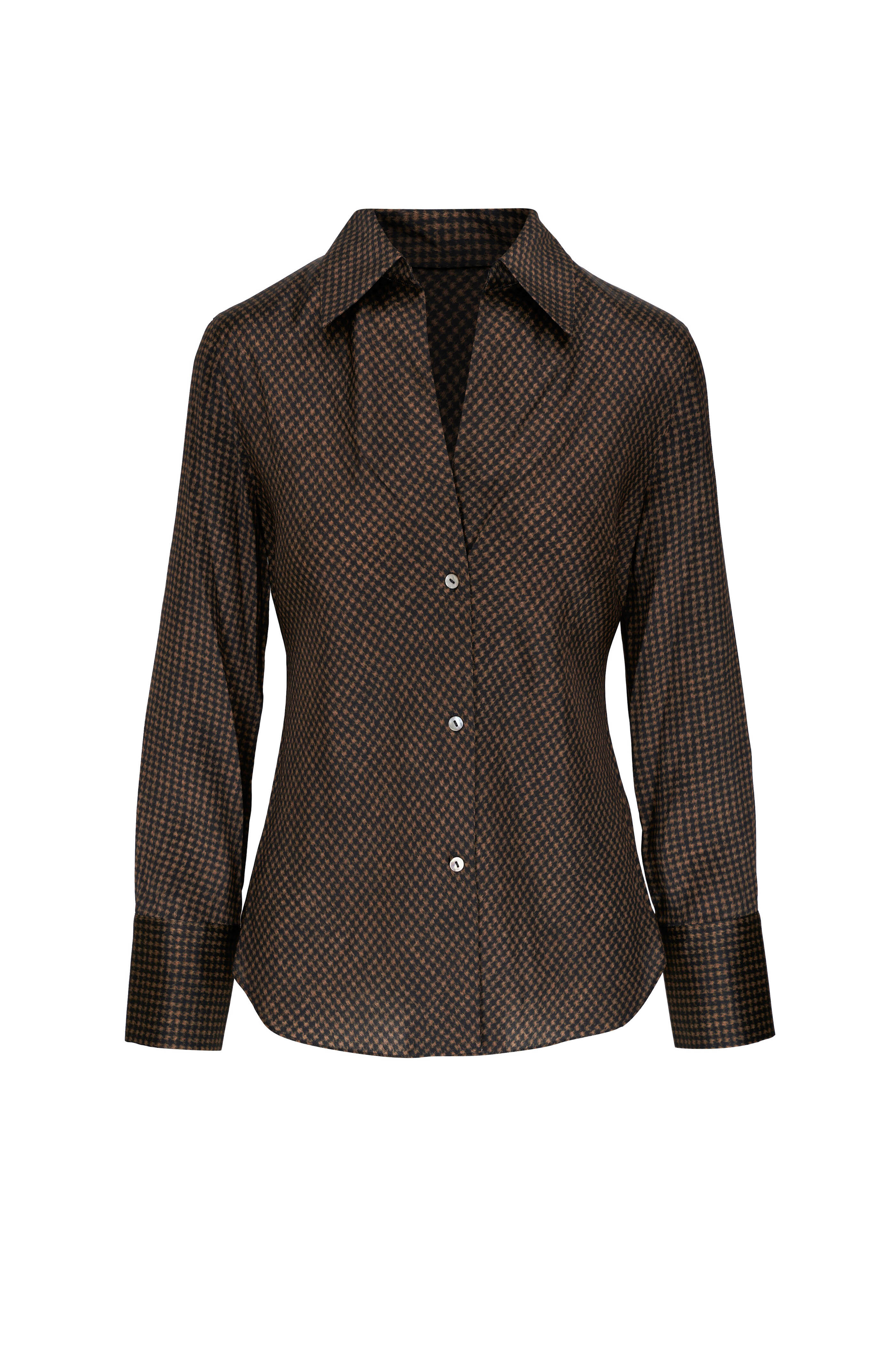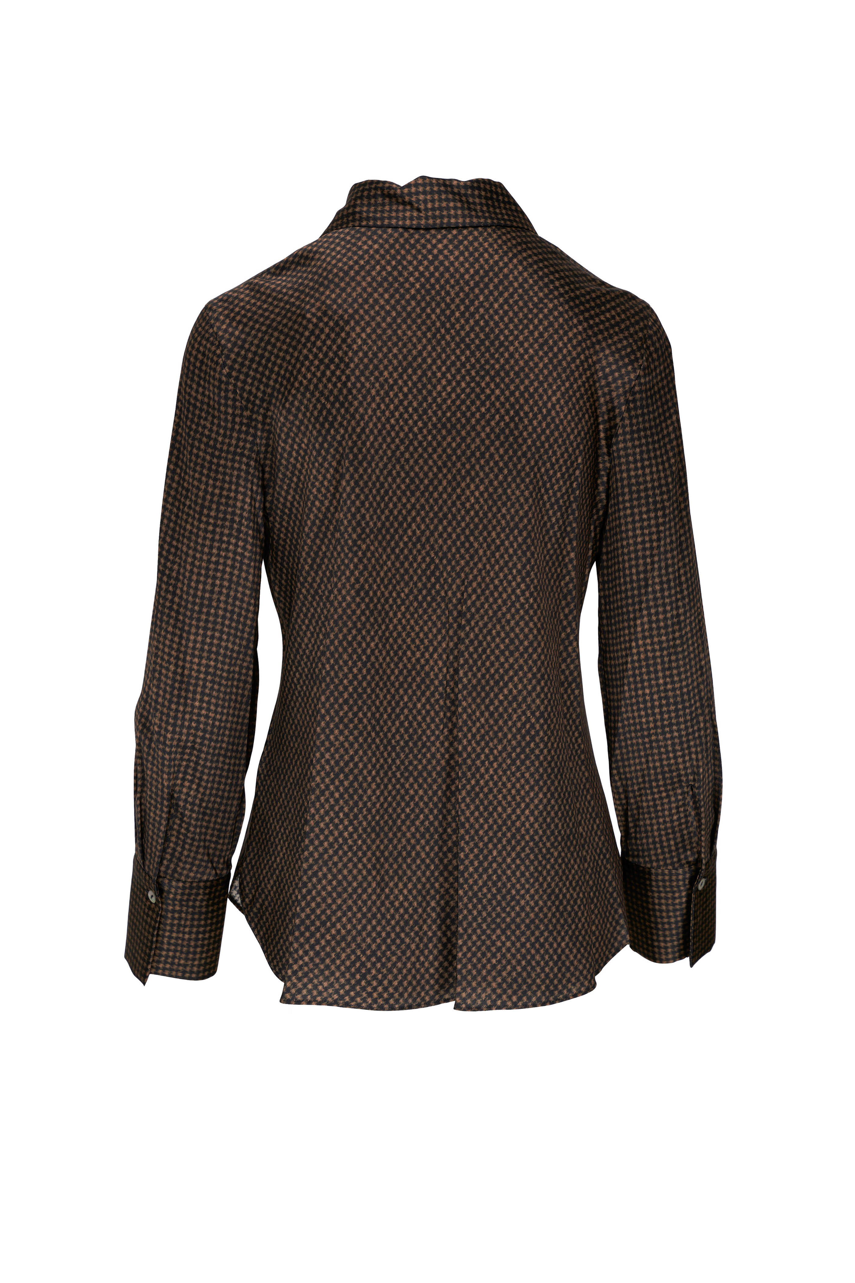 Houndstooth Silk Bias Long-Sleeve Blouse
