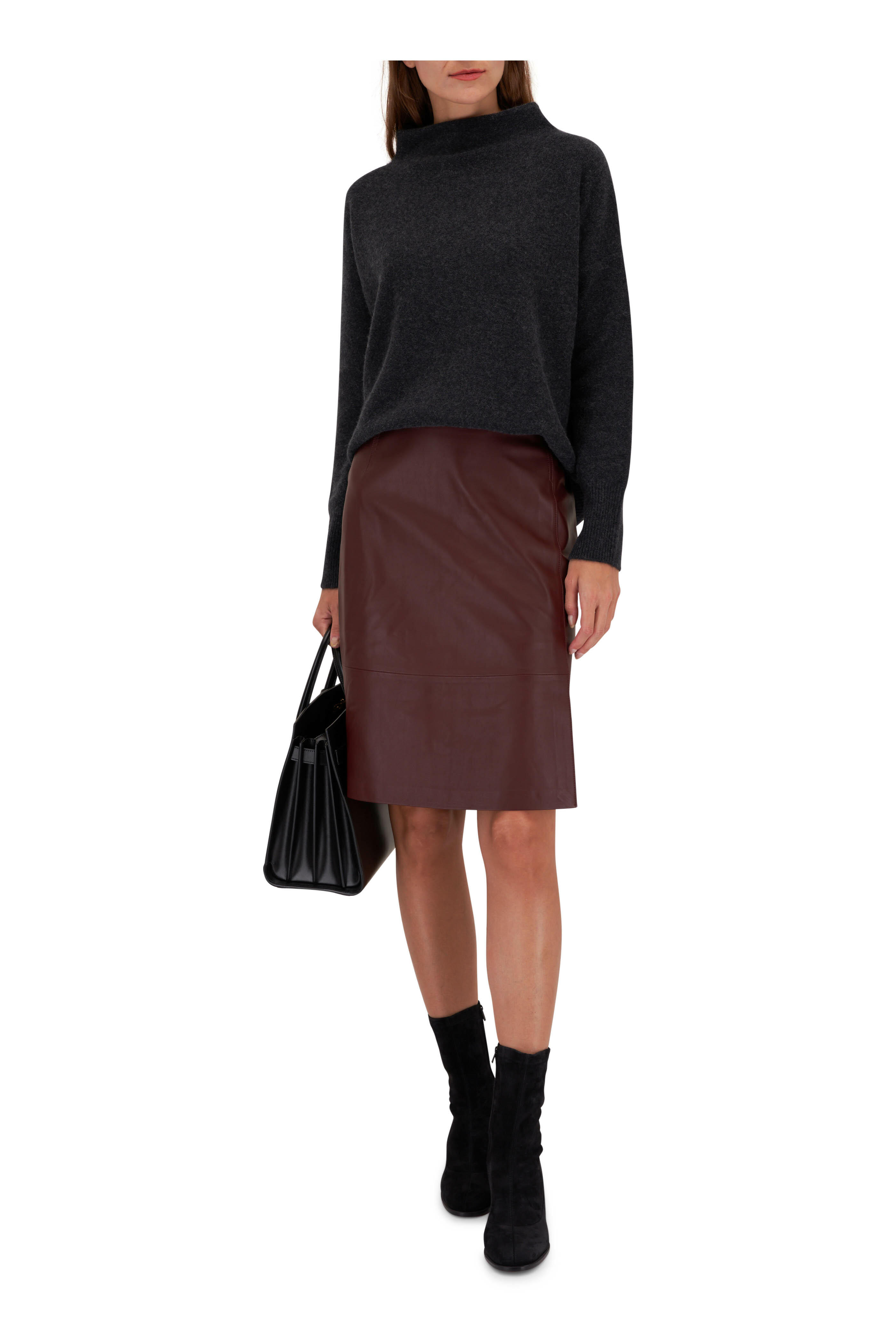 Funnel neckline. Ribbed trims. Imported. Oversized fit. 25" shoulder to hem. 100% cashmere. Hand wash.