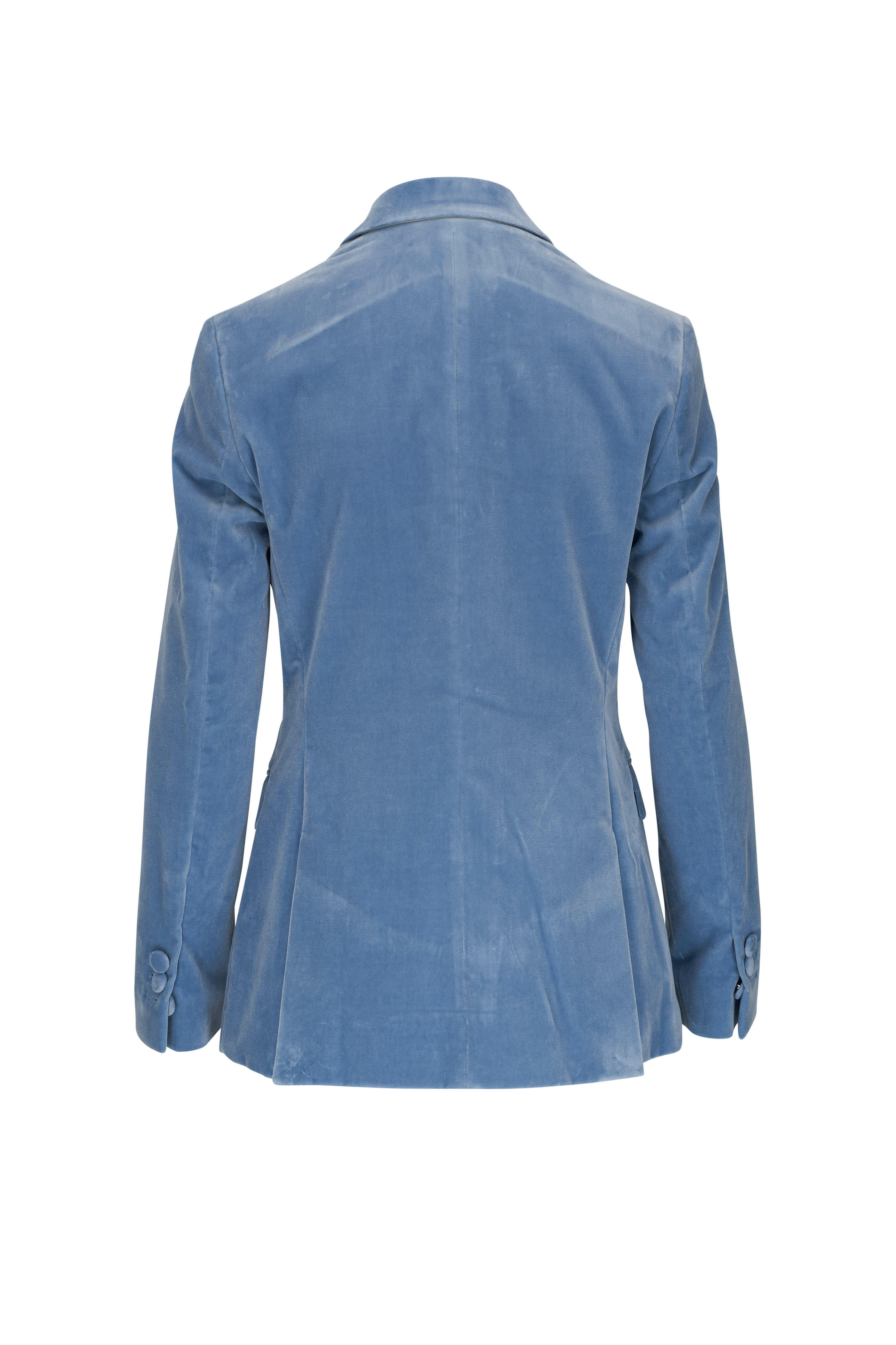 Notched lapels. Single button front closure. Chest welt pocket; lower flap pockets. Double button square cuffs; covered velvet buttons. Double vent. Imported. Tailored fit. 98% cotton, 2% elastance; fully lined. Dry clean.