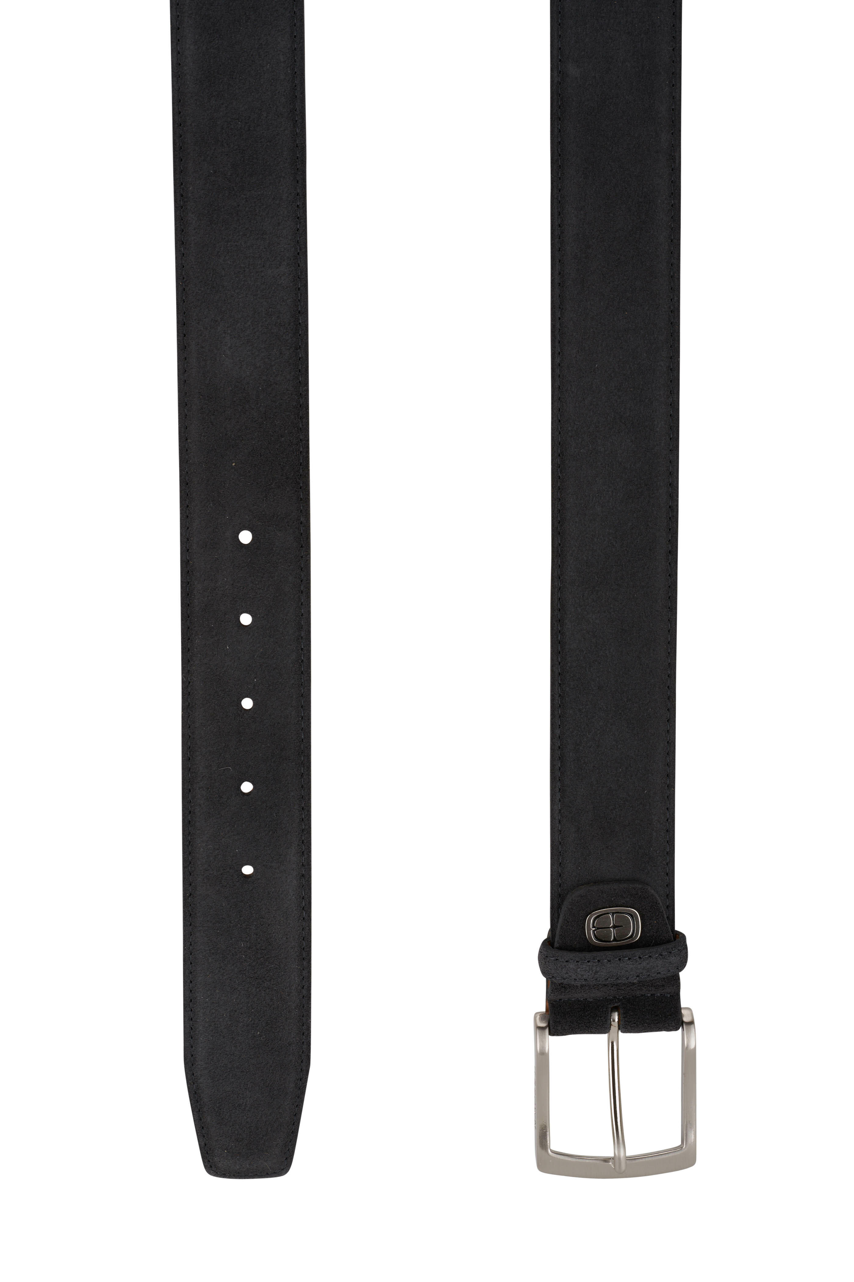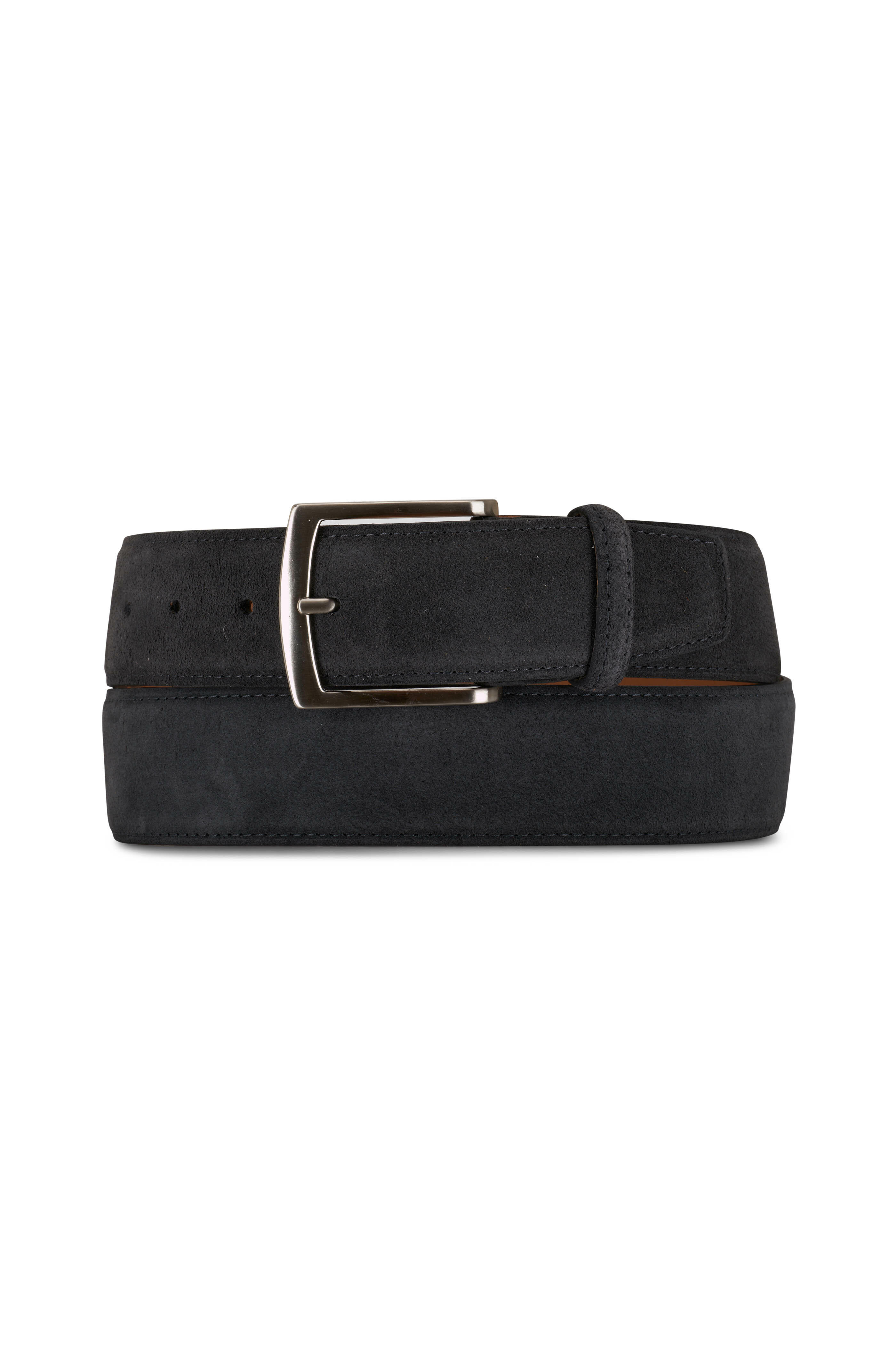 Suede. Silver-toned square buckle. Single loop keeper. Tapered tip. Made in Italy. Width: 1 ½".