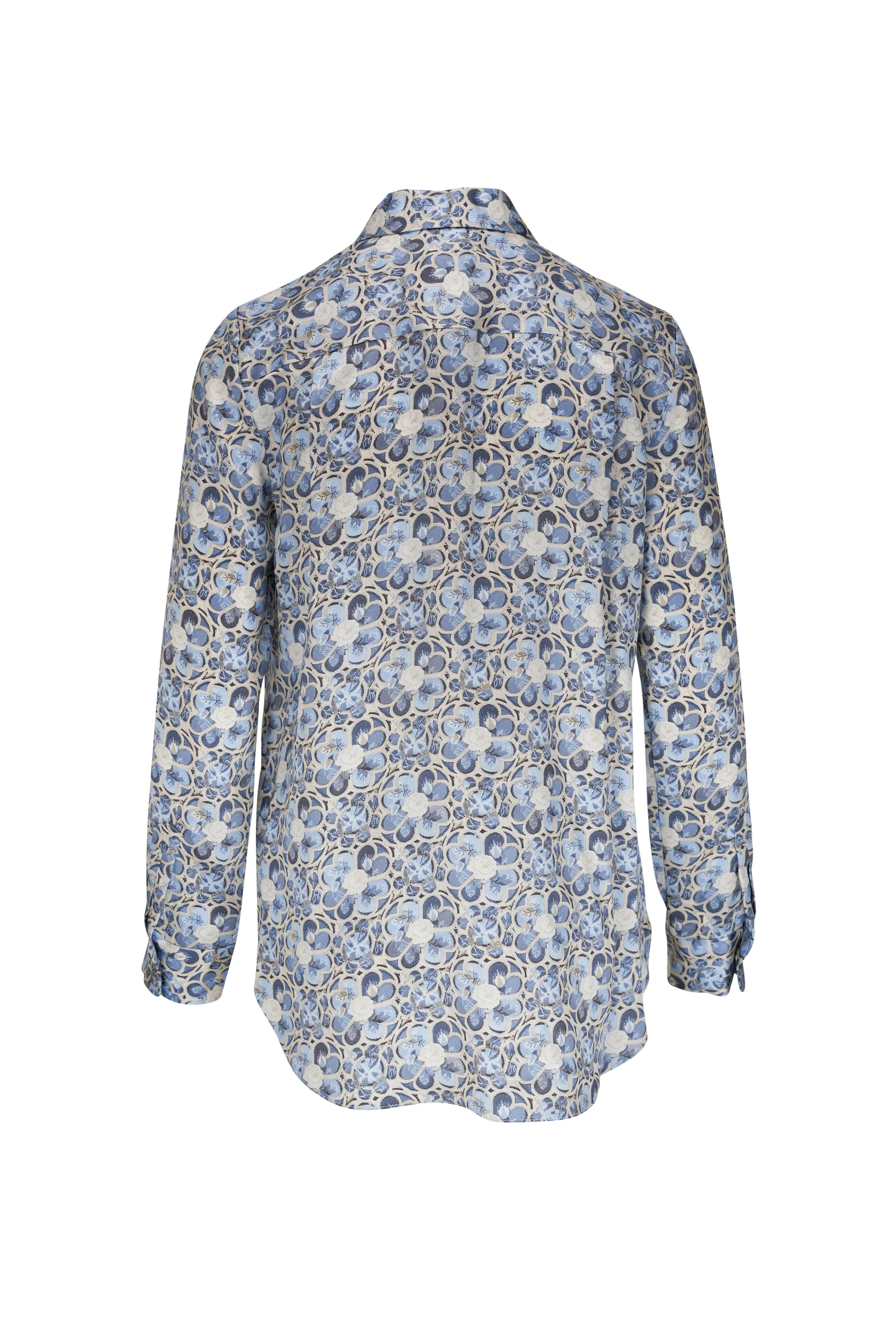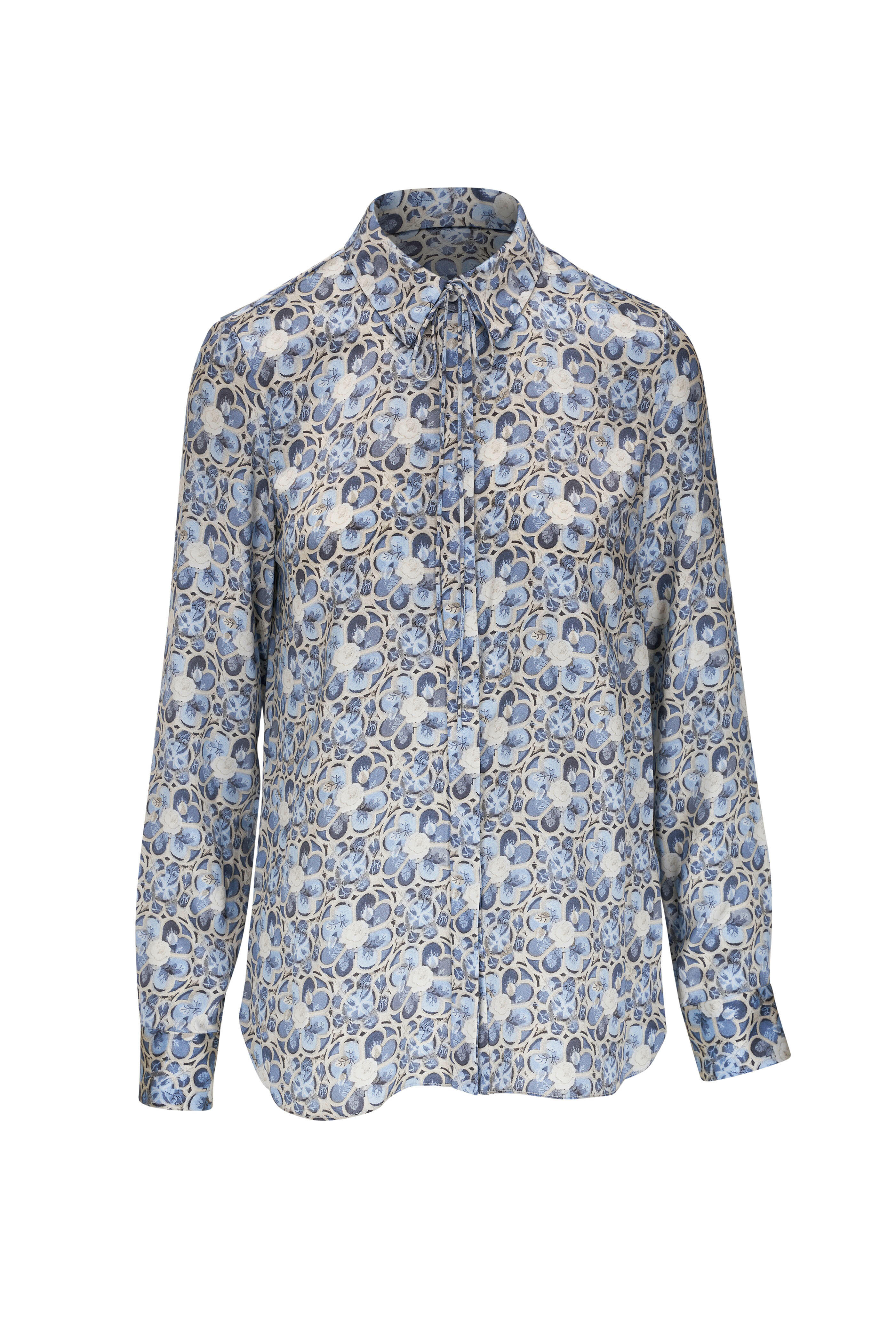 Blue Floral Printed Silk Charmeuse Bow Blouse