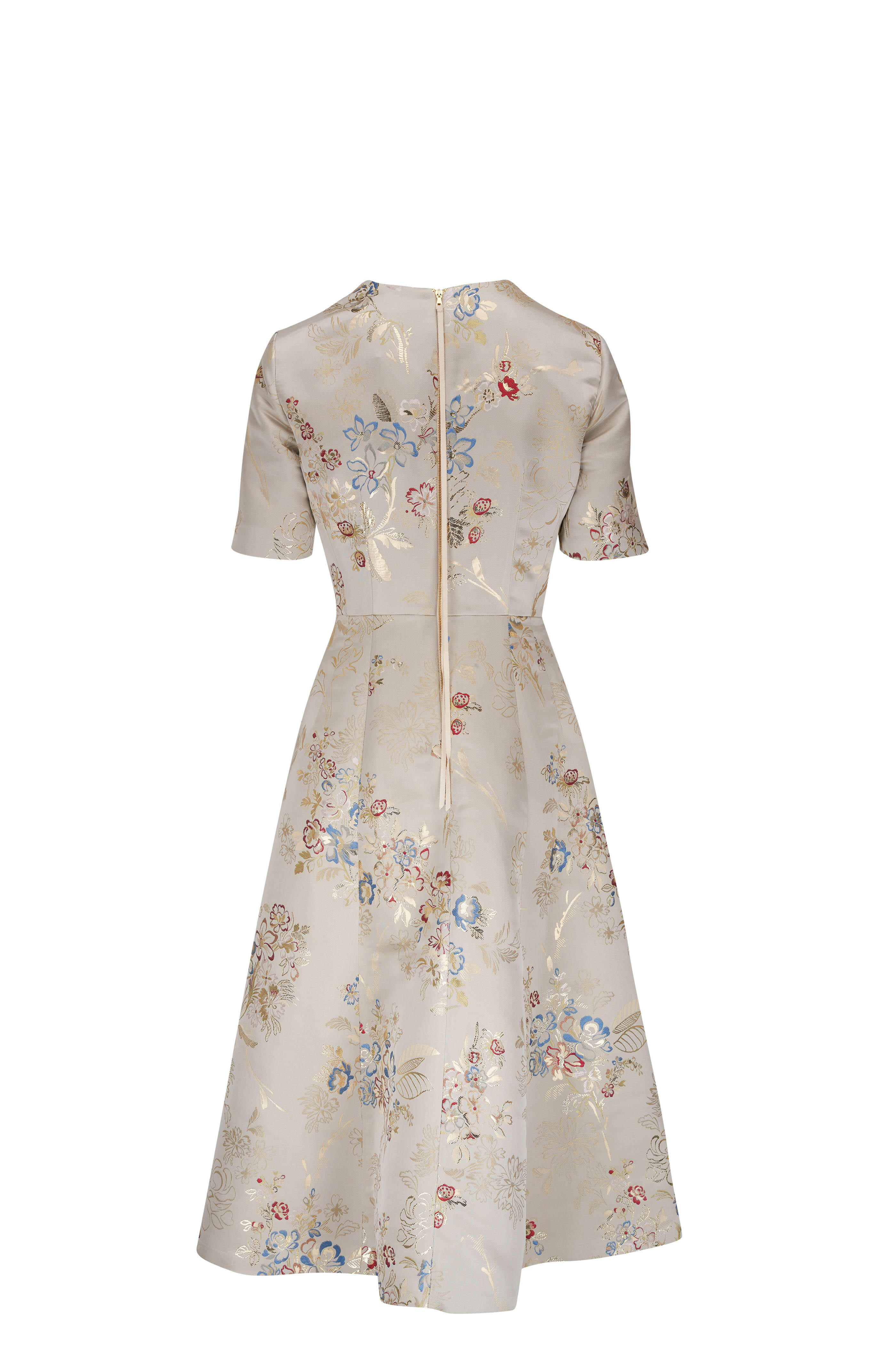 Crew neckline. Concealed back zip. Concealed lower waist side pockets. Straight hem. Made in the USA. Fit-&-flare silhouette. 51% acetate, 26% silk, 15% polyester, 8% metallic polyester; Lining: 100% polyester. Dry clean.