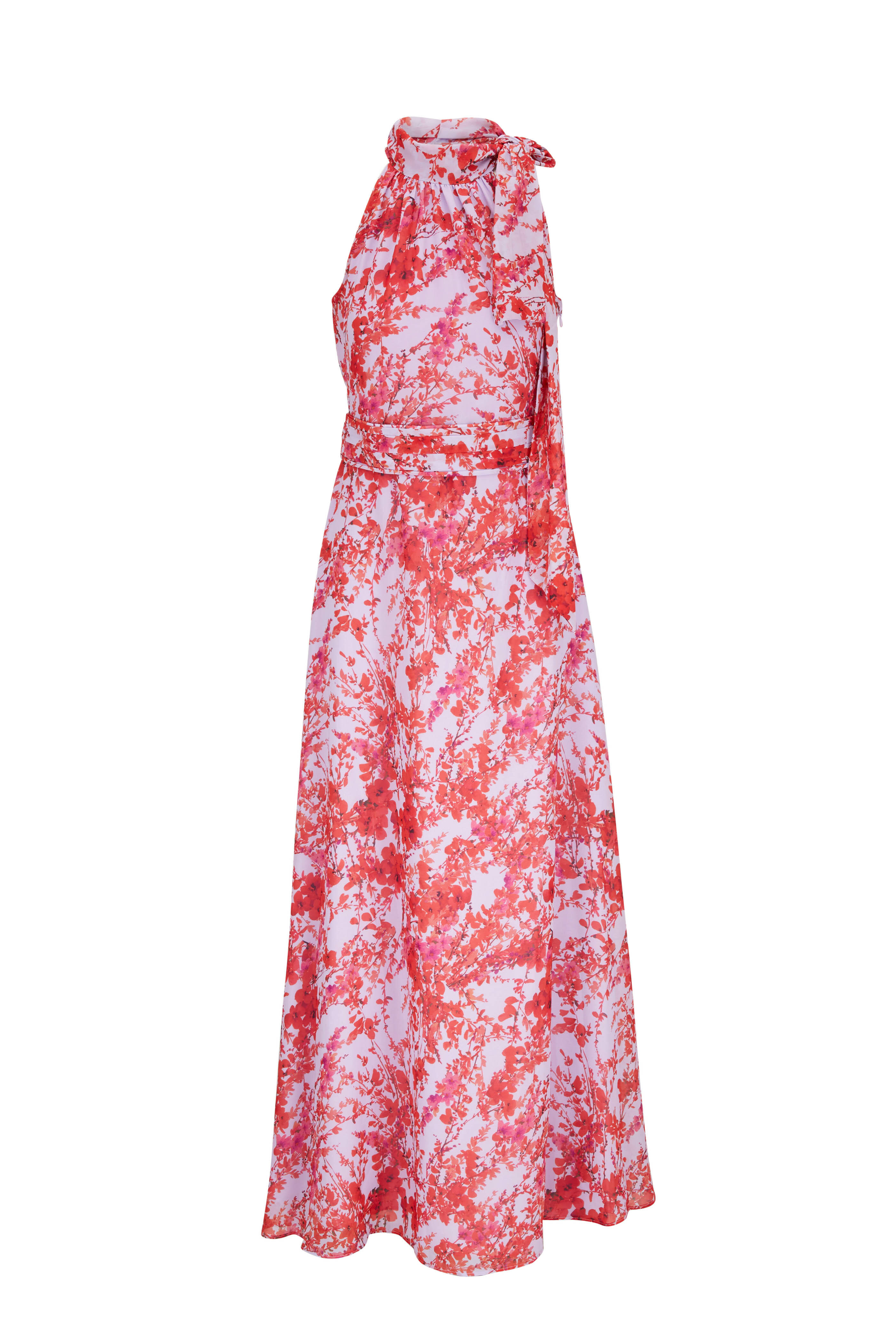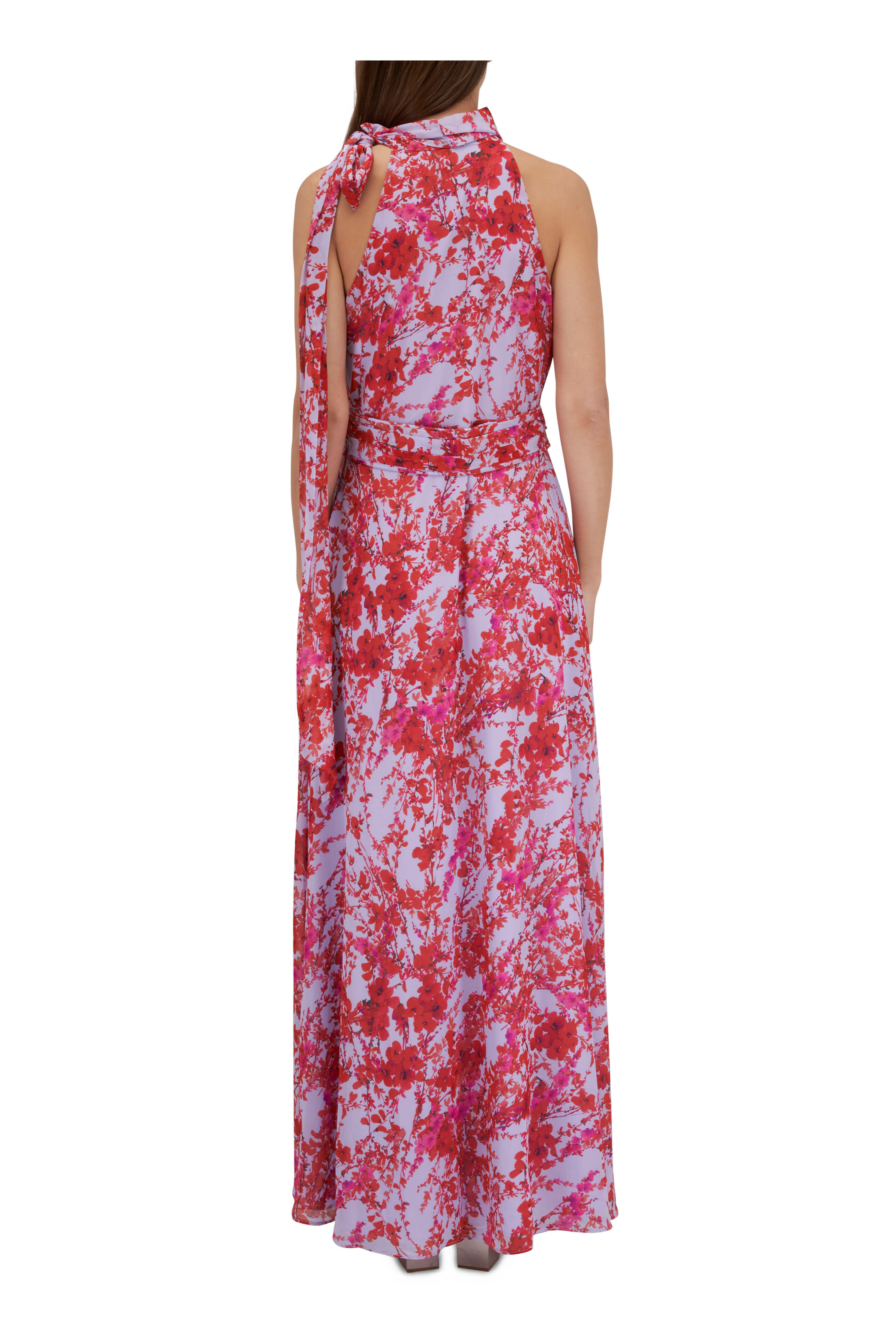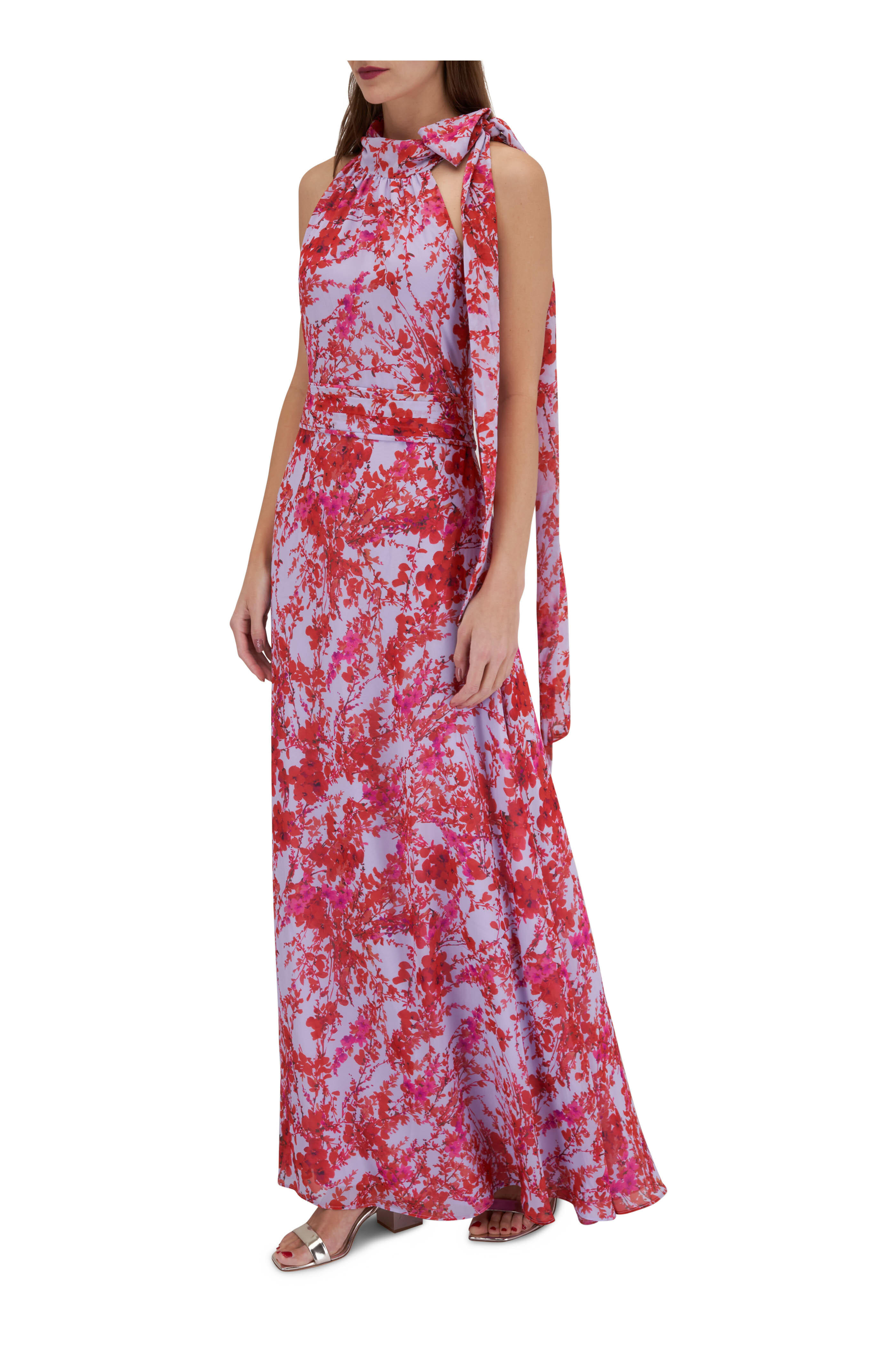 High twist neckline with self-tie bow. Concealed side zip. Belted waistband. Imported. Color: Amaranths Spray. 62" length. 100% polyester. Dry clean.