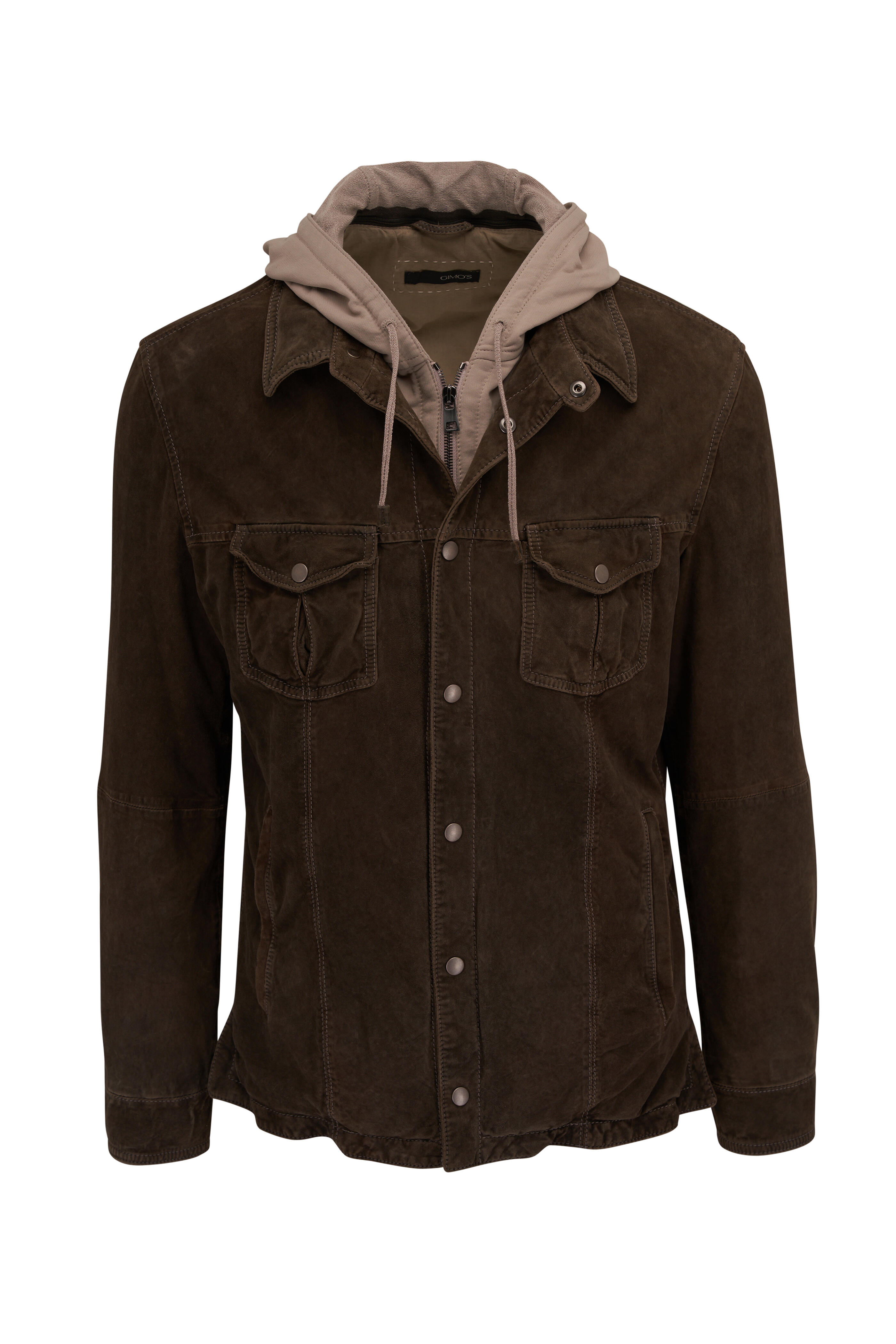 Specialist clean. Spread collar. Front snap button placket. Detachable cotton drawcord hood; two-way front zip. Single button snap cuffs. Chest snap pockets; lower snap pockets; interior zip pockets. Side slit hem. Made in Italy. 27" shoulder to hem. 100% goat suede; fabric 2: 100% cotton; fully lined.