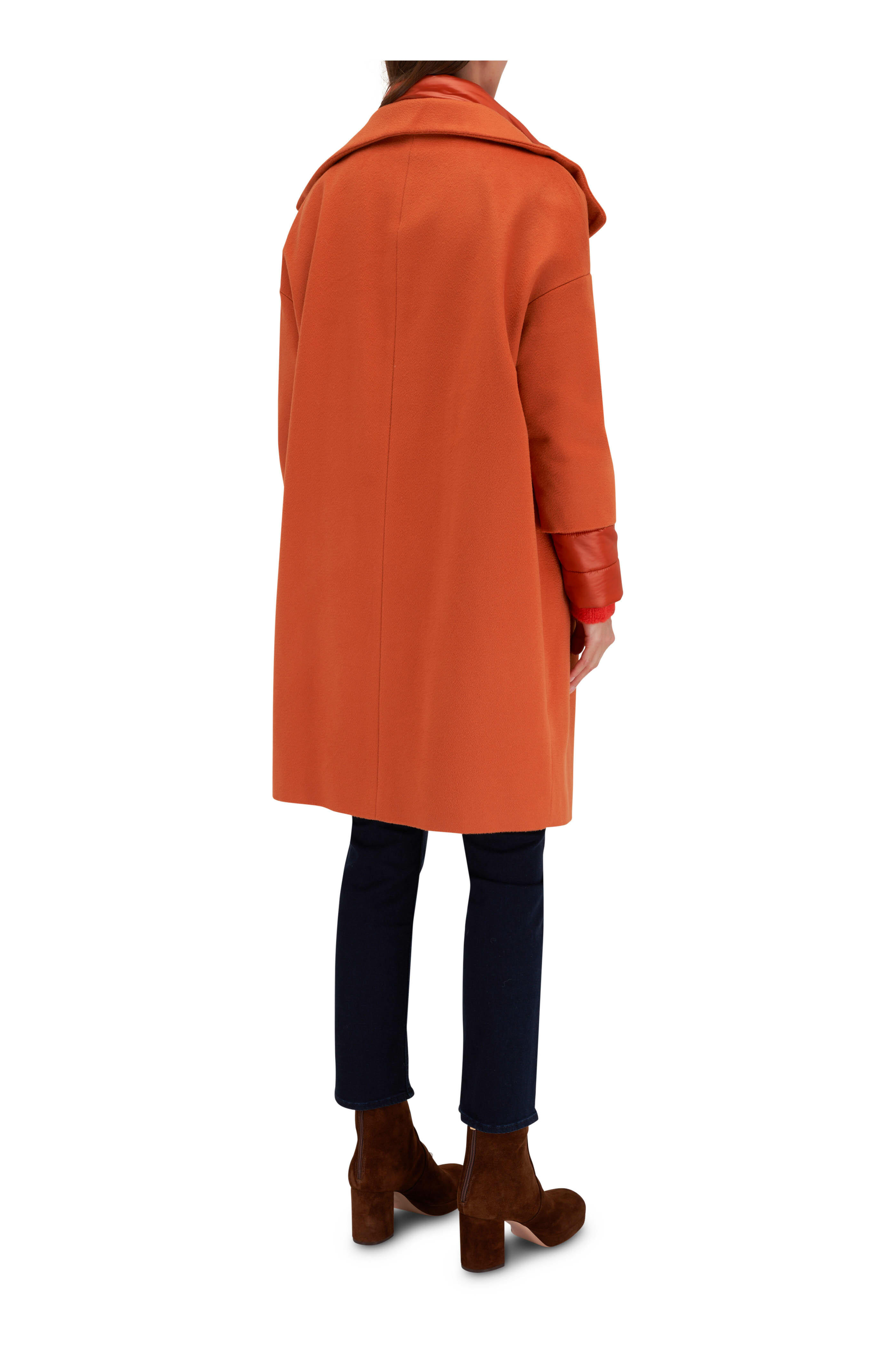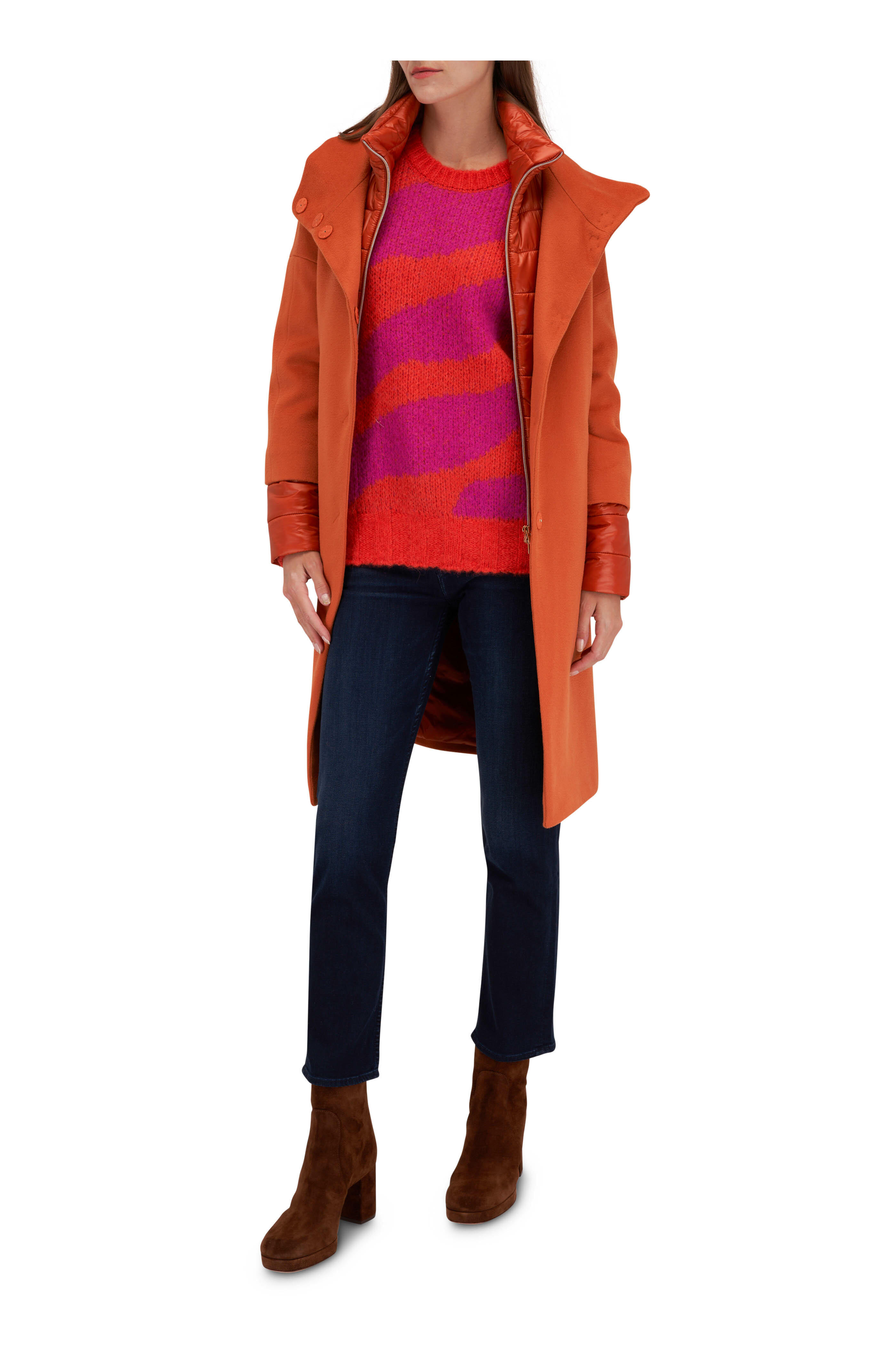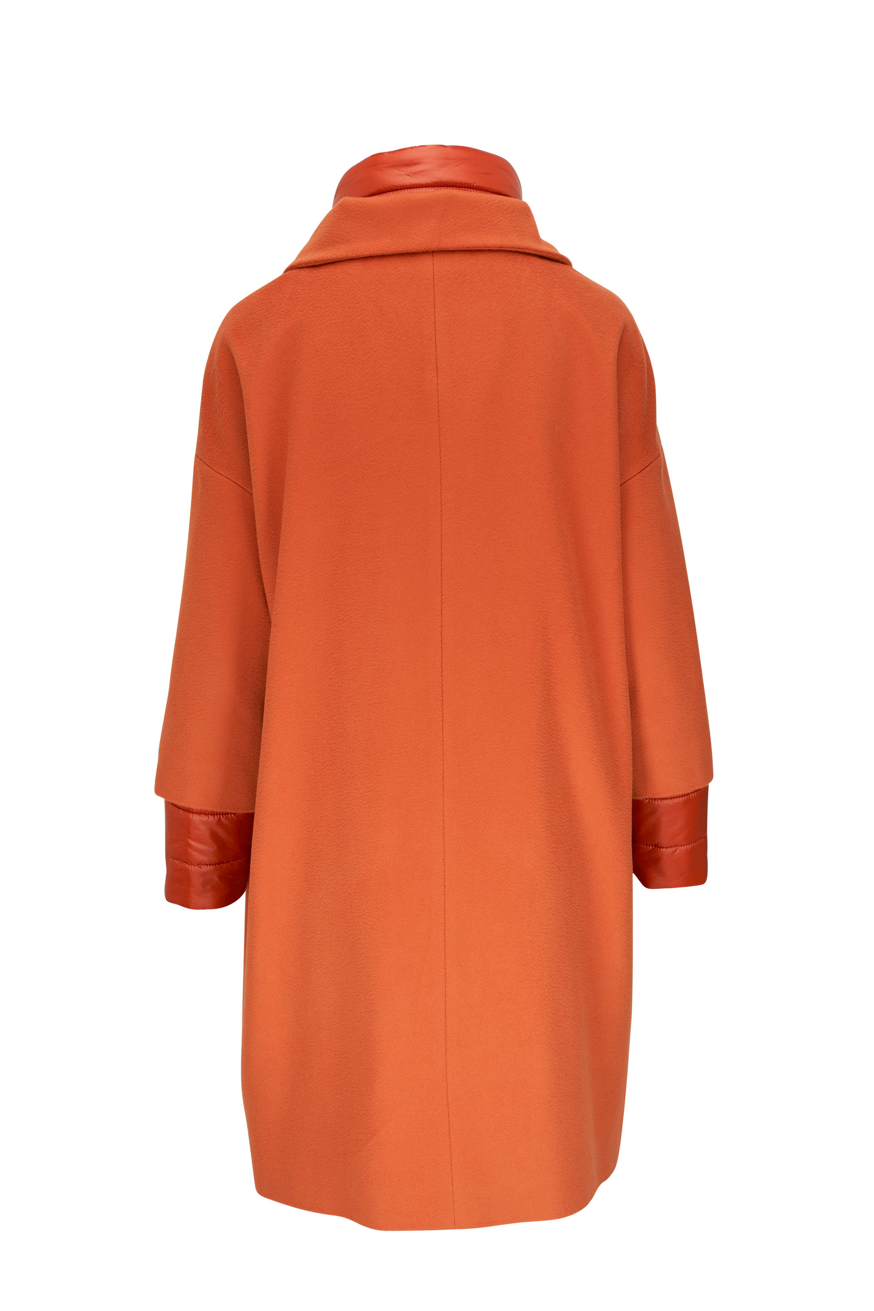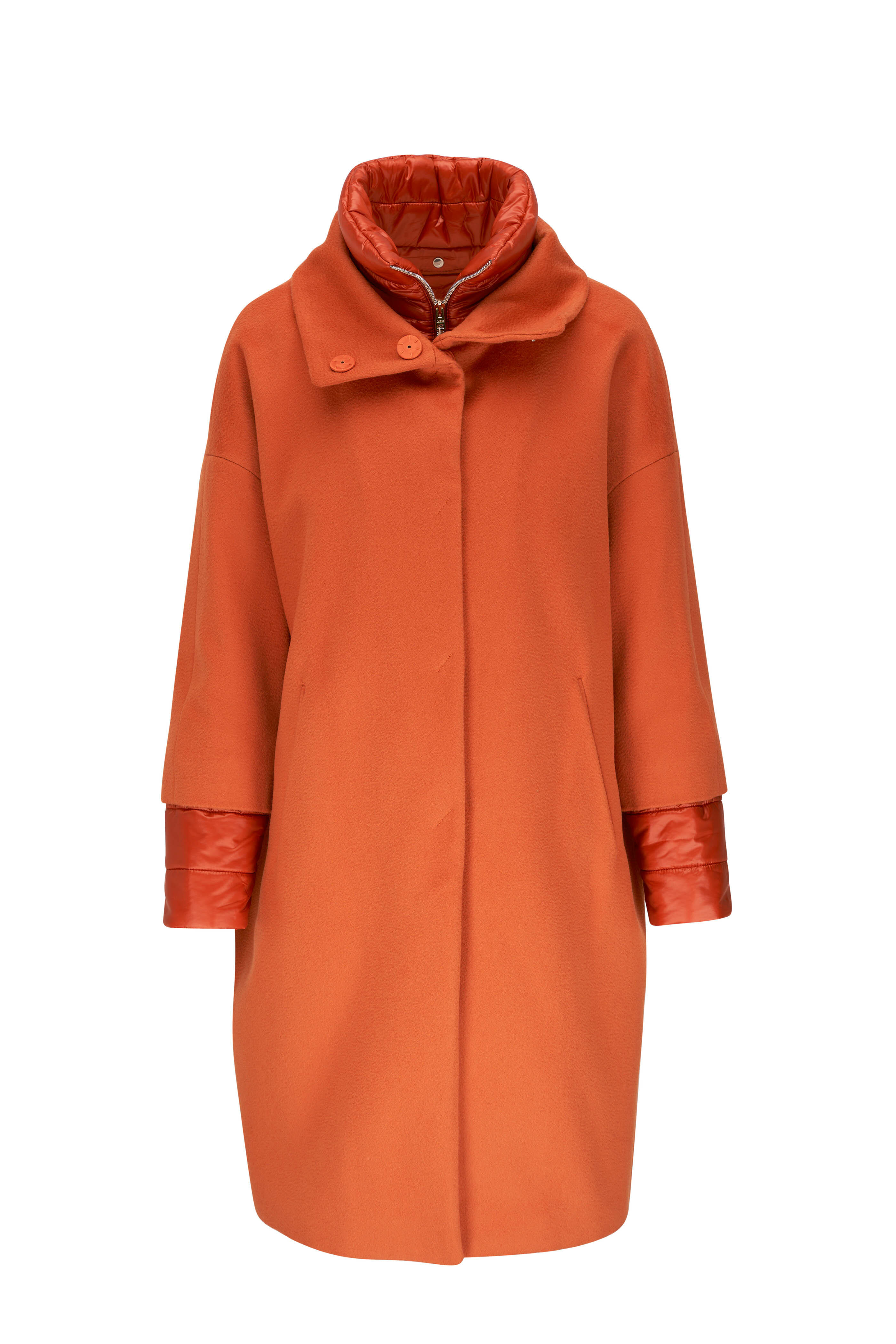 Stand collar. Two-way front zip. Detachable nylon wind guard; two-way front zip. Three-quarter sleeves; detachable nylon extended cuffs. Lower slip pockets. Imported. 38" shoulder to hem. 100% virgin wool; fabric 2: 100% nylon; fill: 90% goose down, 10% goose feather; fully lined. Dry clean.