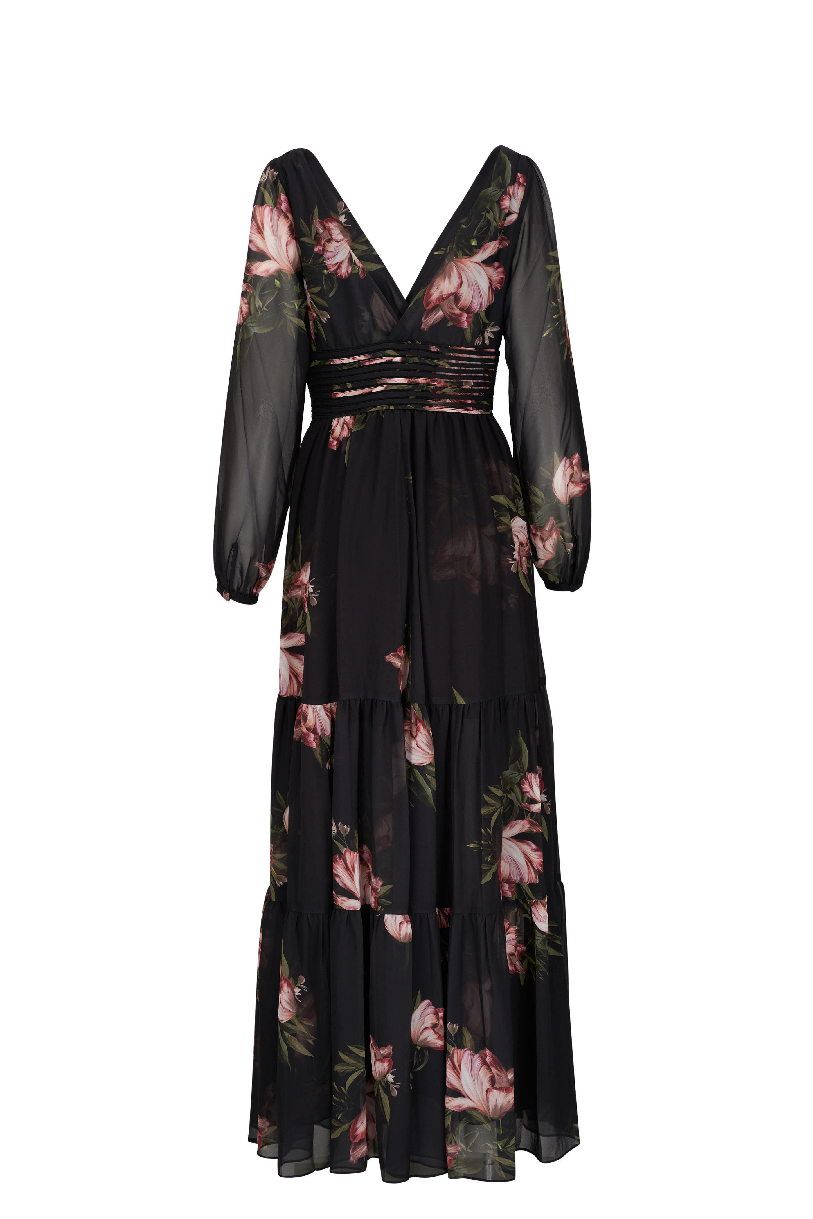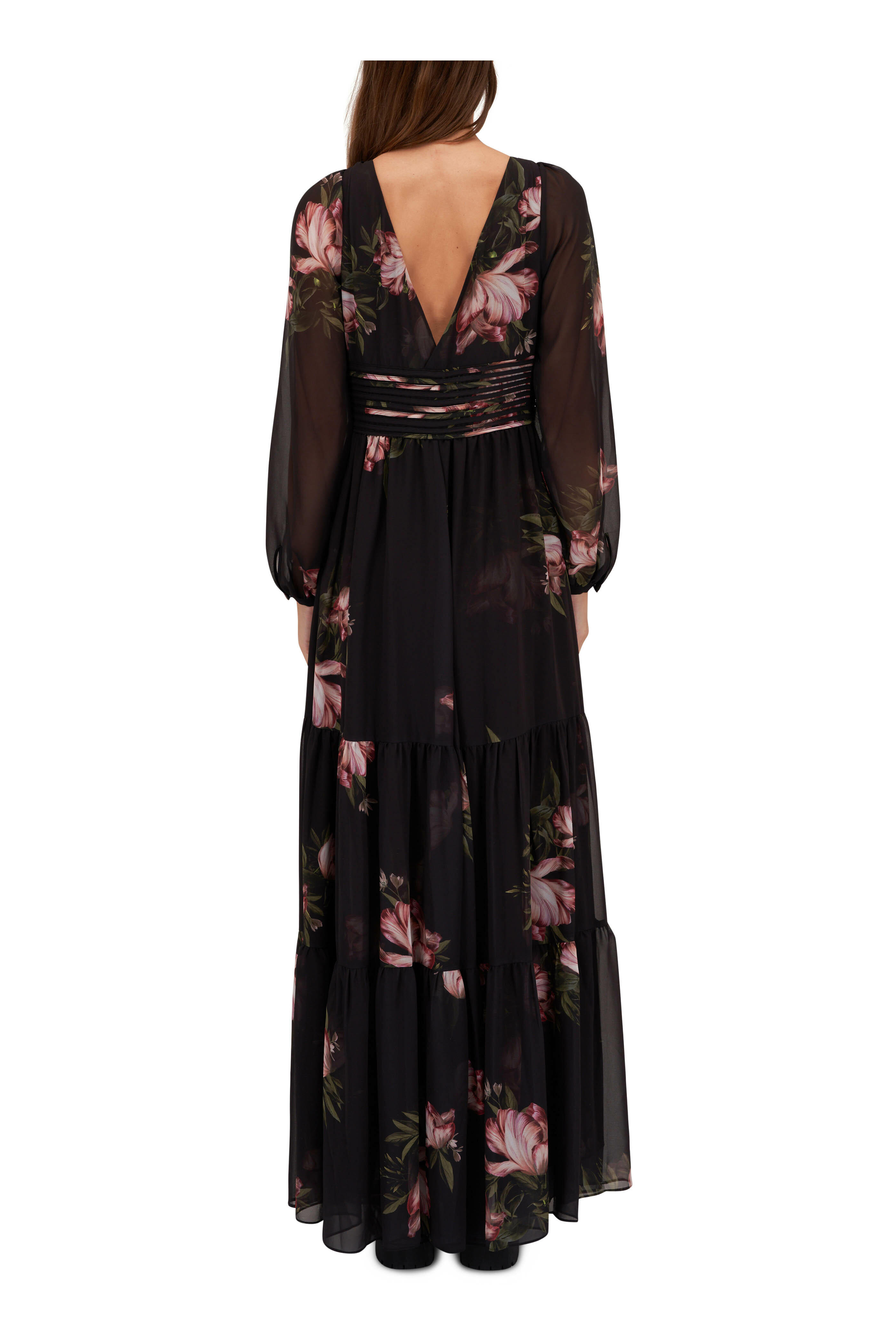 V-neckline. Back zip closure. Sheer, blouson sleeves. Teired skirt. Imported. 60" shoulder to hem. 97% polyester, 3% spandex. Dry clean.