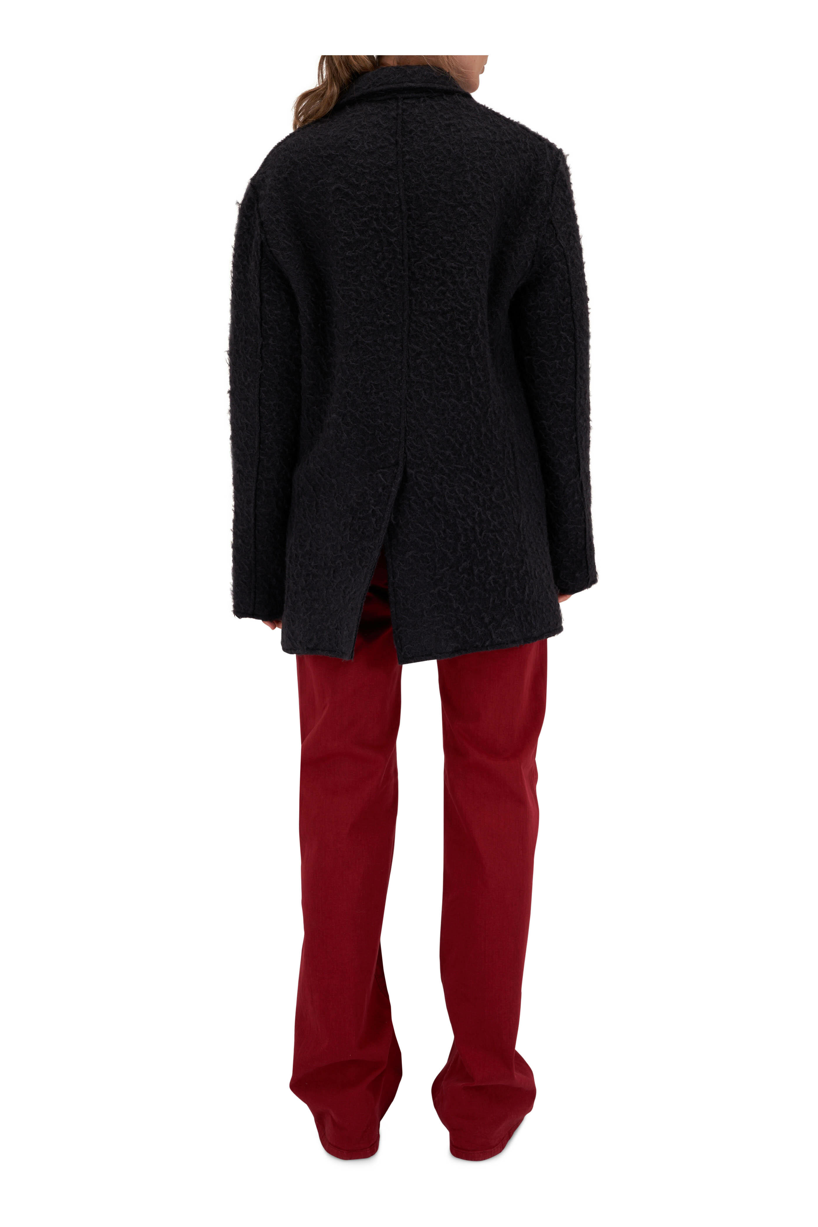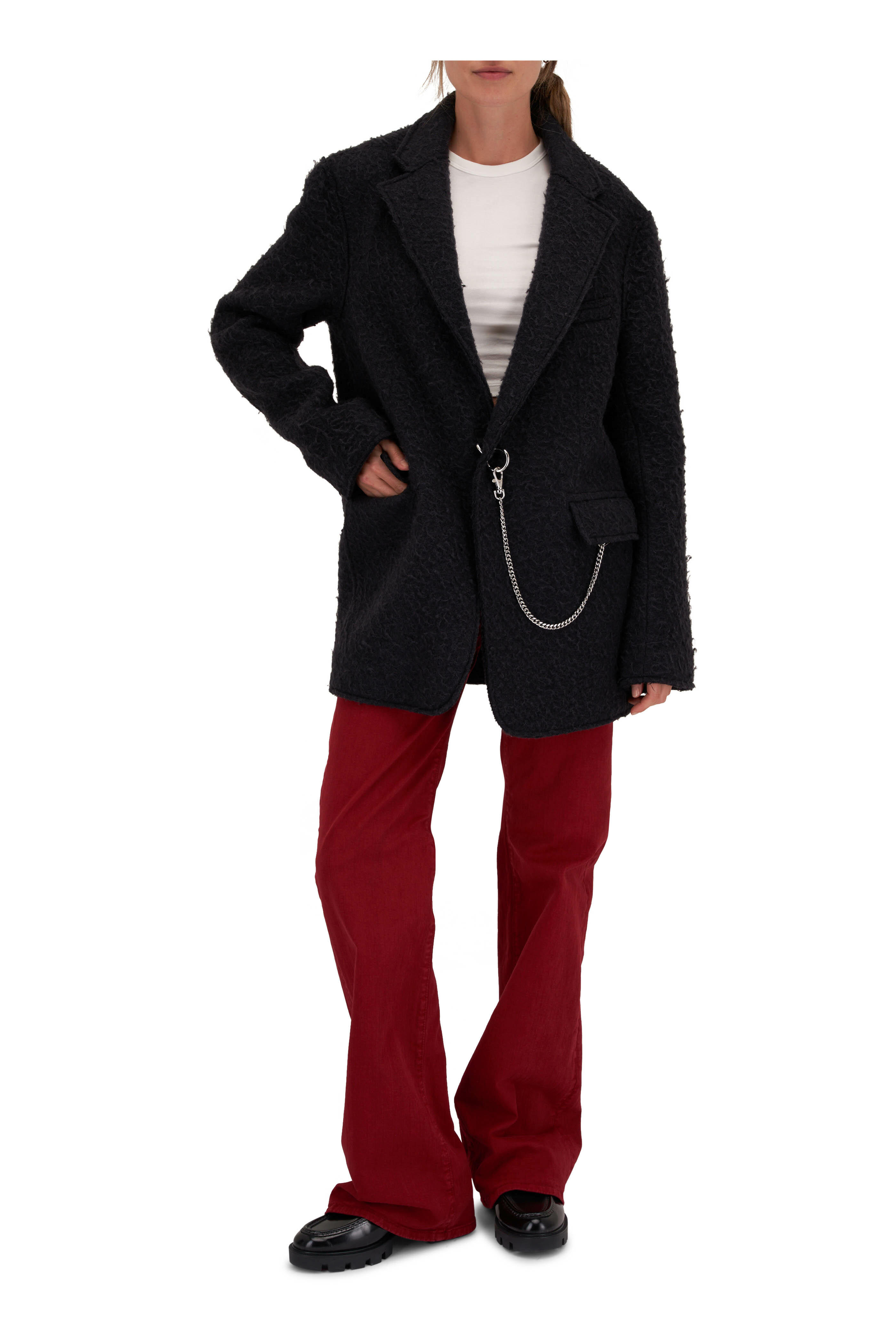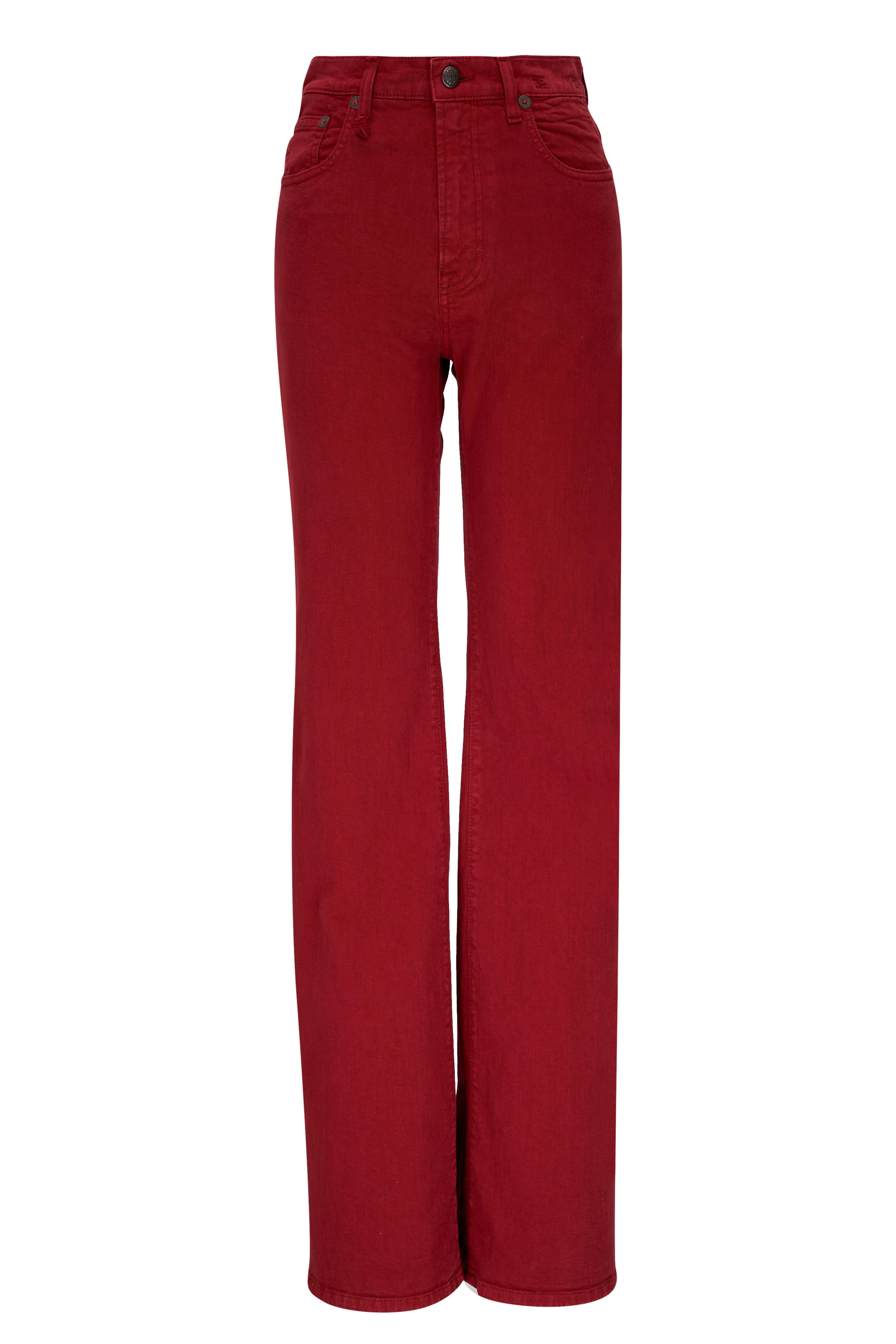 Zip fly; button closure. Banded waist; belt loops. Made in Italy. Rise: 11". Inseam: 35". Lean silhouette. Fitted, slim, straight with slight flare. 99% cotton, 1% elastane; Patch: 100% cow leather. Machine wash cold.