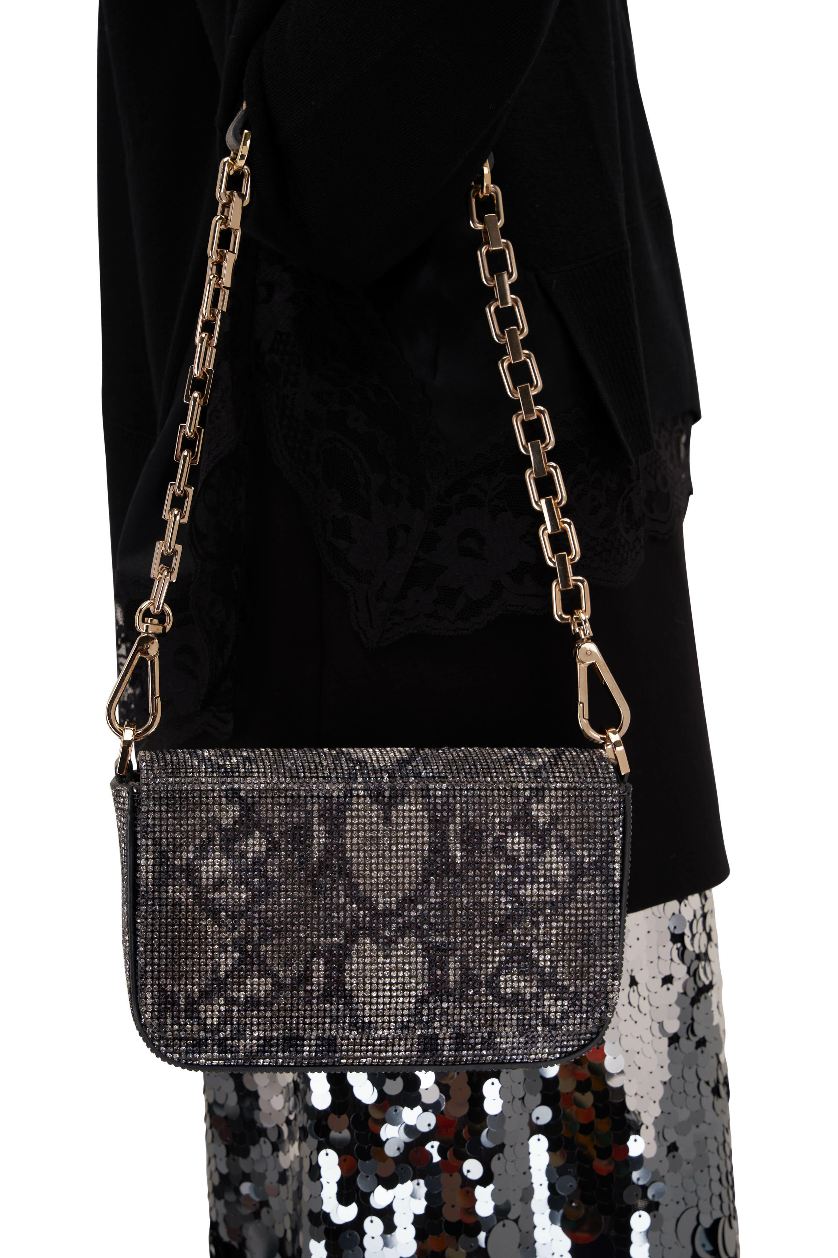 Embellished crystal python. Flap top button closure. Detachable shoulder chain and leather shoulder strap. Single compartment. Made in Spain. 7" width. 5" height. 1.5" depth. 11" strap drop.