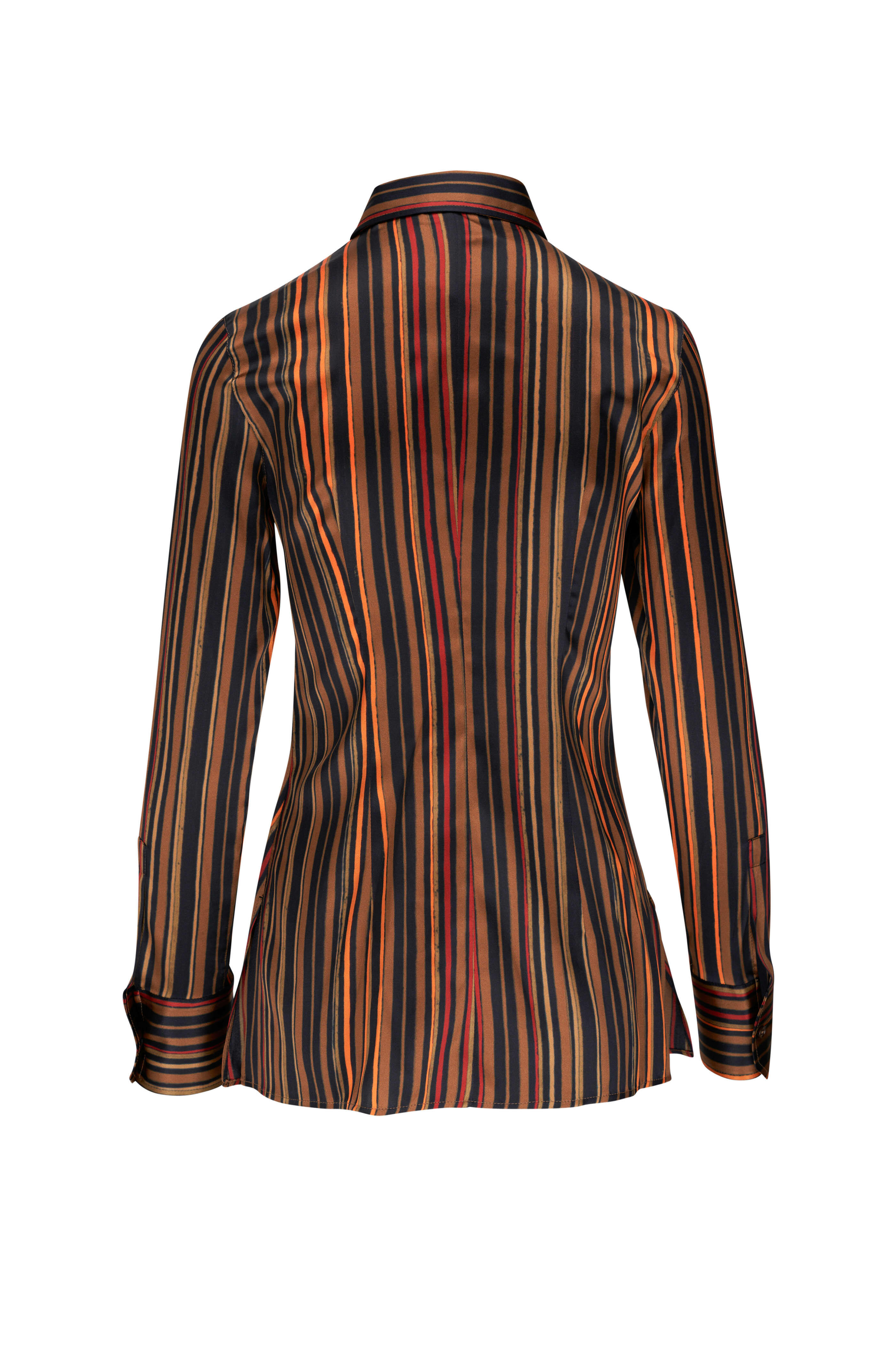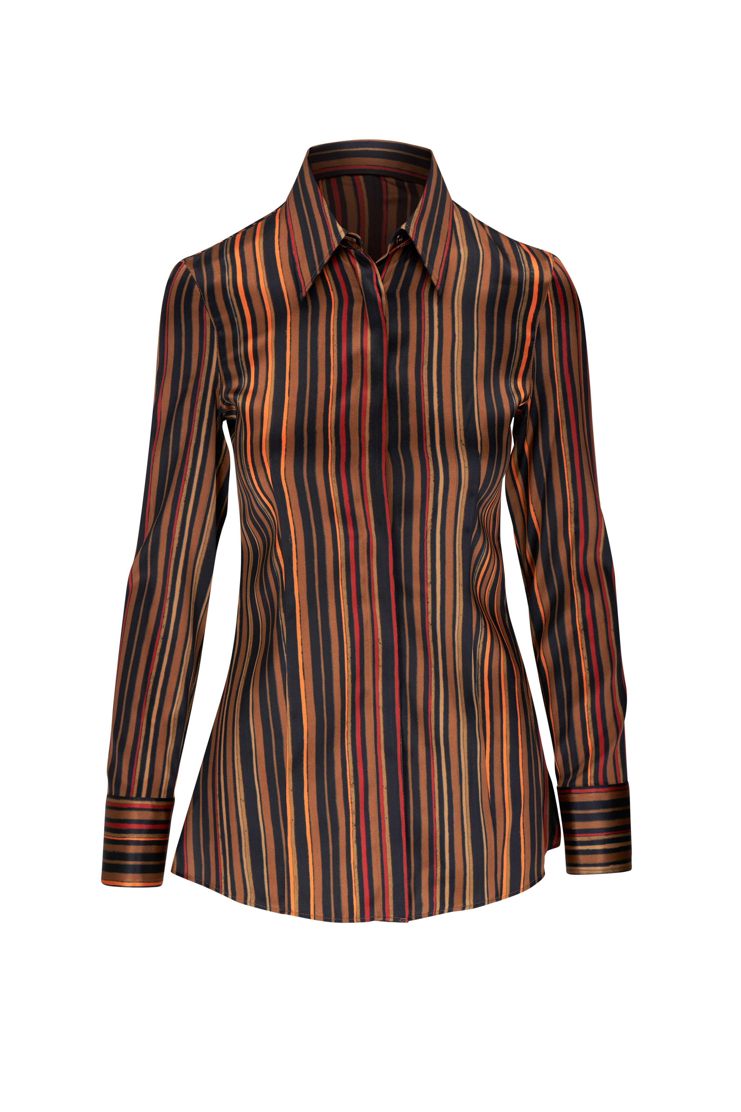 Point collar. Front button placket. Single button cuffs. Side slits at hem. Fabric from Italy. 94% silk, 6% elastane. Dry clean.