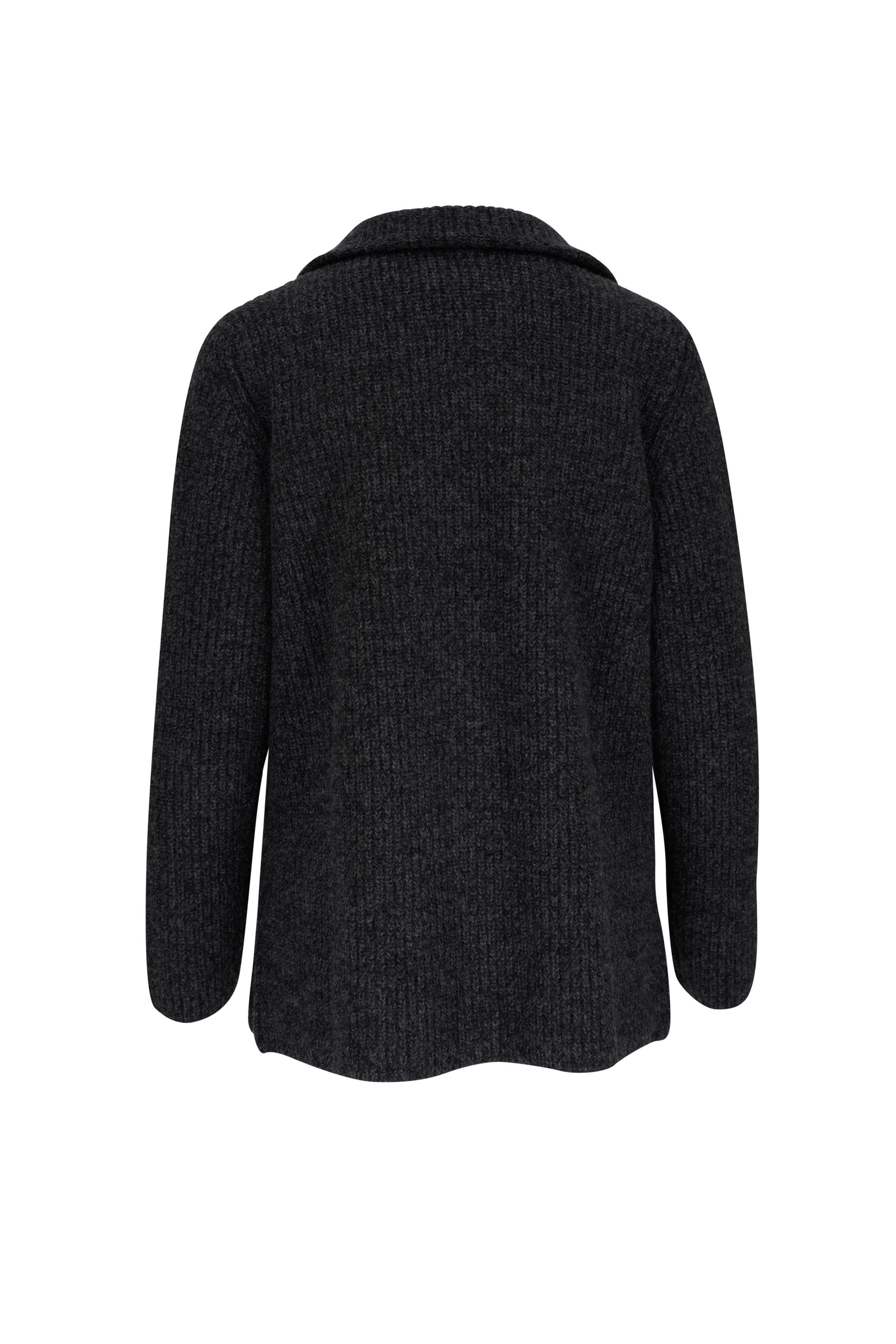 Stand collar. Front button placket. Lower waist patch pockets. Straight hem. Fabric from Italy. 80% cashmere, 20% virgin wool.