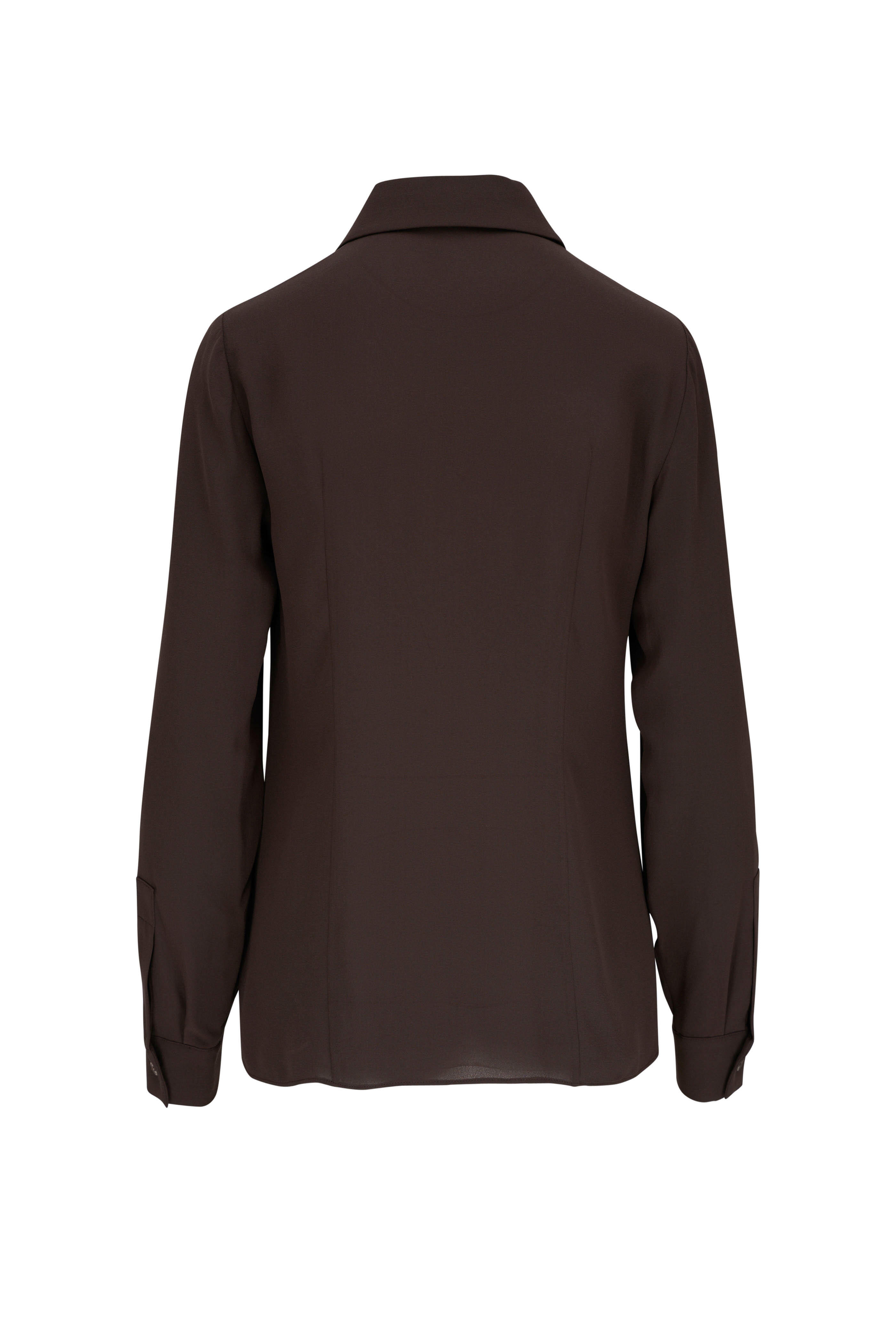 Spread collar. Concealed front button placket. Single button cuffs. Dart details. Made from Italian fabric. 100% silk. Dry clean.