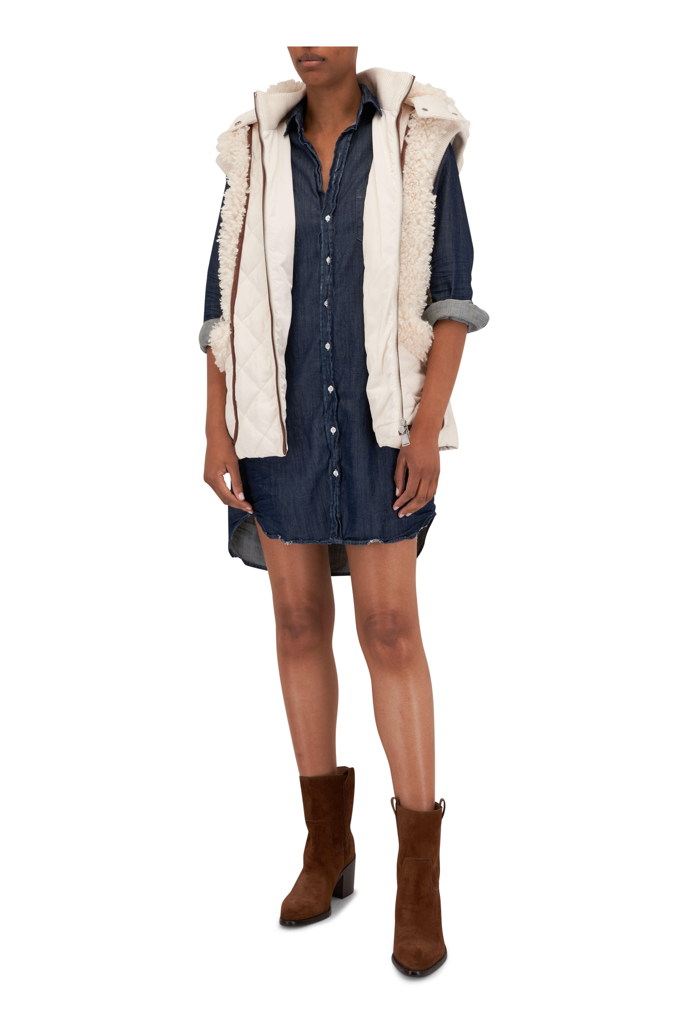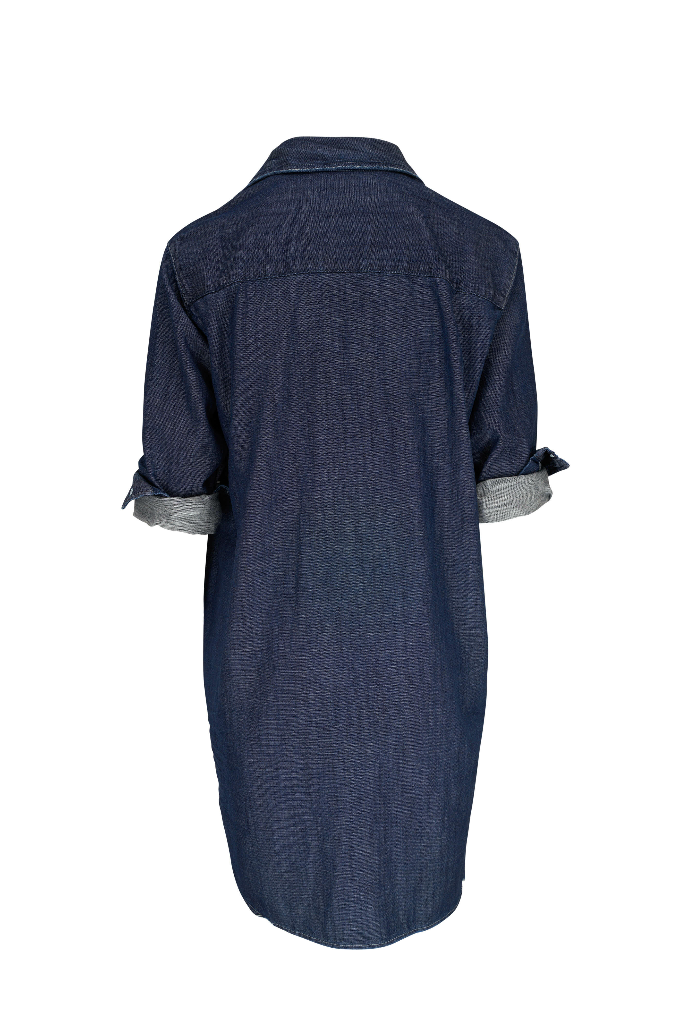 Spread collar. V-Neckline. Front button placket. Single button cuffs. Chest patch pocket. Classic shirt tail hem with distressed details. Woven in Italy. 100% cotton. Machine wash.