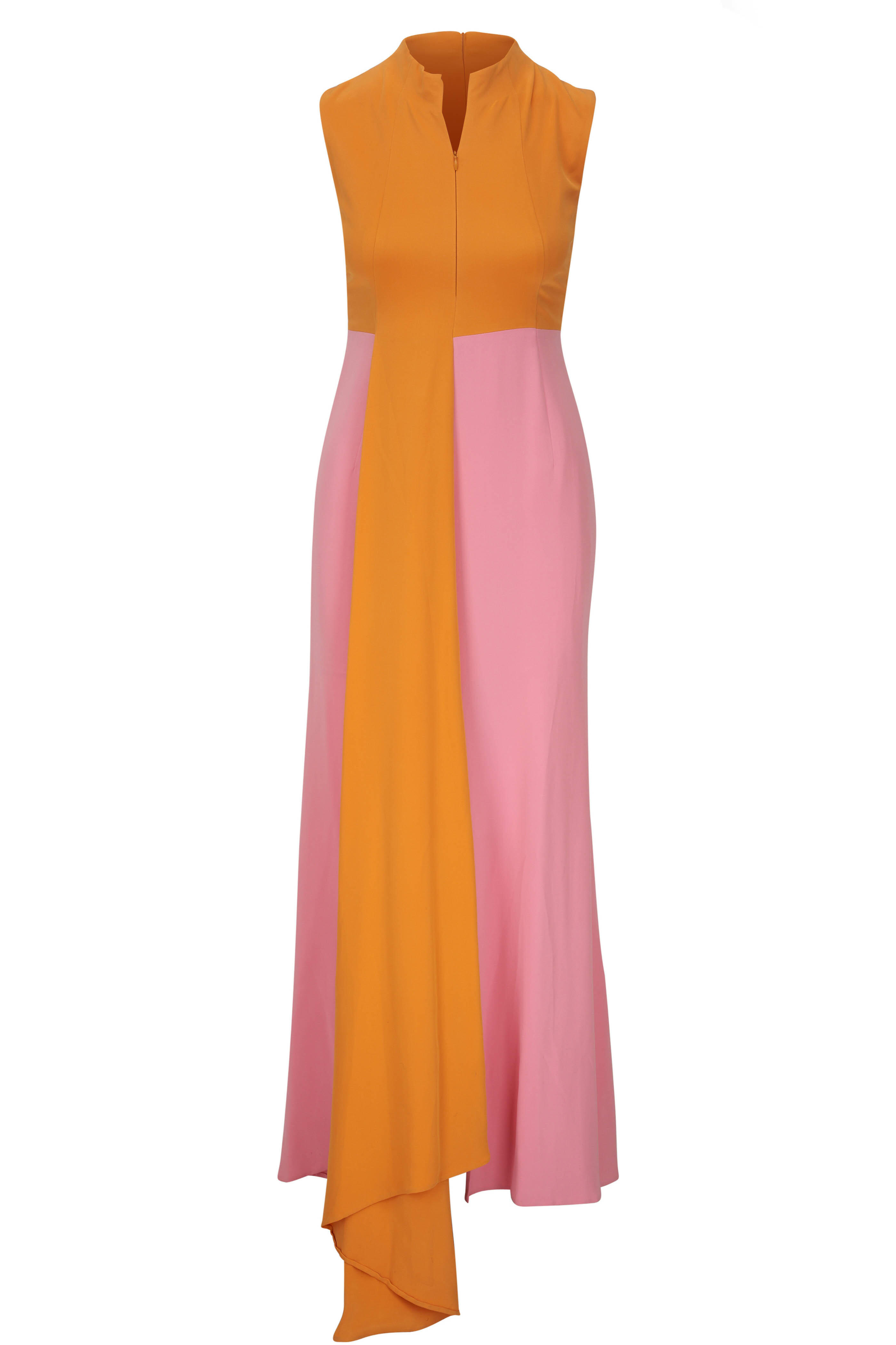 Concealed back zip closure; deep front zip slit. Draped front paneling; center front slit. Asymmetric hem. Fabric from Italy. Color: Sunrise Cherry Blossom. 64" shoulder to hem. 100% silk, fully lined. Dry clean.