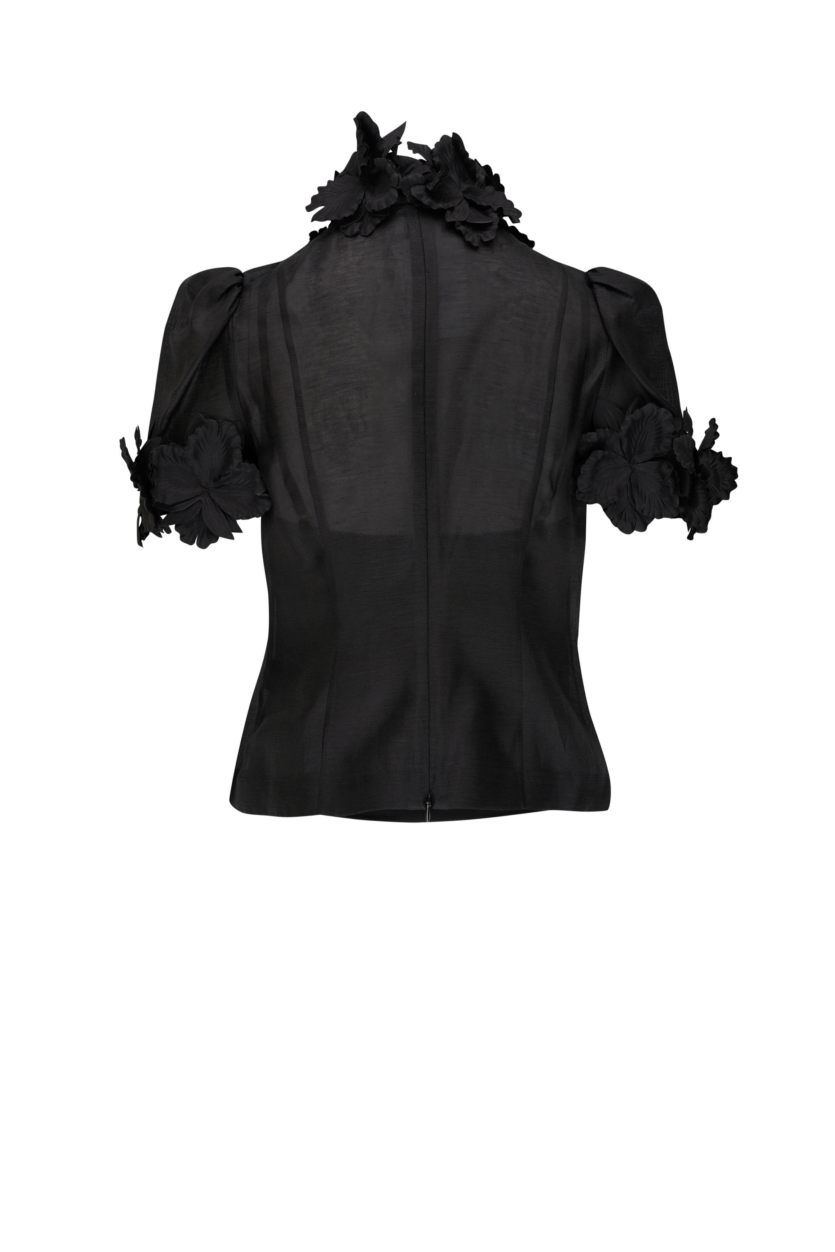 Flower appliqué high neckline. Back zip closure. Flower appliqué cuffs. Includes slip top. Imported. 55% linen, 45% silk. Dry clean.