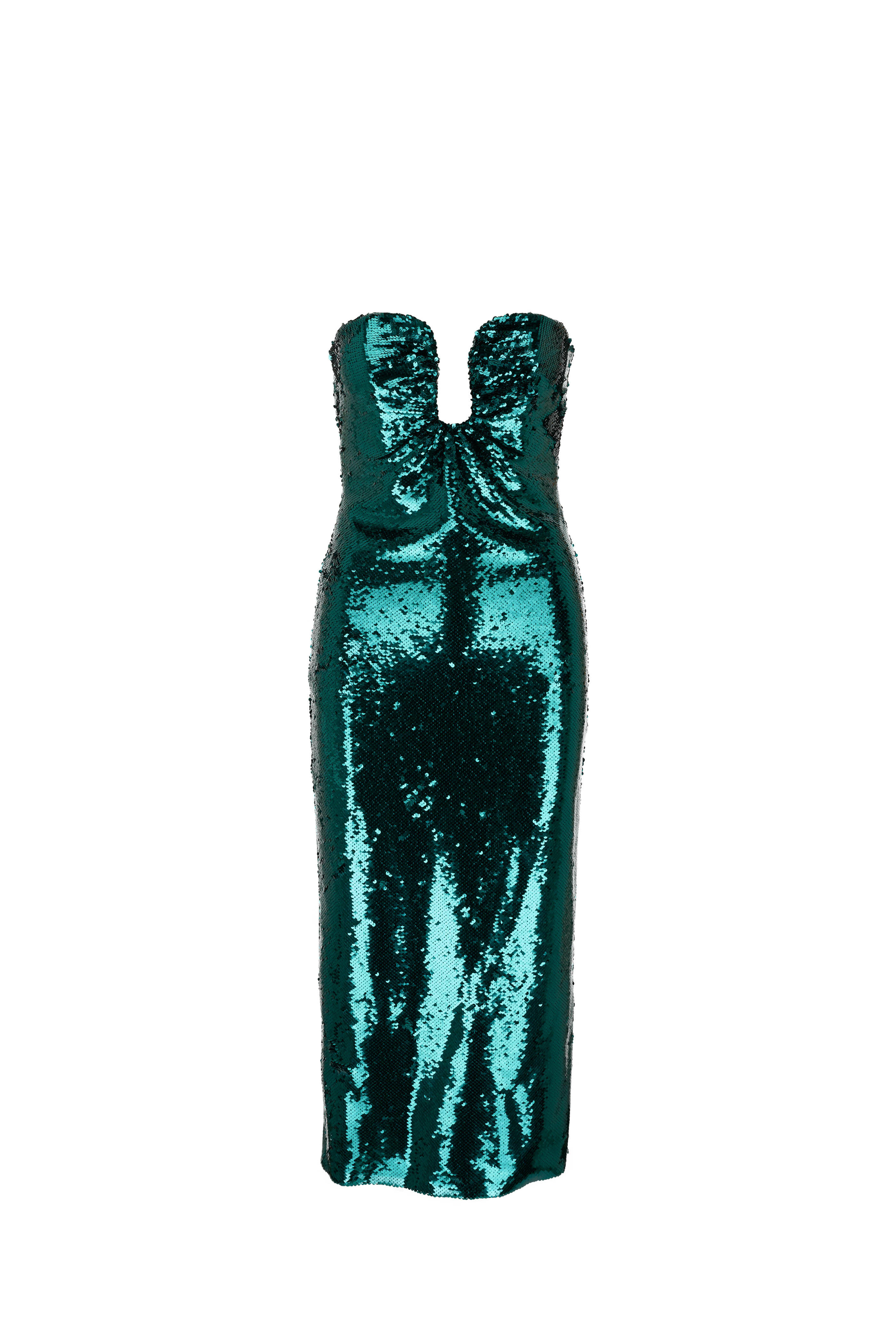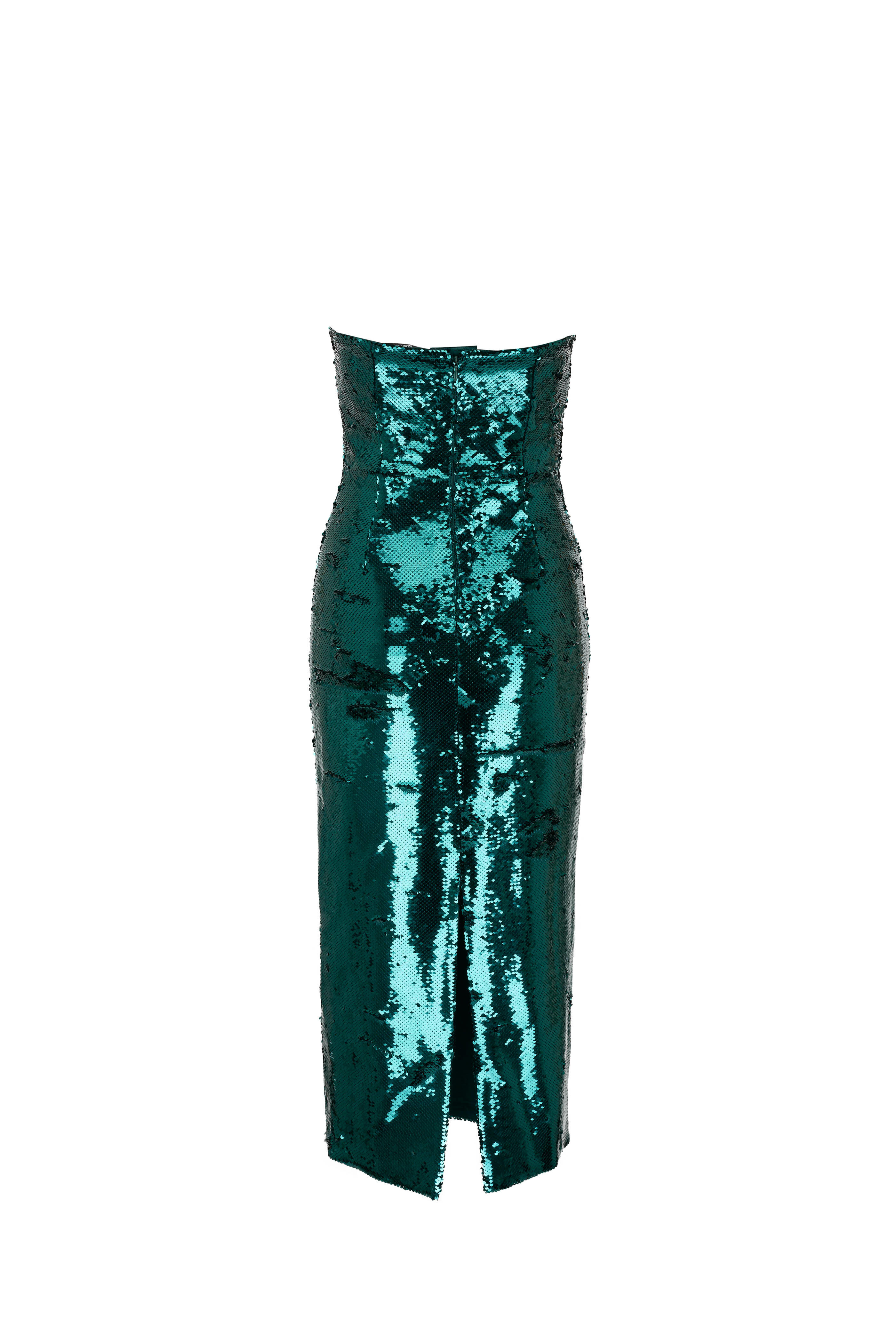 Structured u-neckline. Concealed back zip. Internal corset. Fitted bodice. Back slit. Imported. 97% viscose, 3% elastane; fully lined. Dry clean.