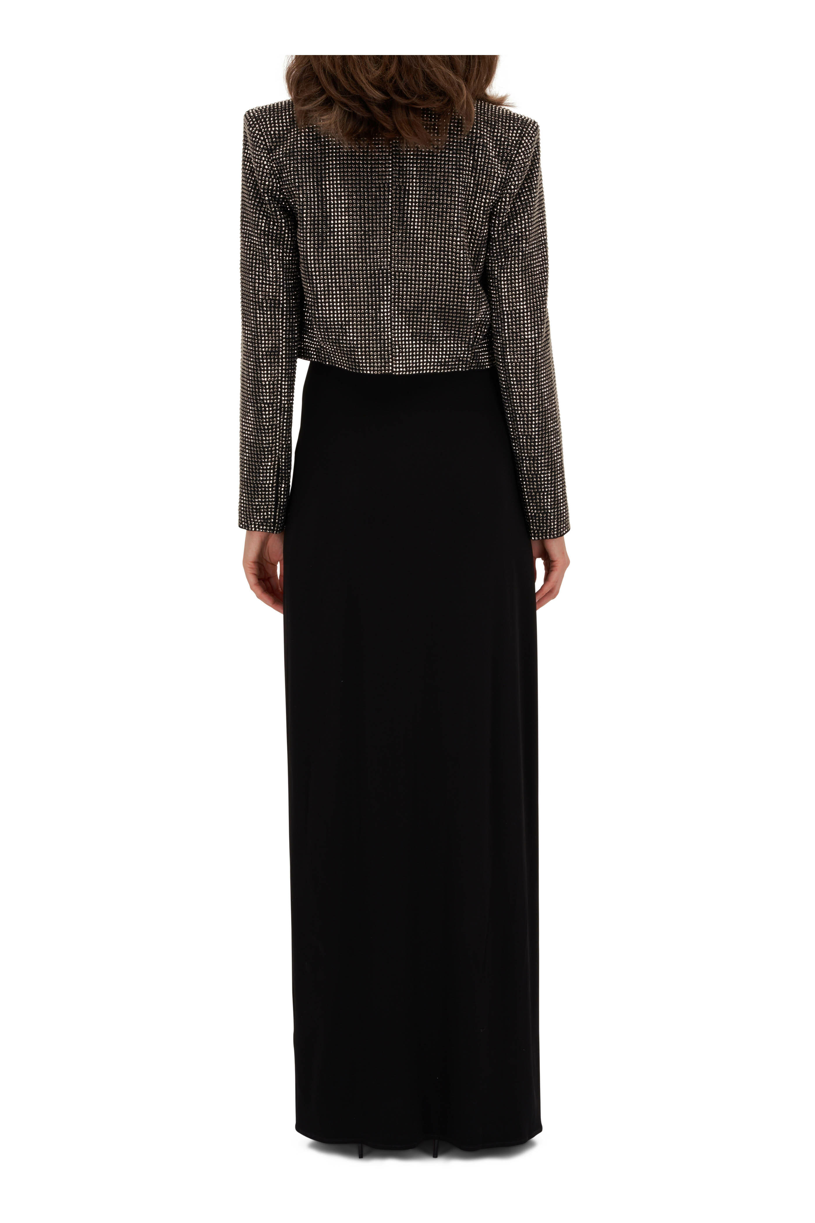 Peaked lapels. Plunging v-neckline. Concealed front button closure. Tailored shoulder pads. Chest welt pocket. Open placket cuffs. Imported. Cropped. 100% polyester; fully lined. Dry clean.