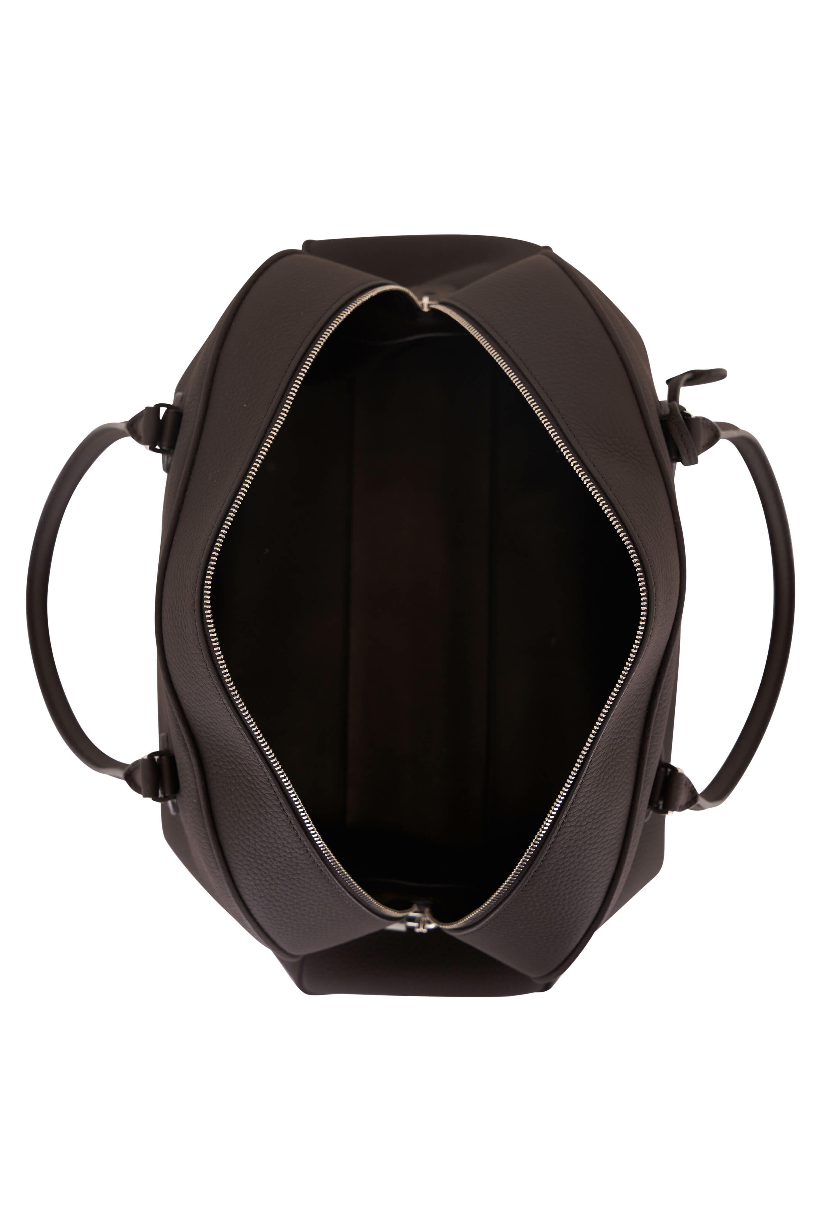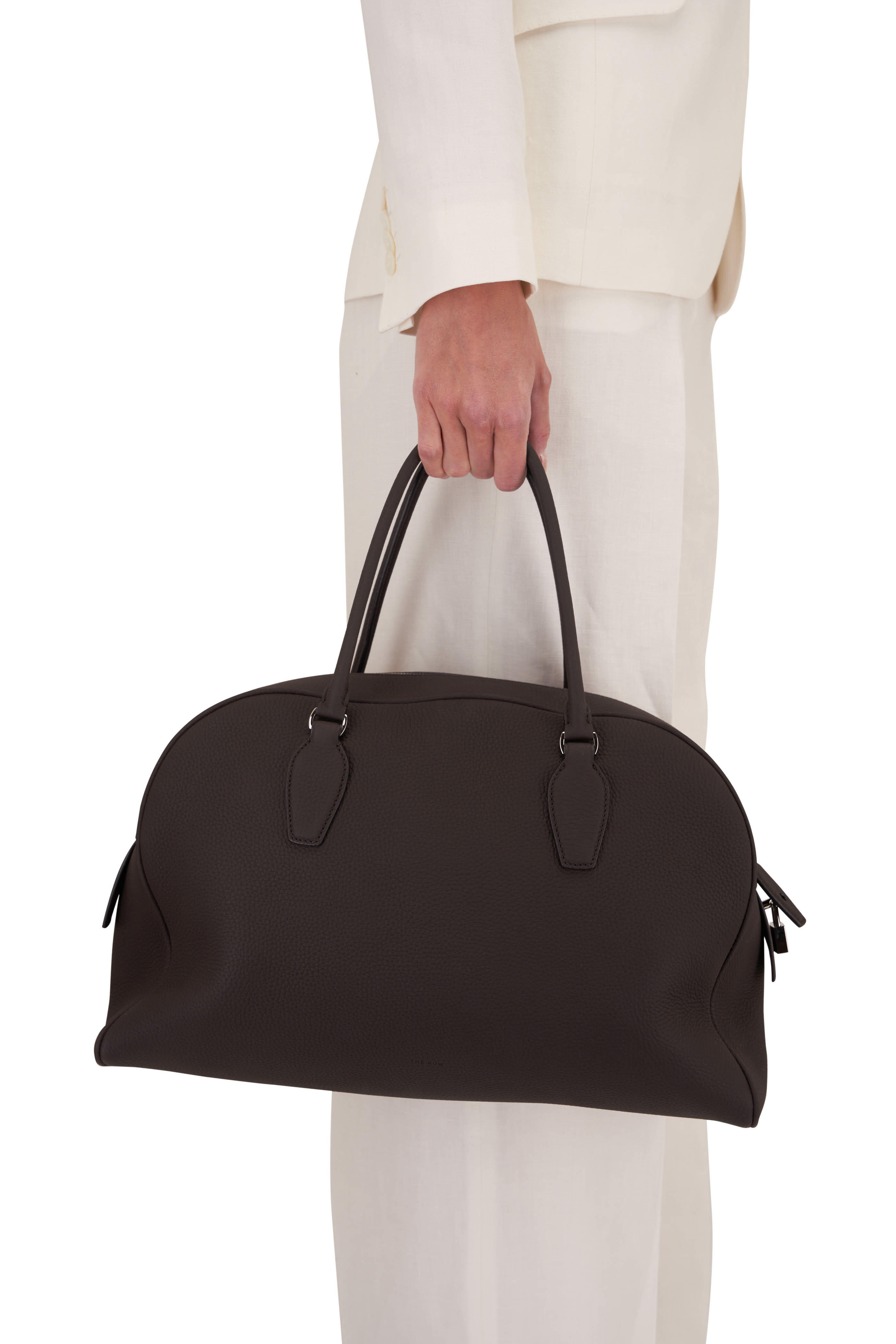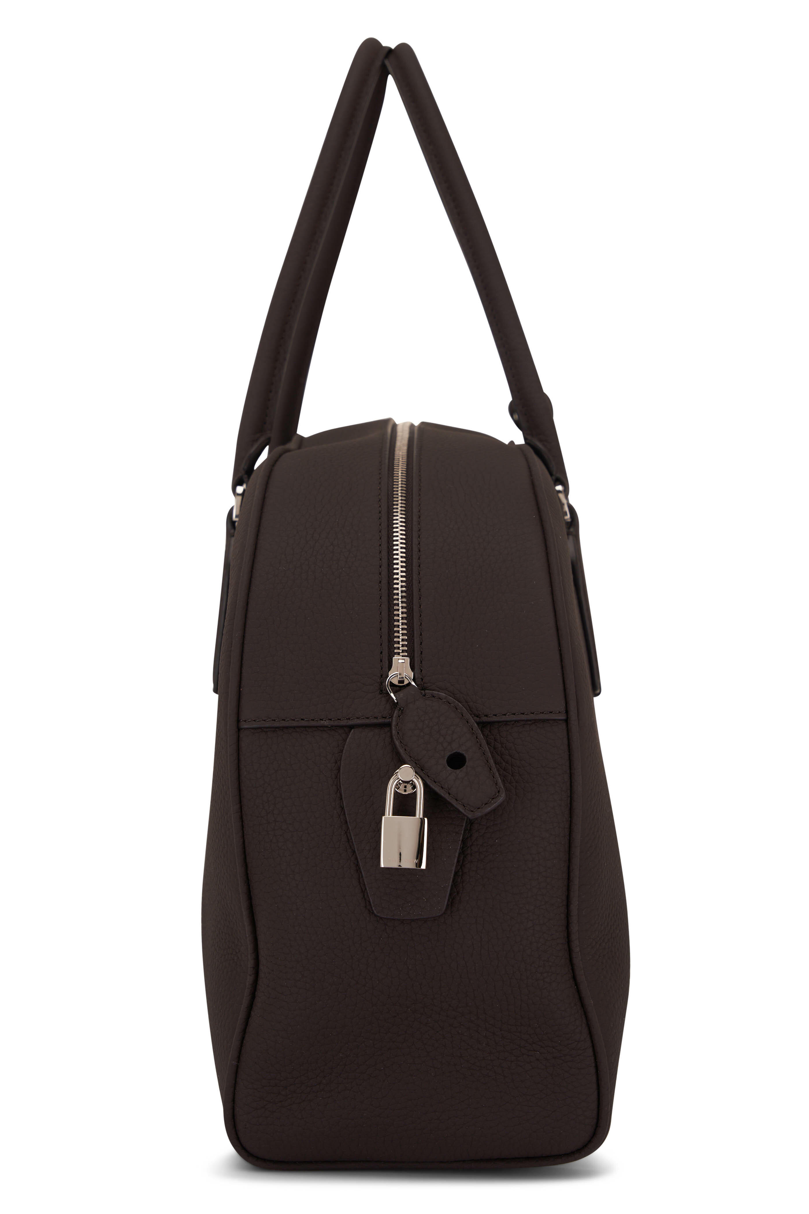 Dual top rolled leather handles. Top zip closure; branded metal padlock and key. Single compartment; interior slip pockets. Nappa lining. Made in Italy. Width: 16". Height: 8". Depth: 5". Handle drop: 7". 100% deerskin leather.