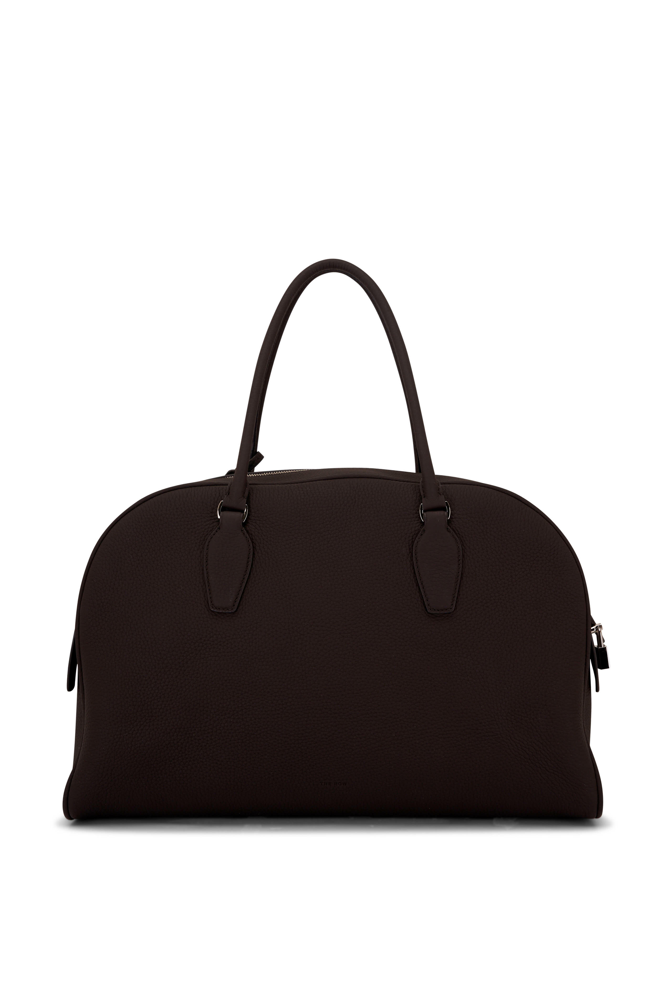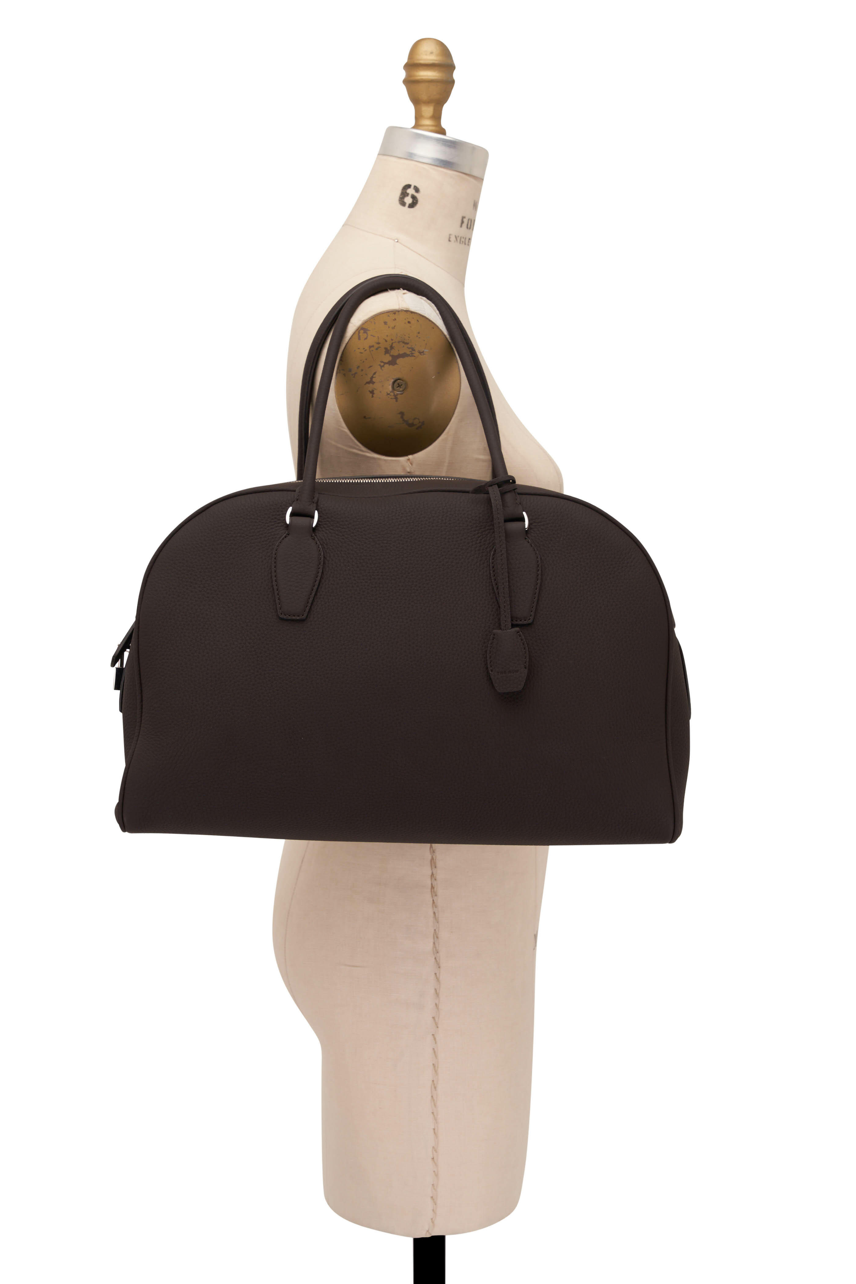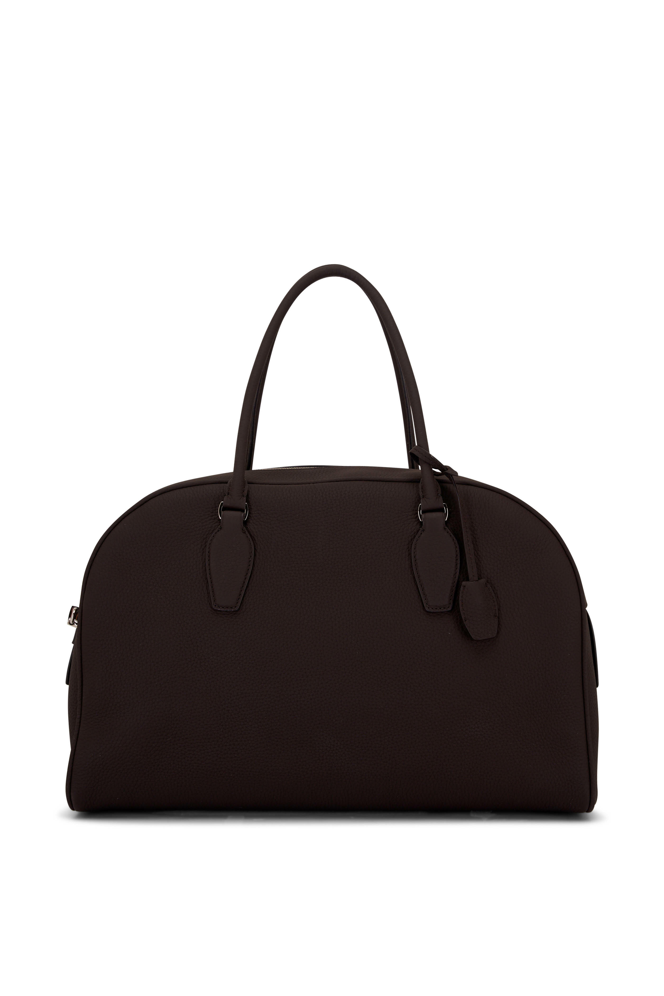 Dual top rolled leather handles. Top zip closure; branded metal padlock and key. Single compartment; interior slip pockets. Nappa lining. Made in Italy. Width: 16". Height: 8". Depth: 5". Handle drop: 7". 100% deerskin leather.