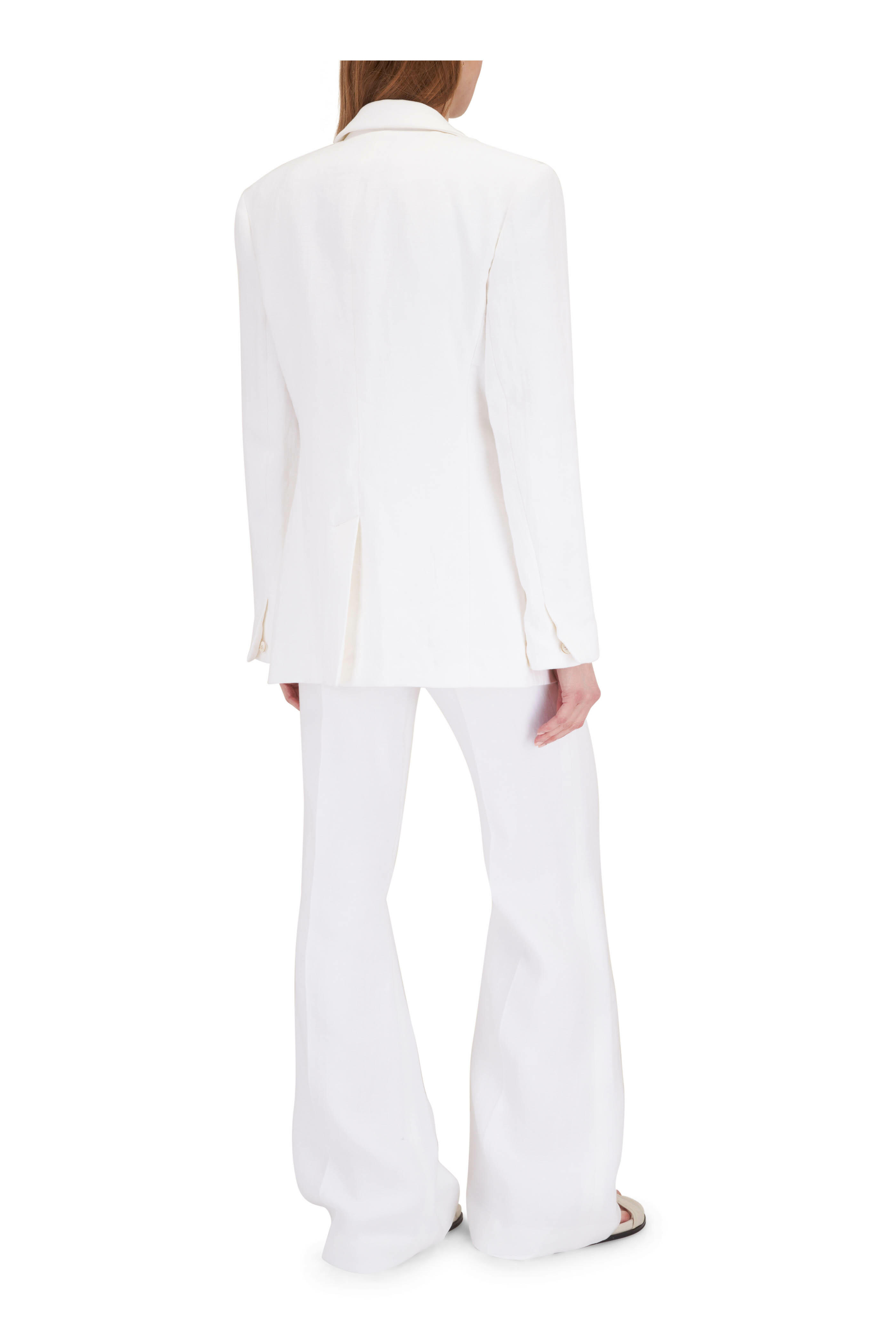 Notch lapels. Single button front closure. Single button cuffs. Front flap pockets. Single vent. Imported. 29" shoulder to hem. Tailored fit. 97% linen, 3% cotton; lining: 100% silk. Dry clean.