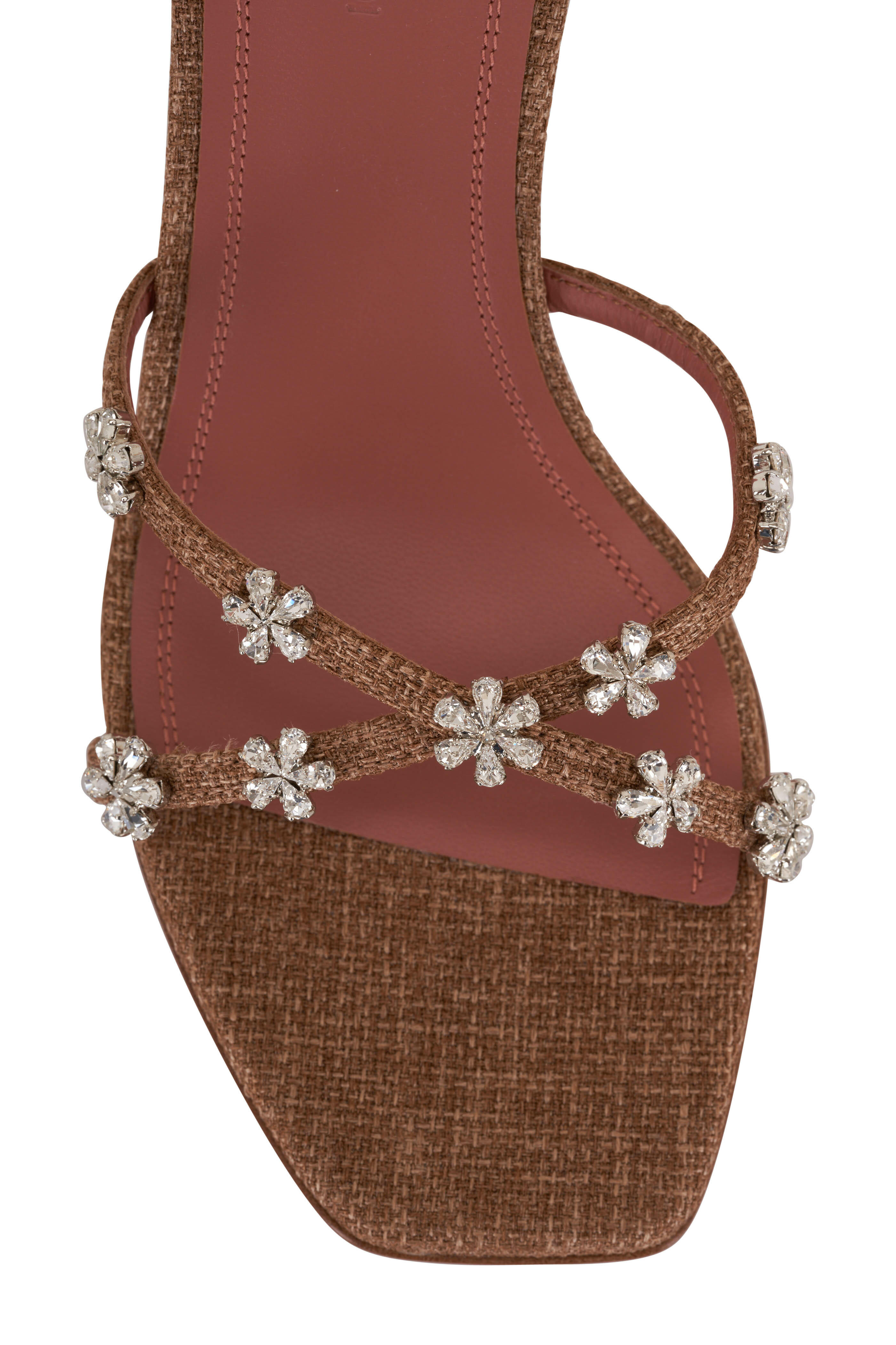 Canvas upper. Open square toe. Slip on style. Crystal daisy detailing. Fabric lining and leather insole. Leather and rubber sole. Signature maritini glass heel. Made in Italy. Heel measurement: 70mm (approx. 2.75").