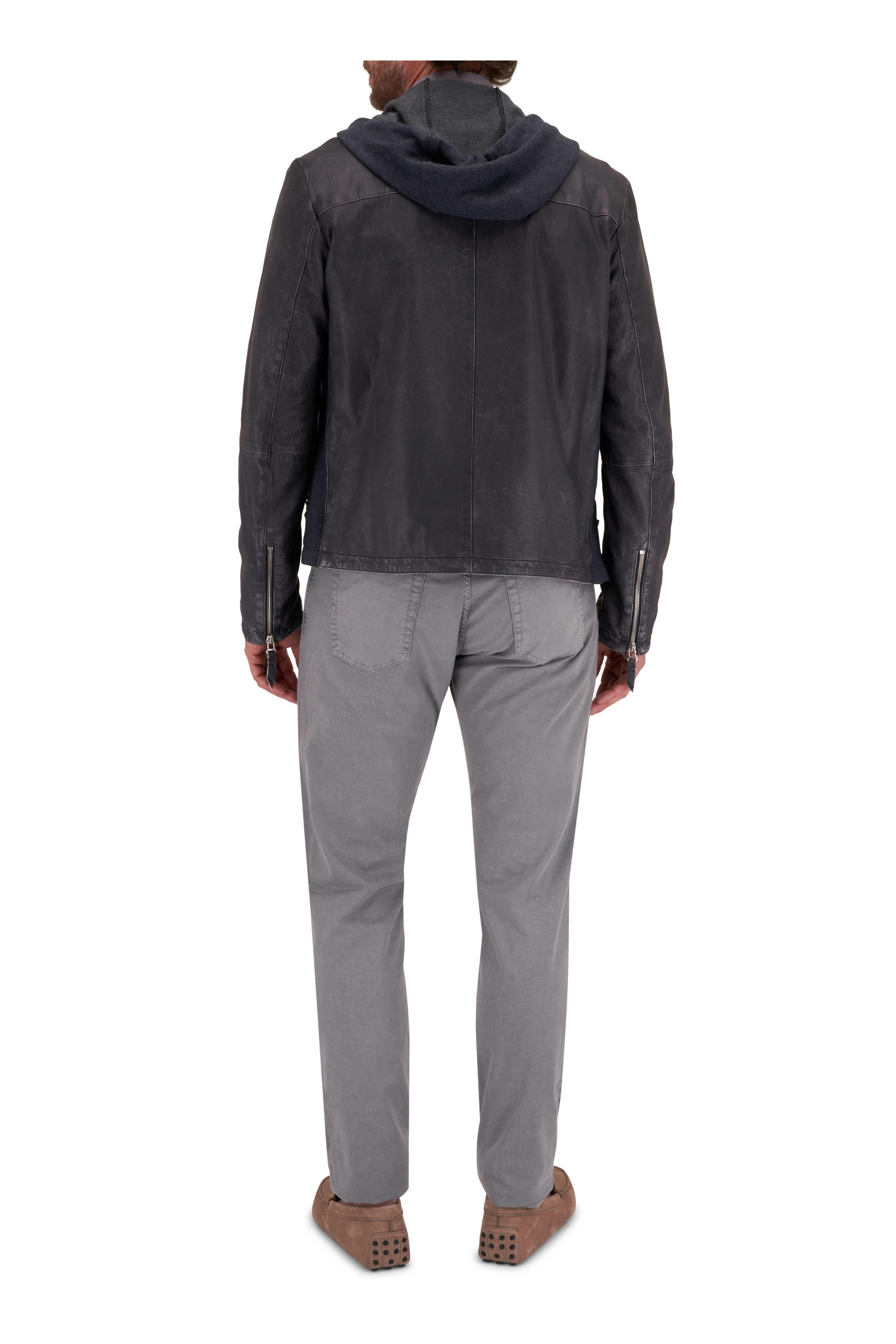 Specialist clean. Detachable, adjustable drawcord textile hood. Two-way front zip closure; neck snap tab. Lower zip pockets; interior zip pockets. Left & right side textile panels. Distressed detailing throughout. Zipper cuffs. Made in Italy. 100% leather; fabric 2: 83% cotton 15% nylon; lining: 100% cotton.