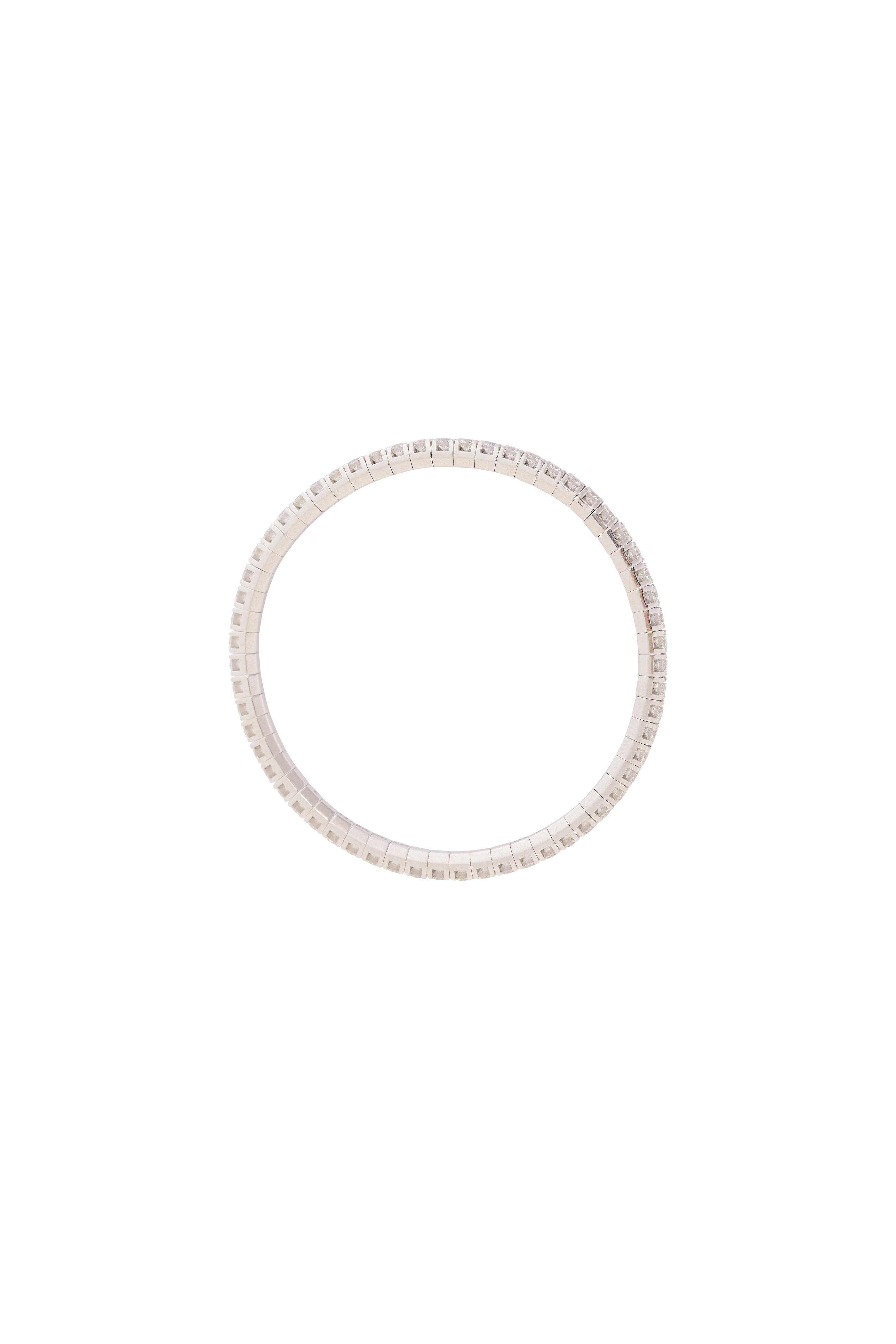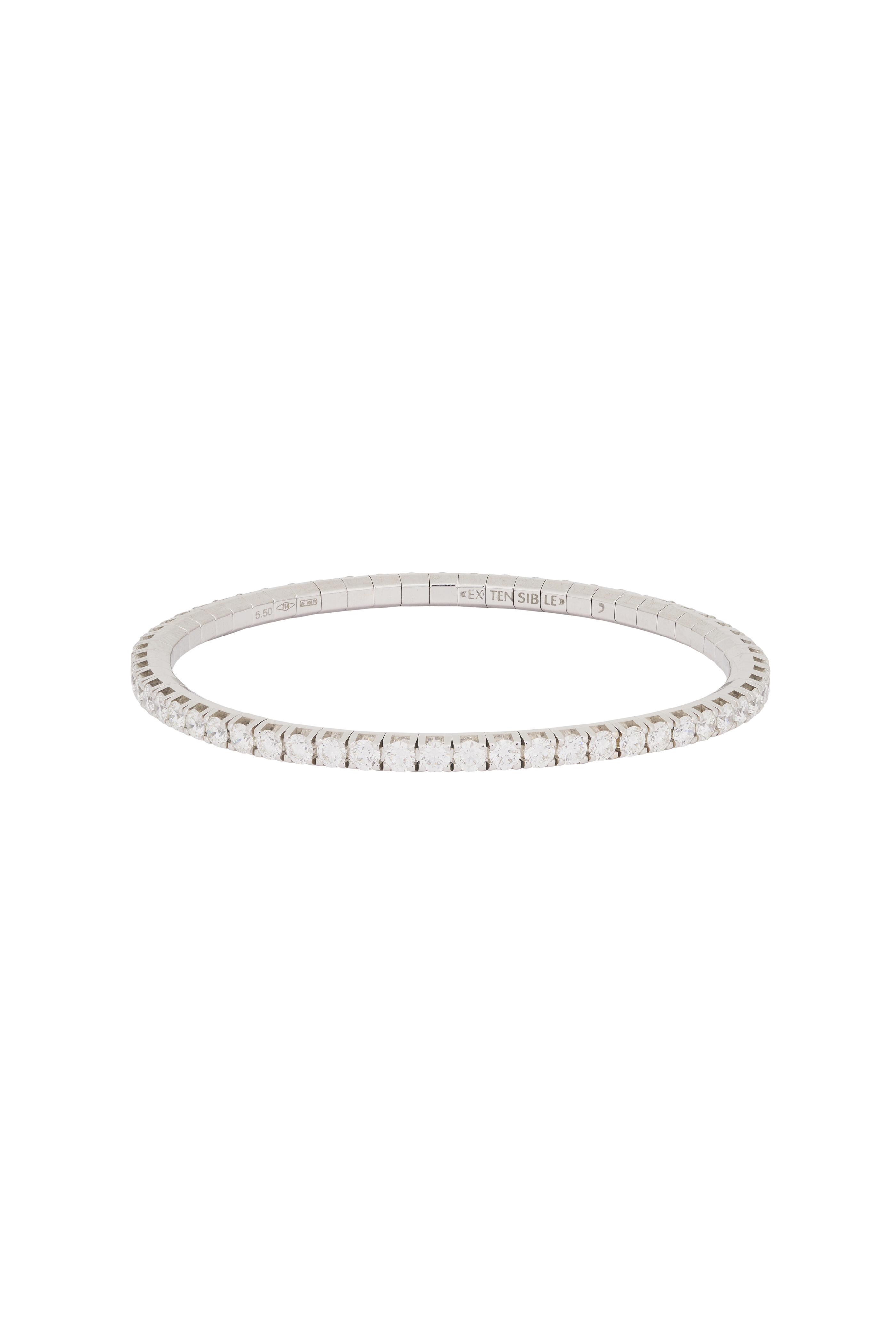 18K White Gold. Brilliant Round Cut Diamonds: 5.50CT. Color: F-G. Clarity: VS2-SI1. Patented Titanium Spring Design. Clasp-Free Design. Stretch, Slip On & Off. Size 6.5" Diameter. Made In Italy!