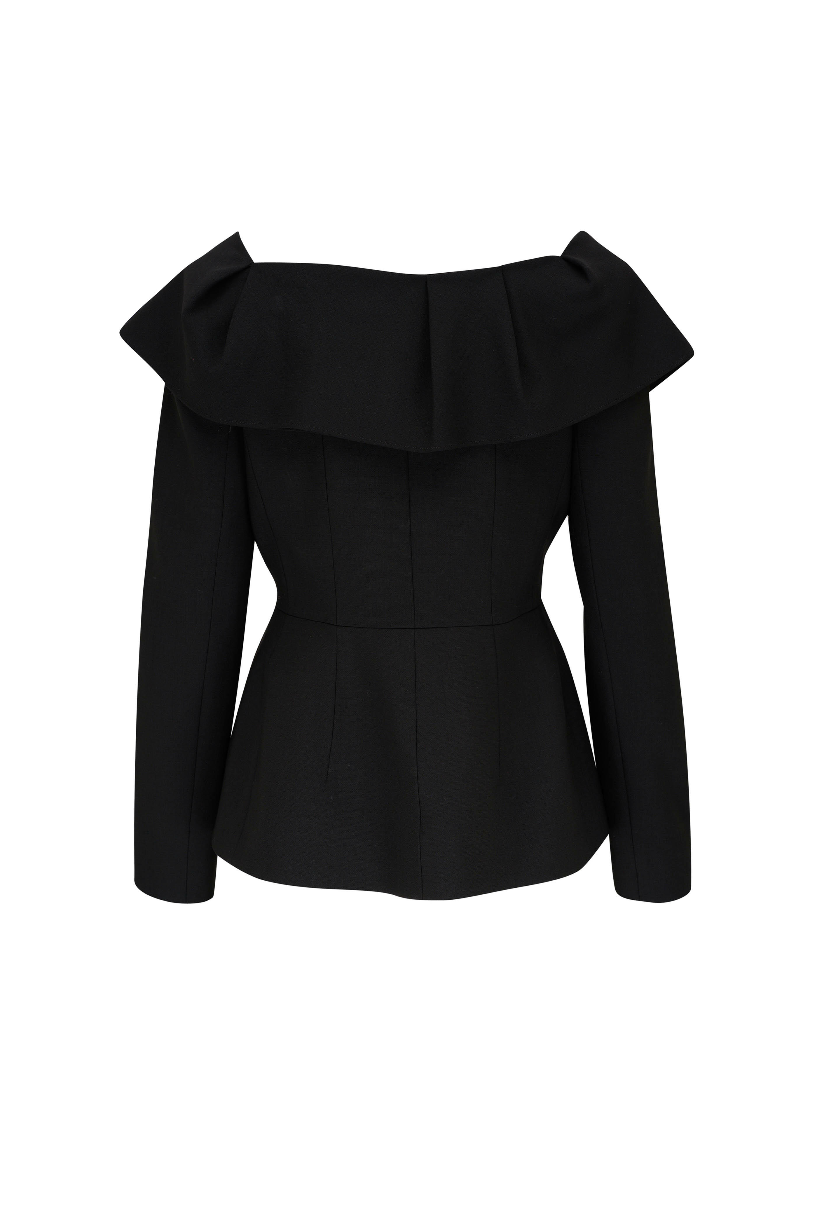 Lined. Sweetheart neckline with draping details. Front button placket; Snap buttons at neckline. Peplum hem. Made in Italy. 97% wool, 3% elastane. Dry clean.