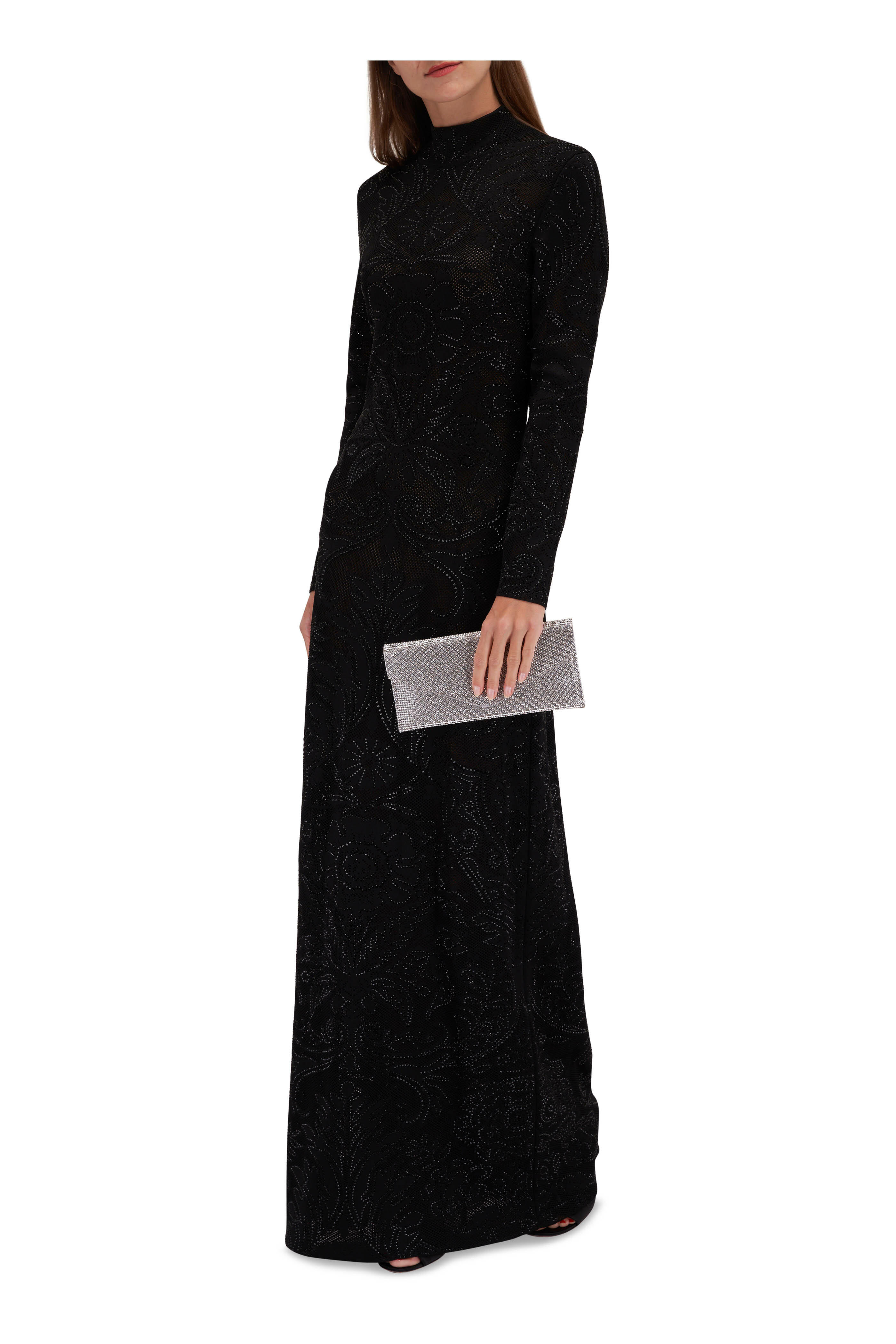 Mock neckline. Concealed back zip. Semi-sheer lace knit detail. Allover crystal embellishment. Made in Italy. Column silhouette. 65" shoulder to hem. 94% viscose, 5% viscose, 1% polyurethane. Dry clean.