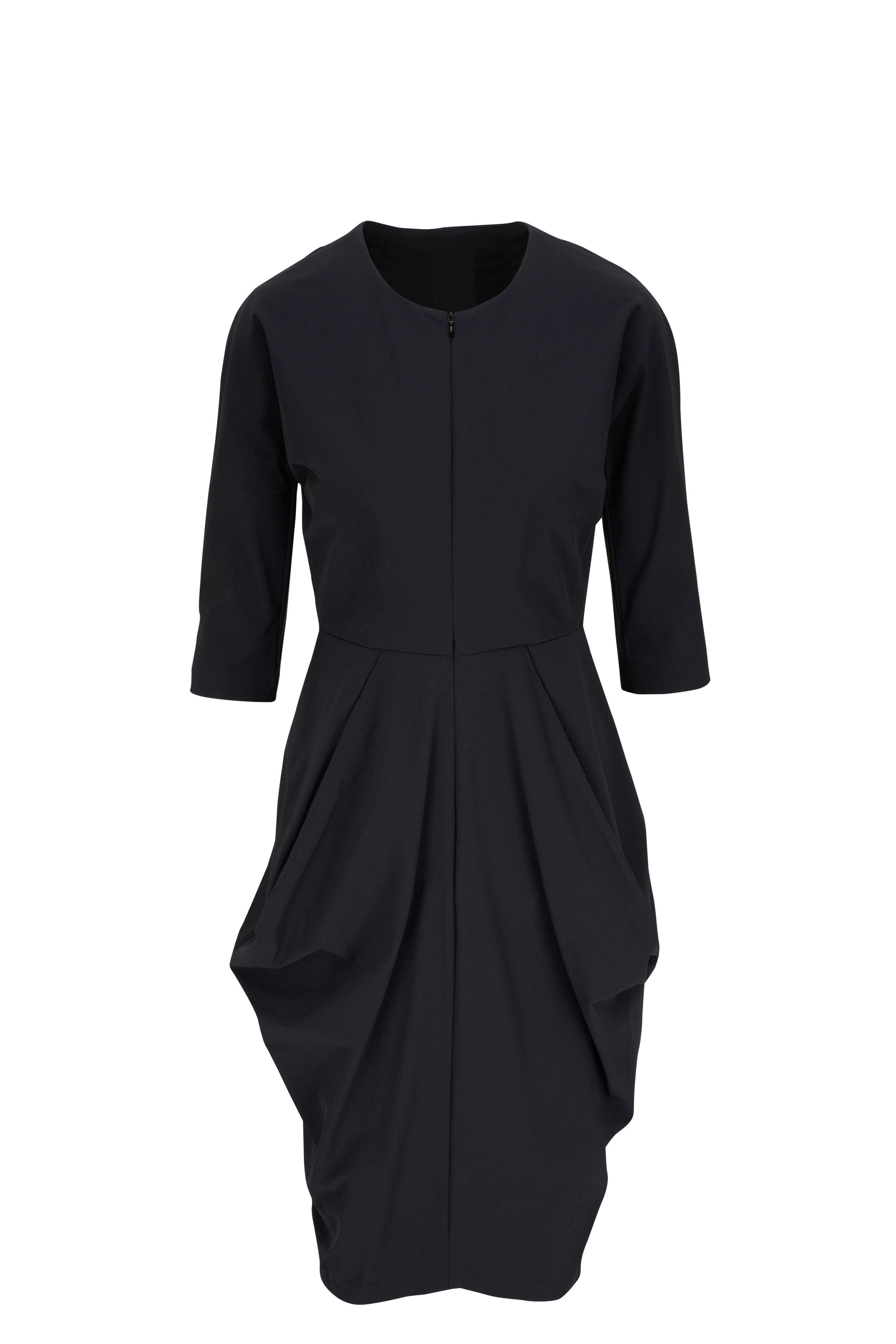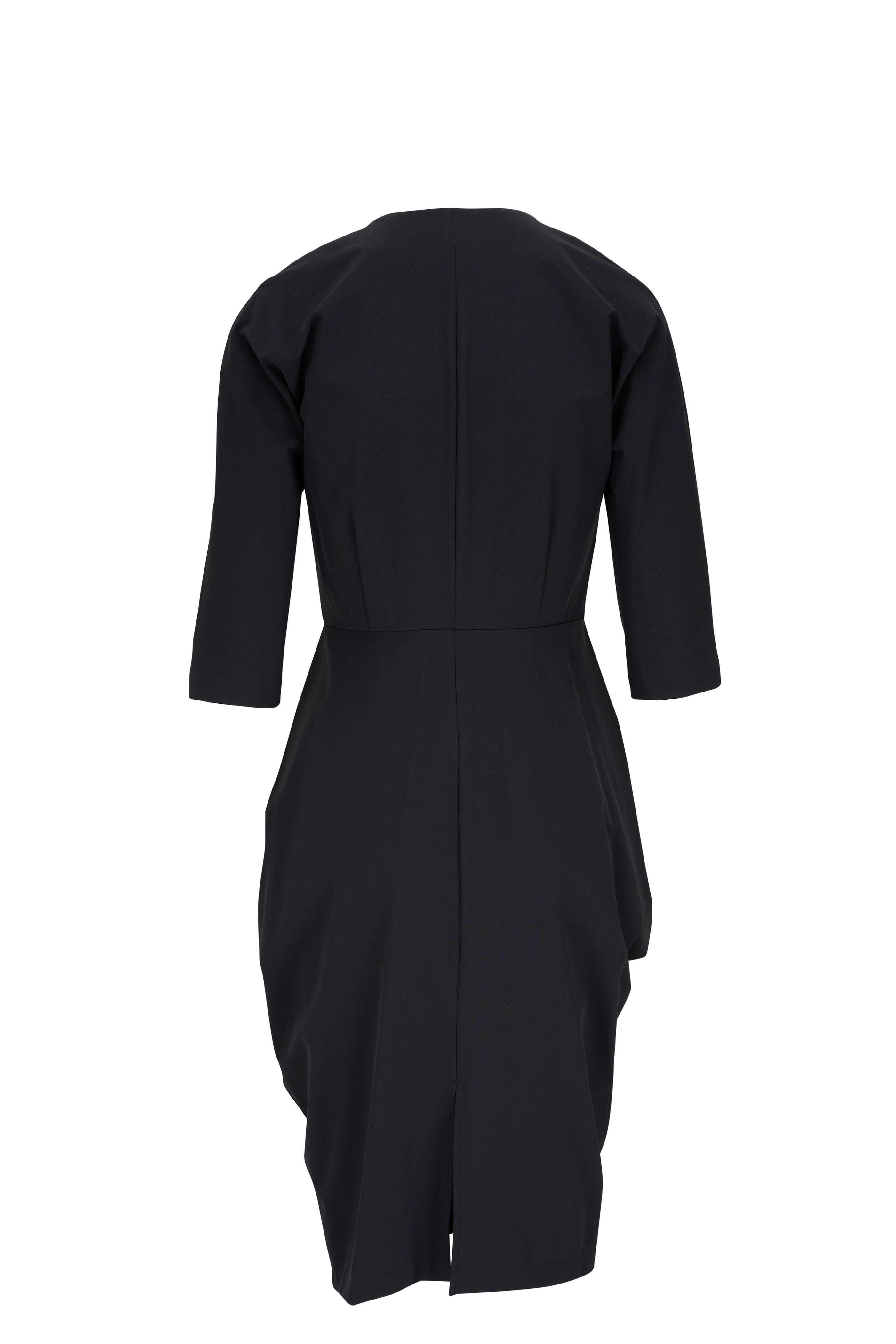 Round neckline. Concealed front zip. Elbow length dolman sleeves. Drape detailing. Center back slit. Made in the USA. 43" shoulder to hem. 90% nylon, 10% spandex. Dry clean.