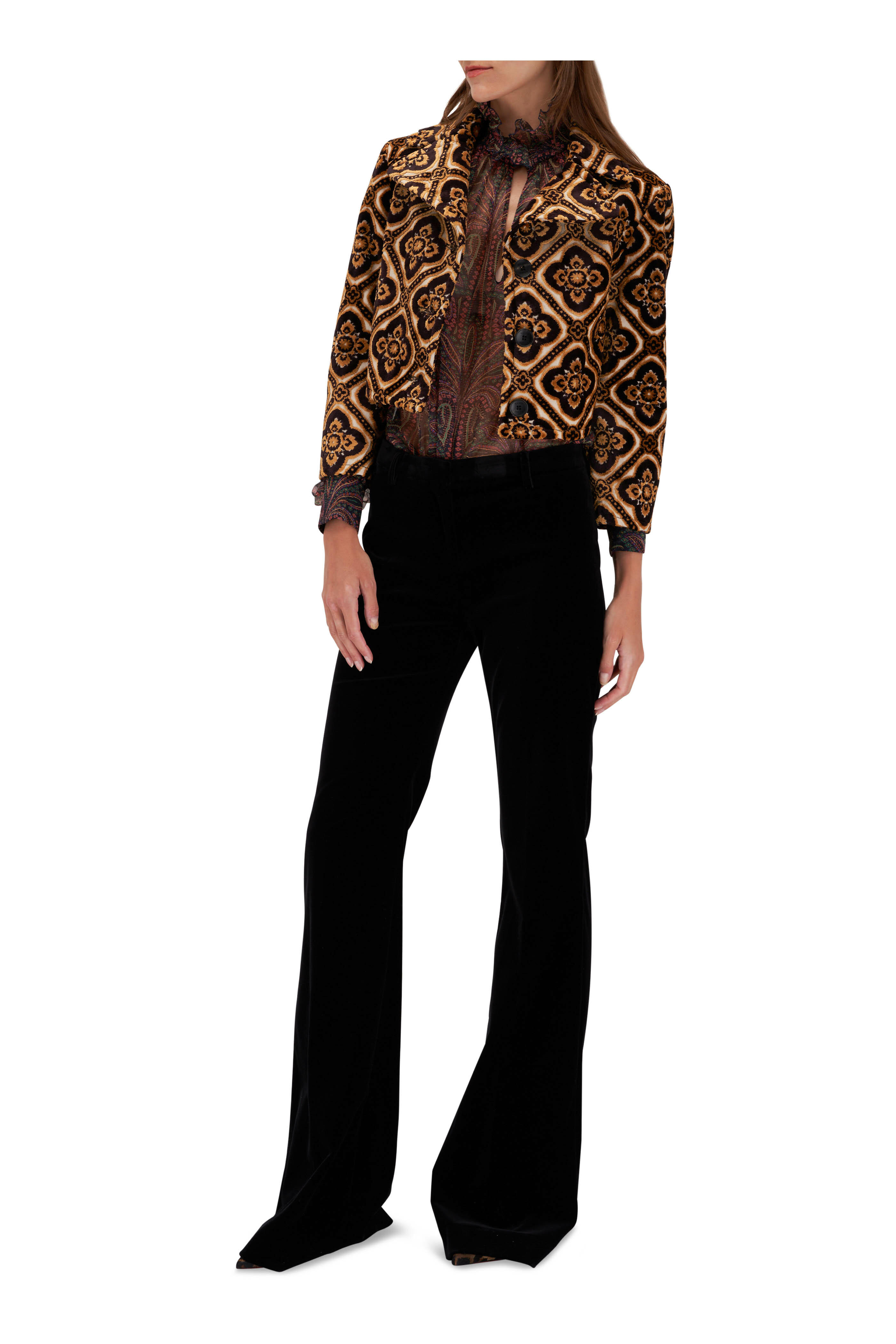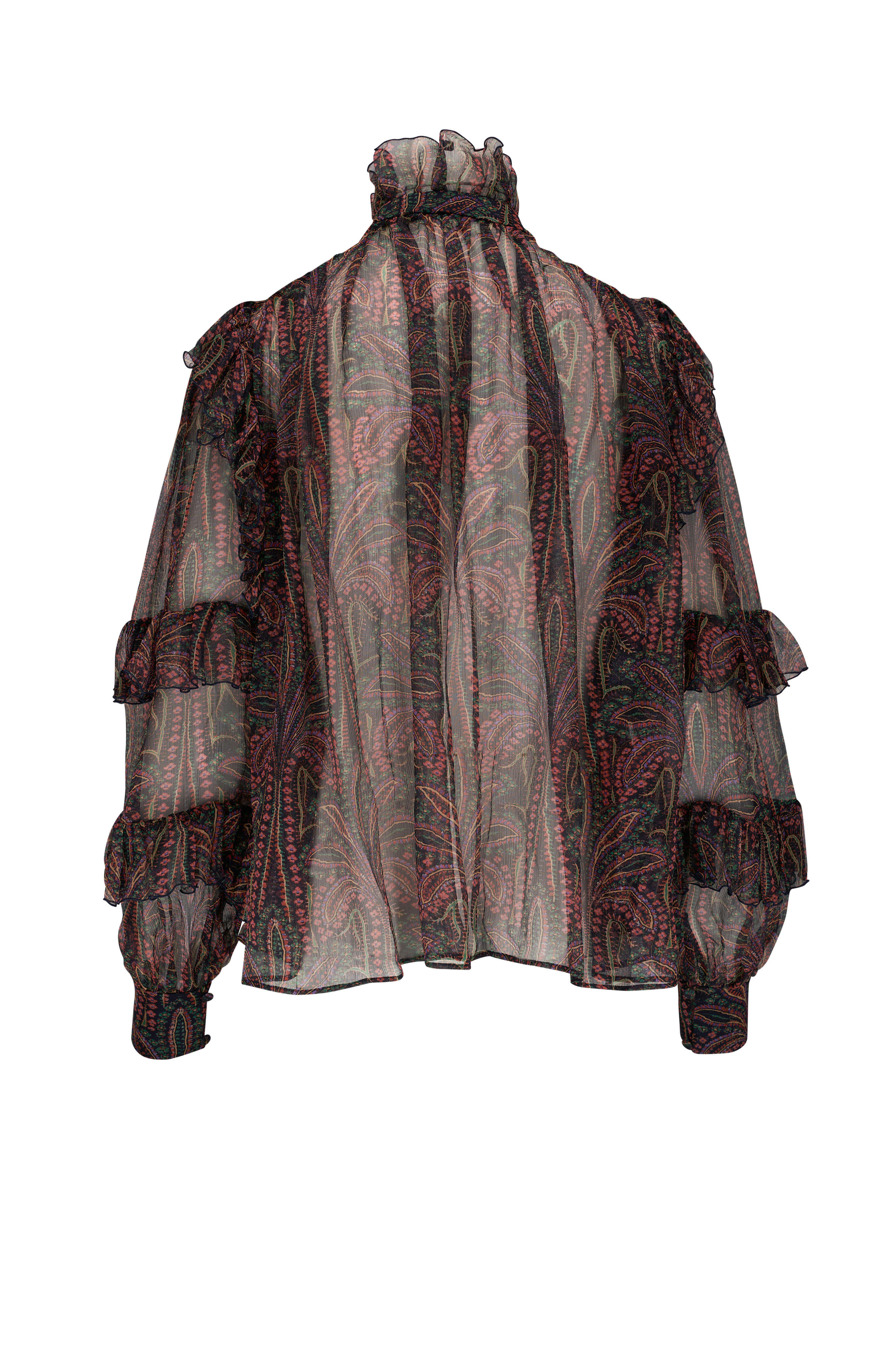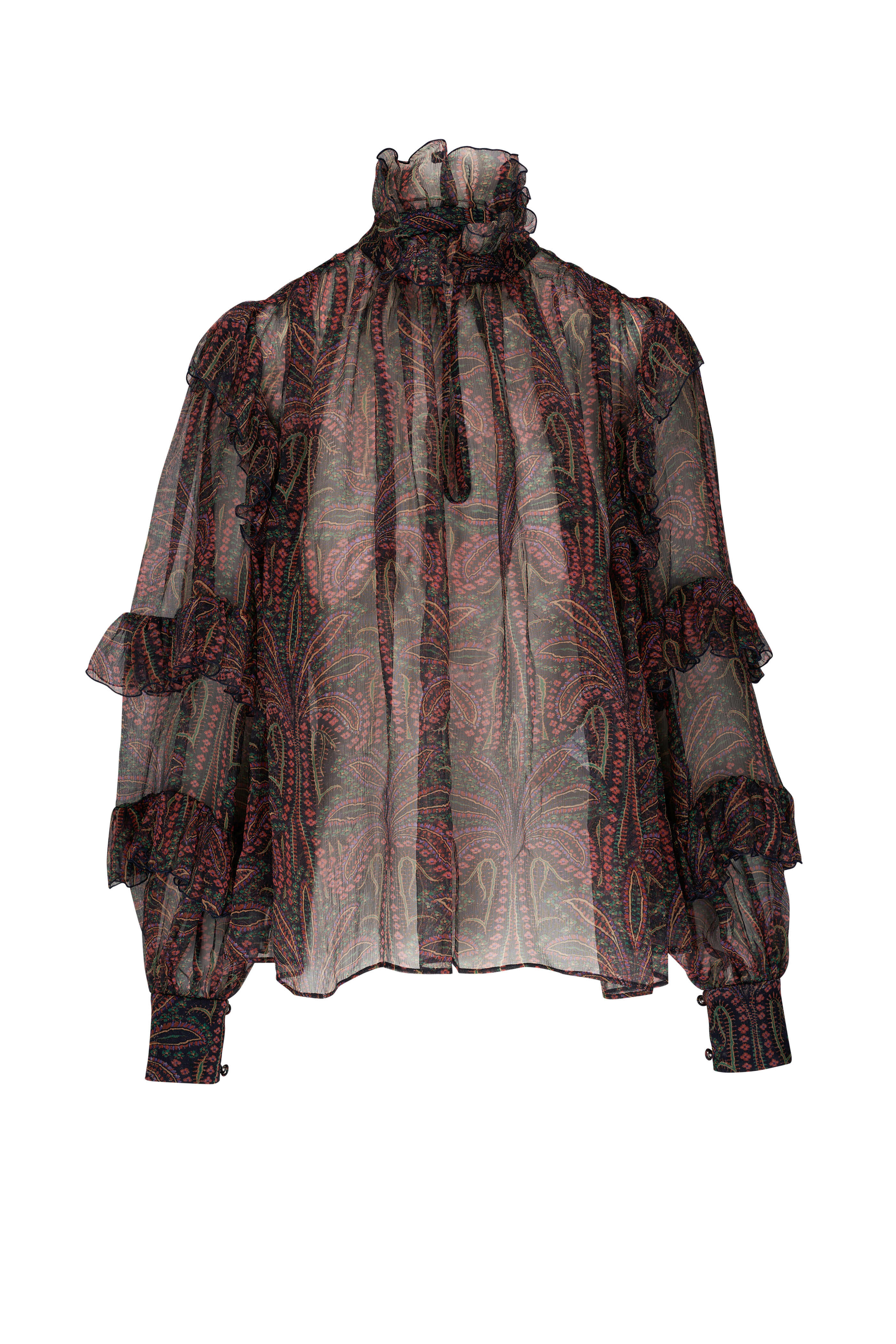 Stand ruffle collar. Front keyhole button closure. Ruffle, blouson sleeves. Double button cuffs. Made in Italy. 100% silk. Dry clean.