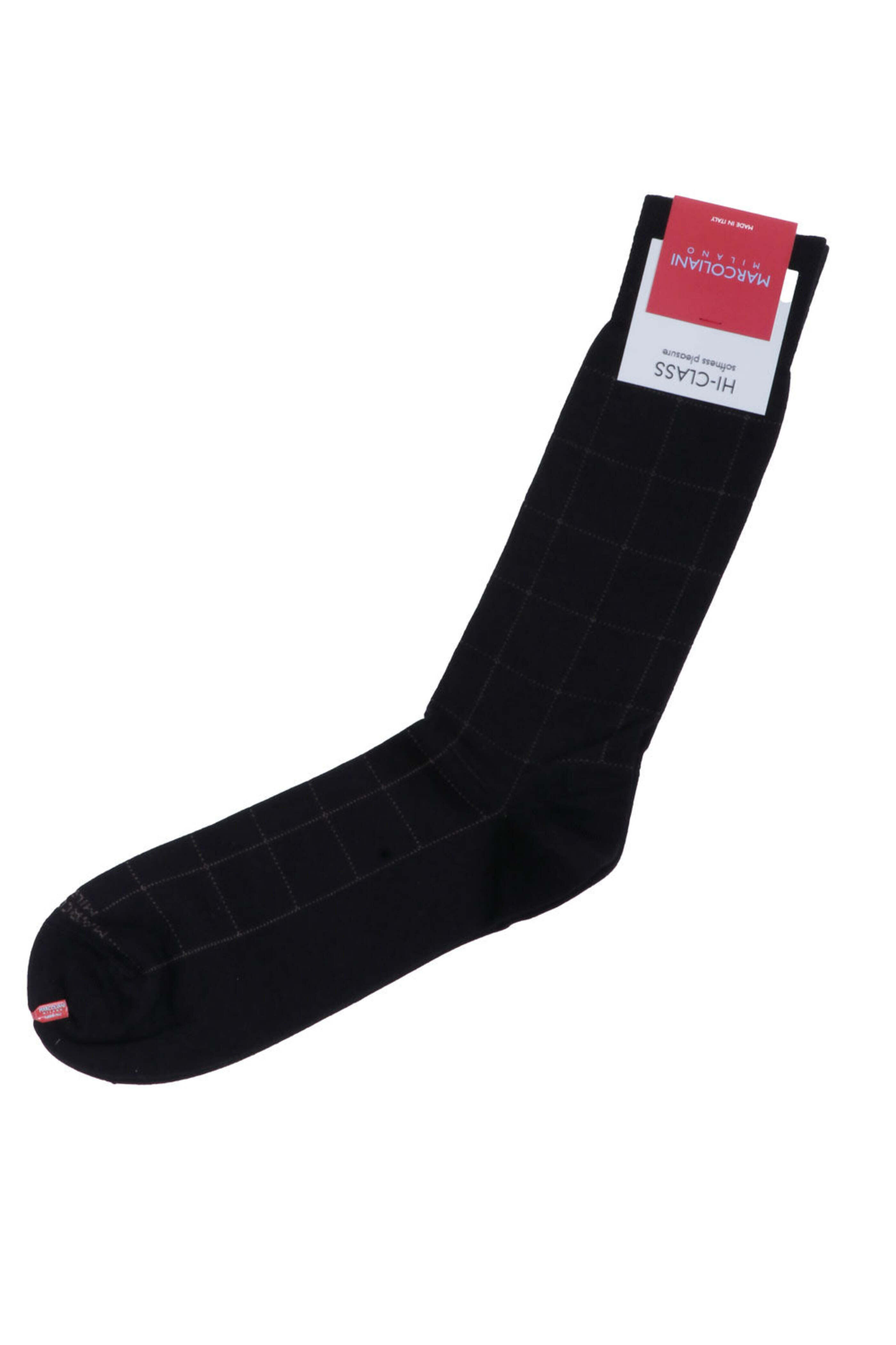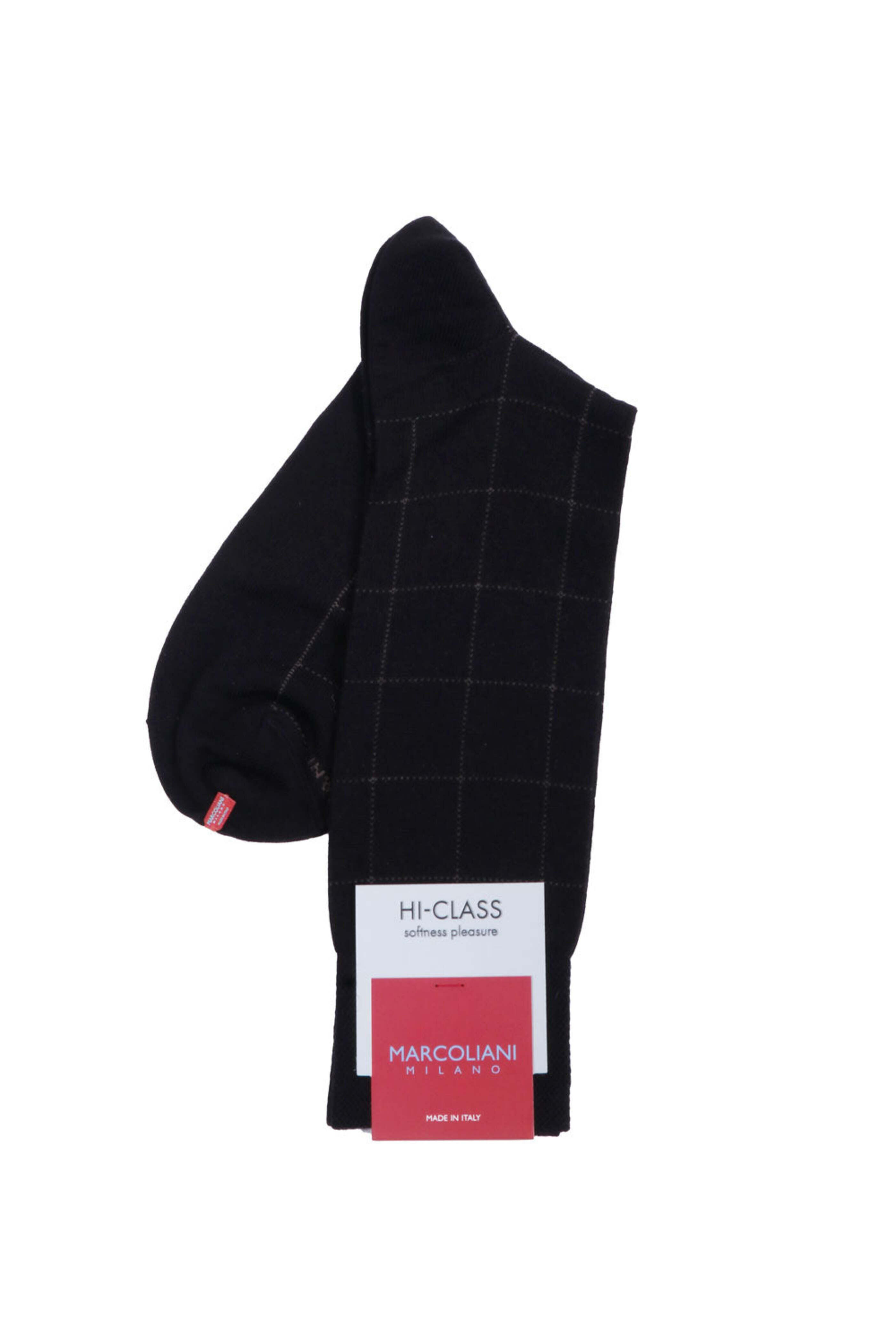 Marcoliani Black Windowpane Midcalf Socks. Midcalf. Hi-Class collection. Made in Italy . 77% Modal, 15% polyamide, 8% cashmere.