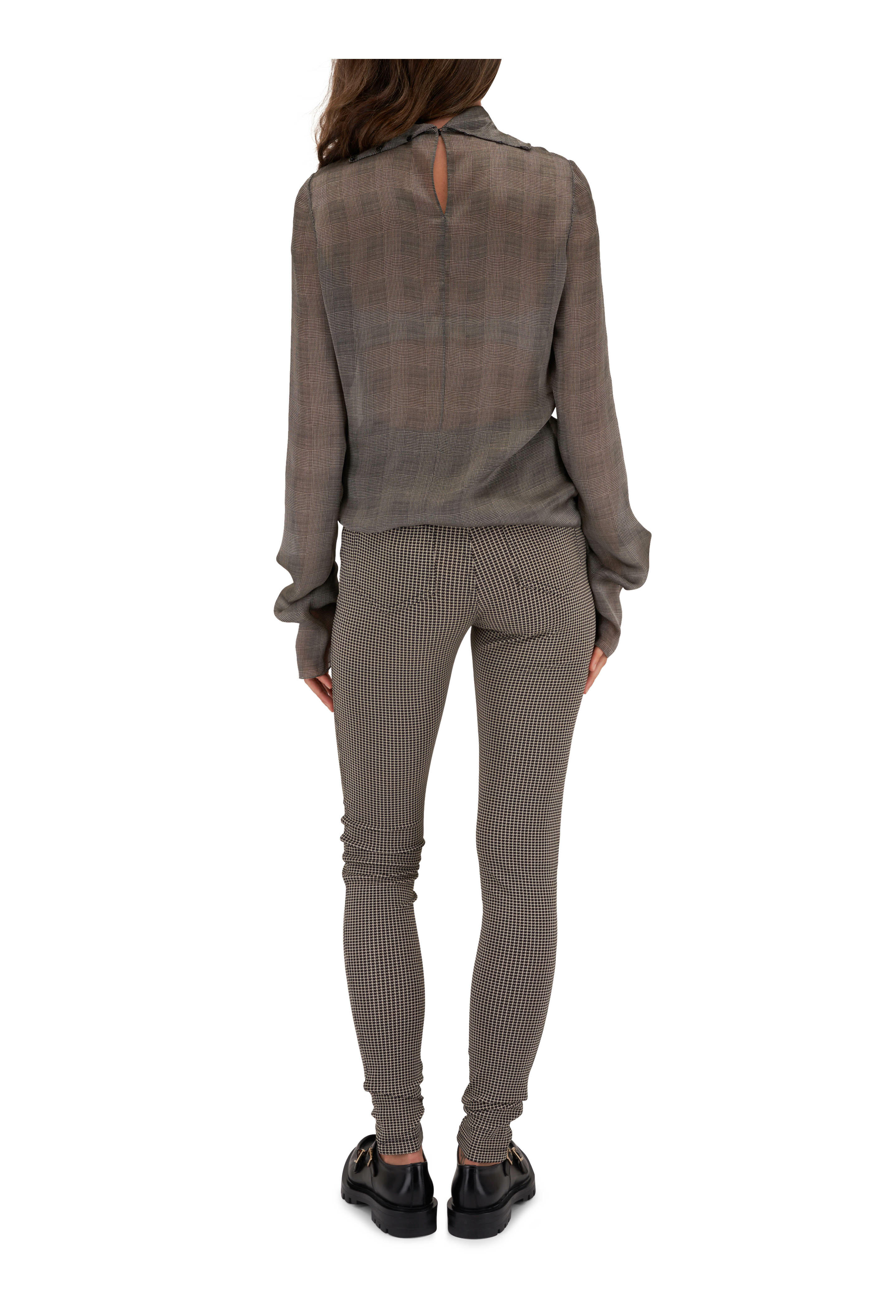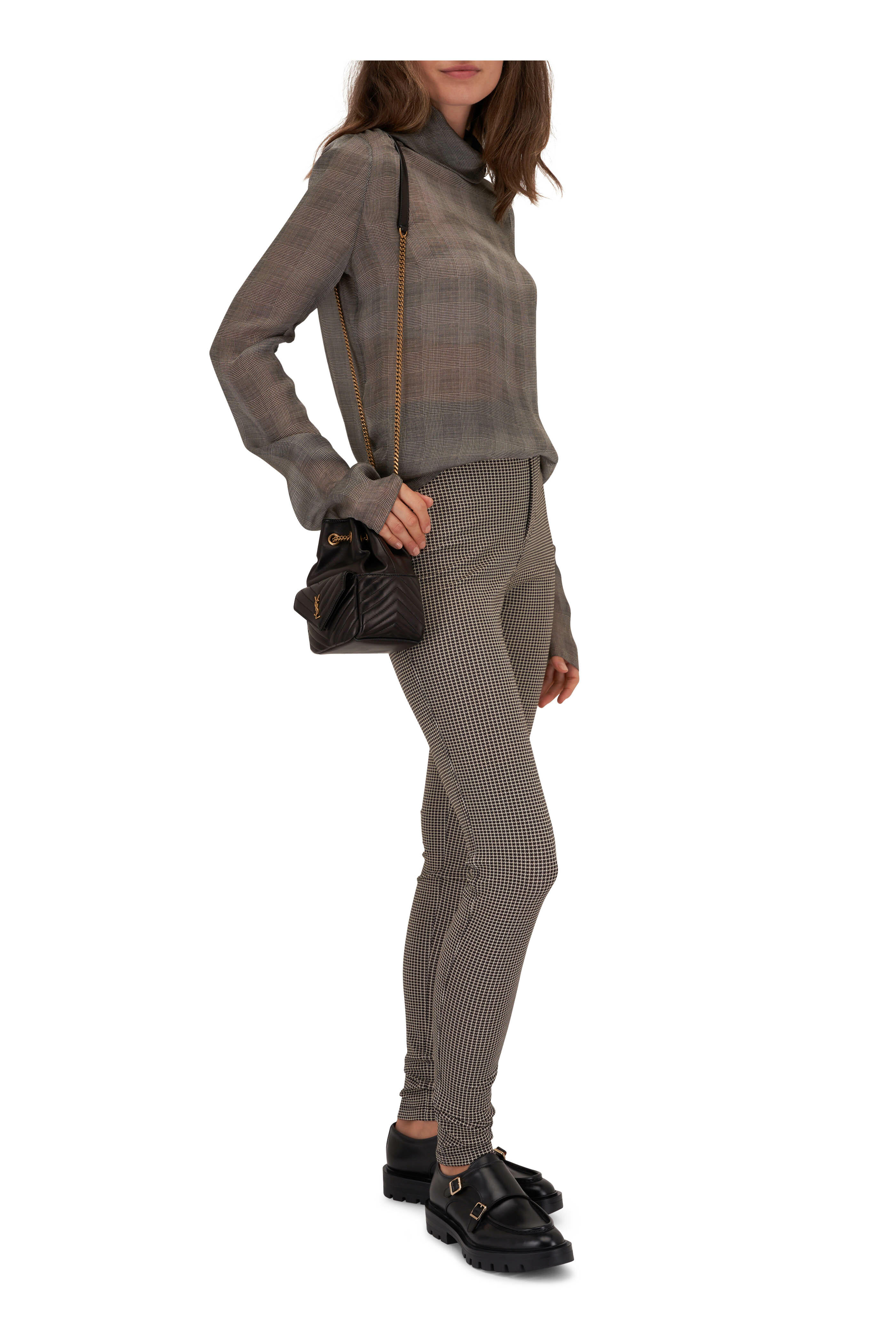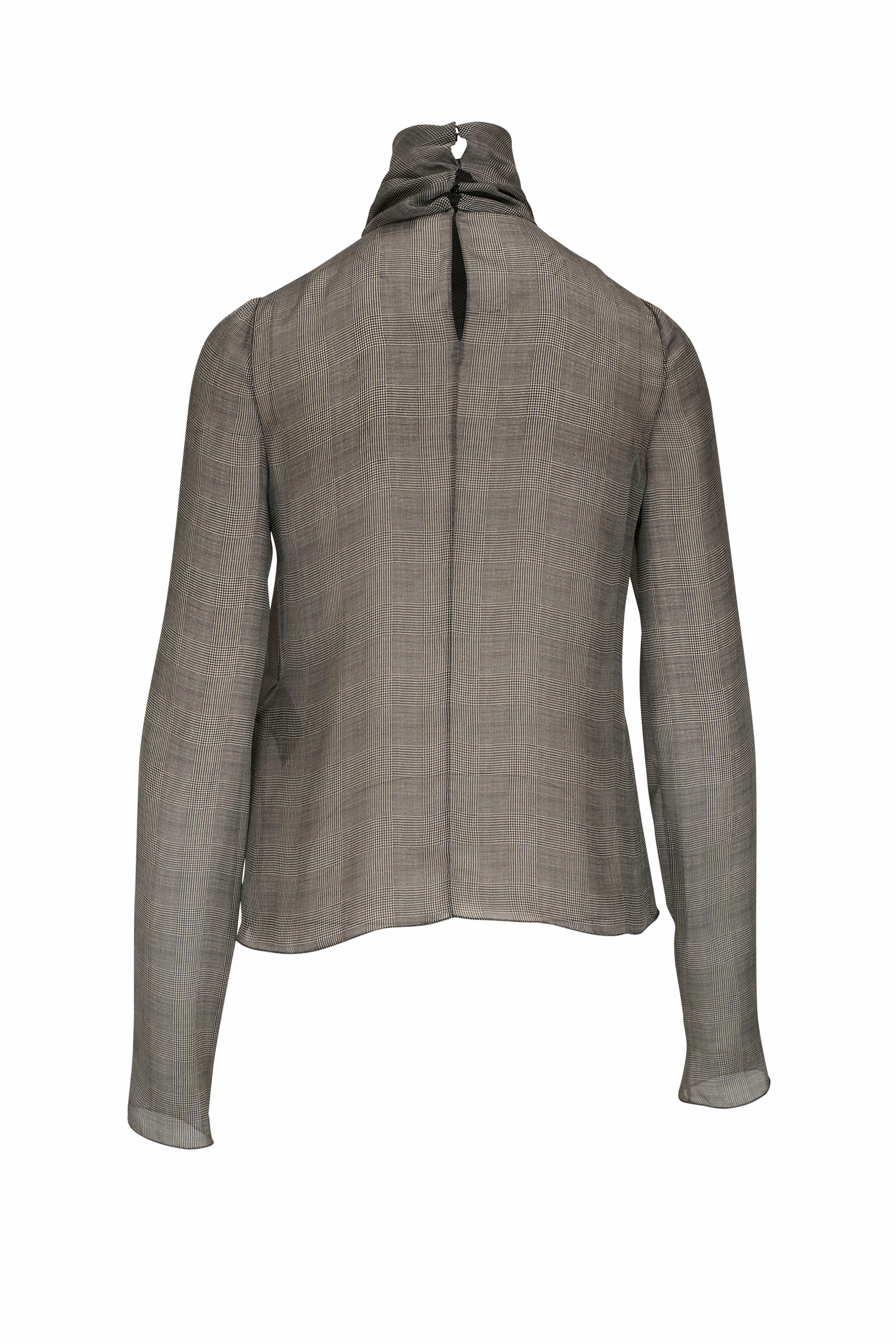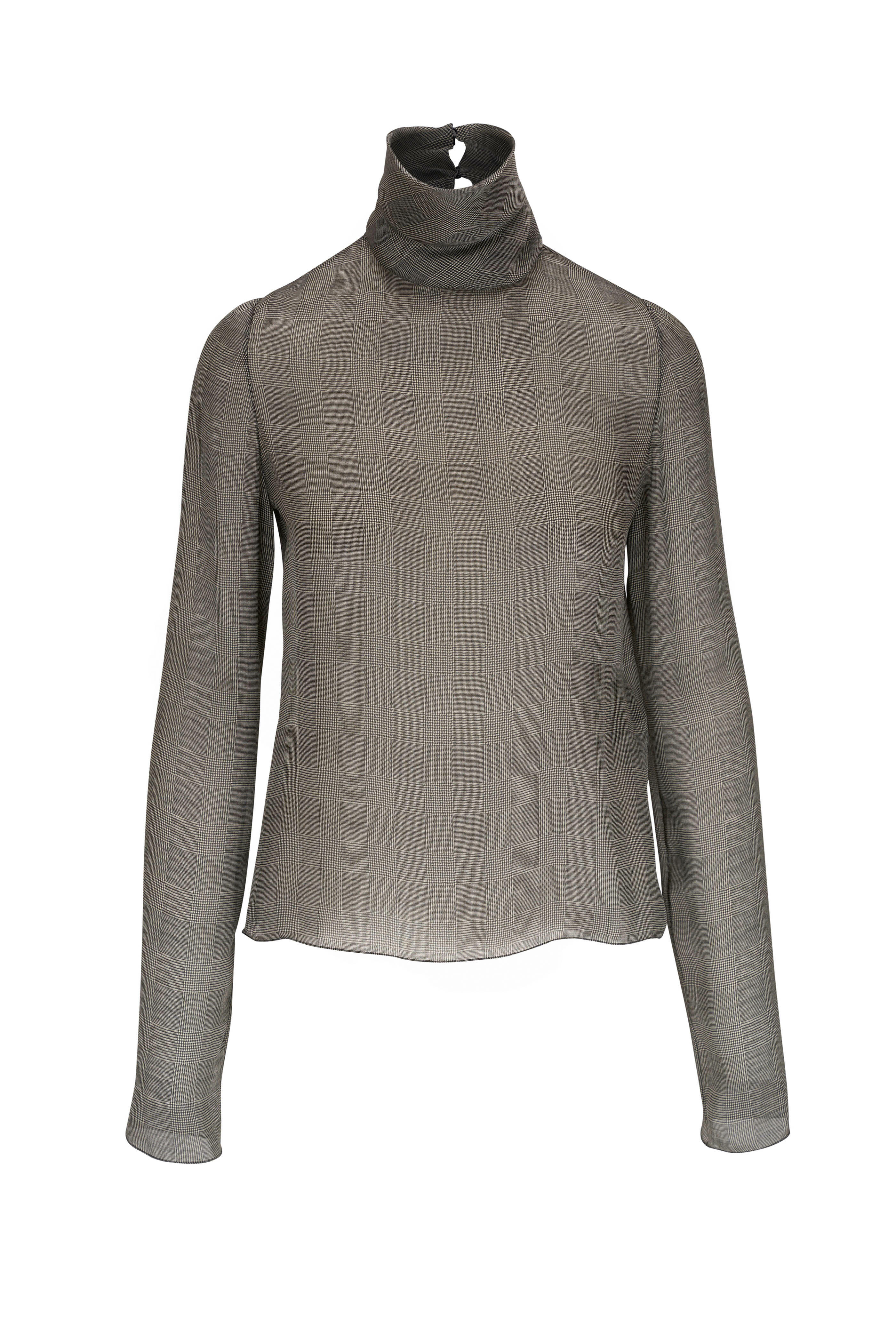 Turtleneck; keyhole back button closure. Pullover style. Straight hem. Made in Italy. 23" shoulder to hem. 100% silk. Dry clean.