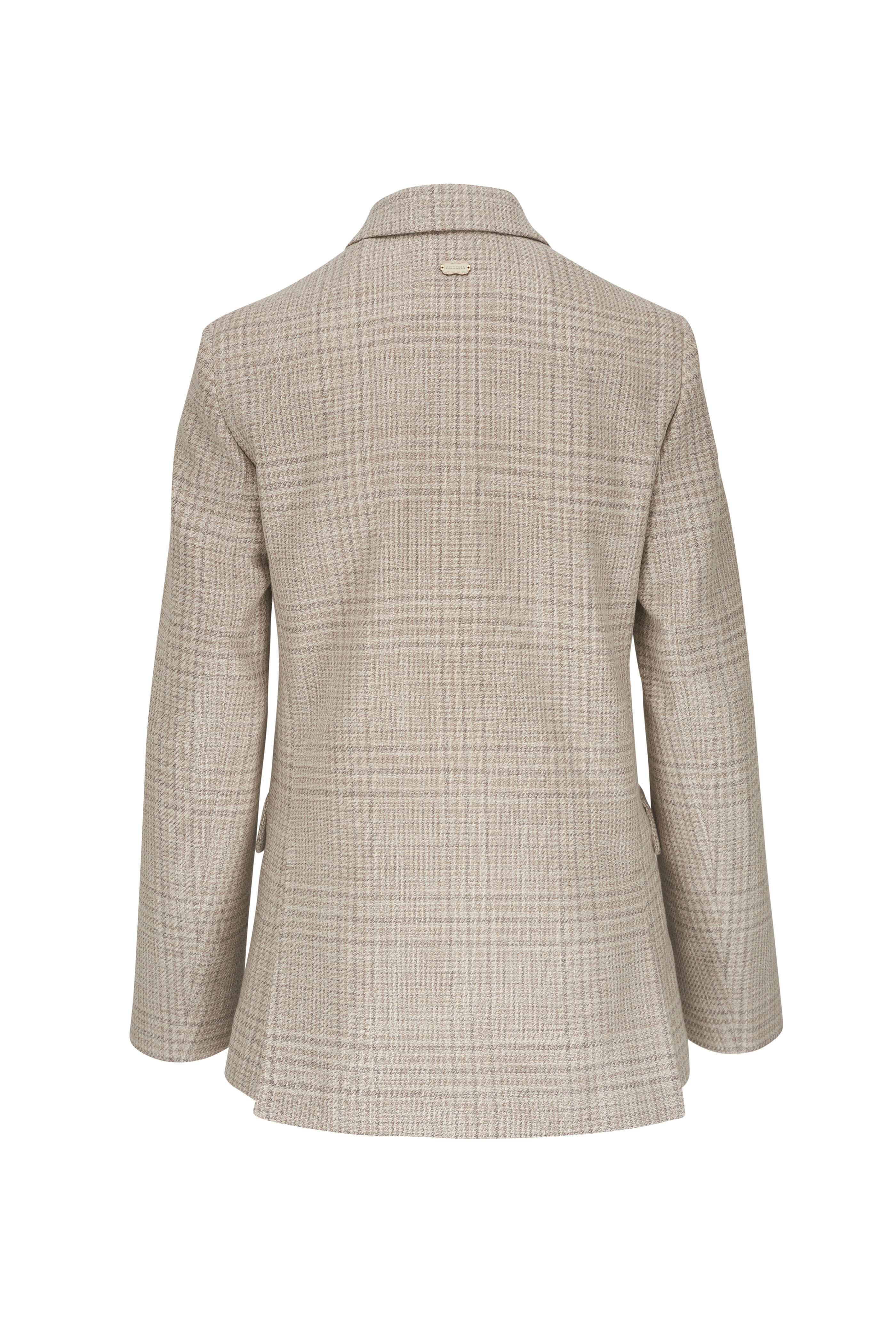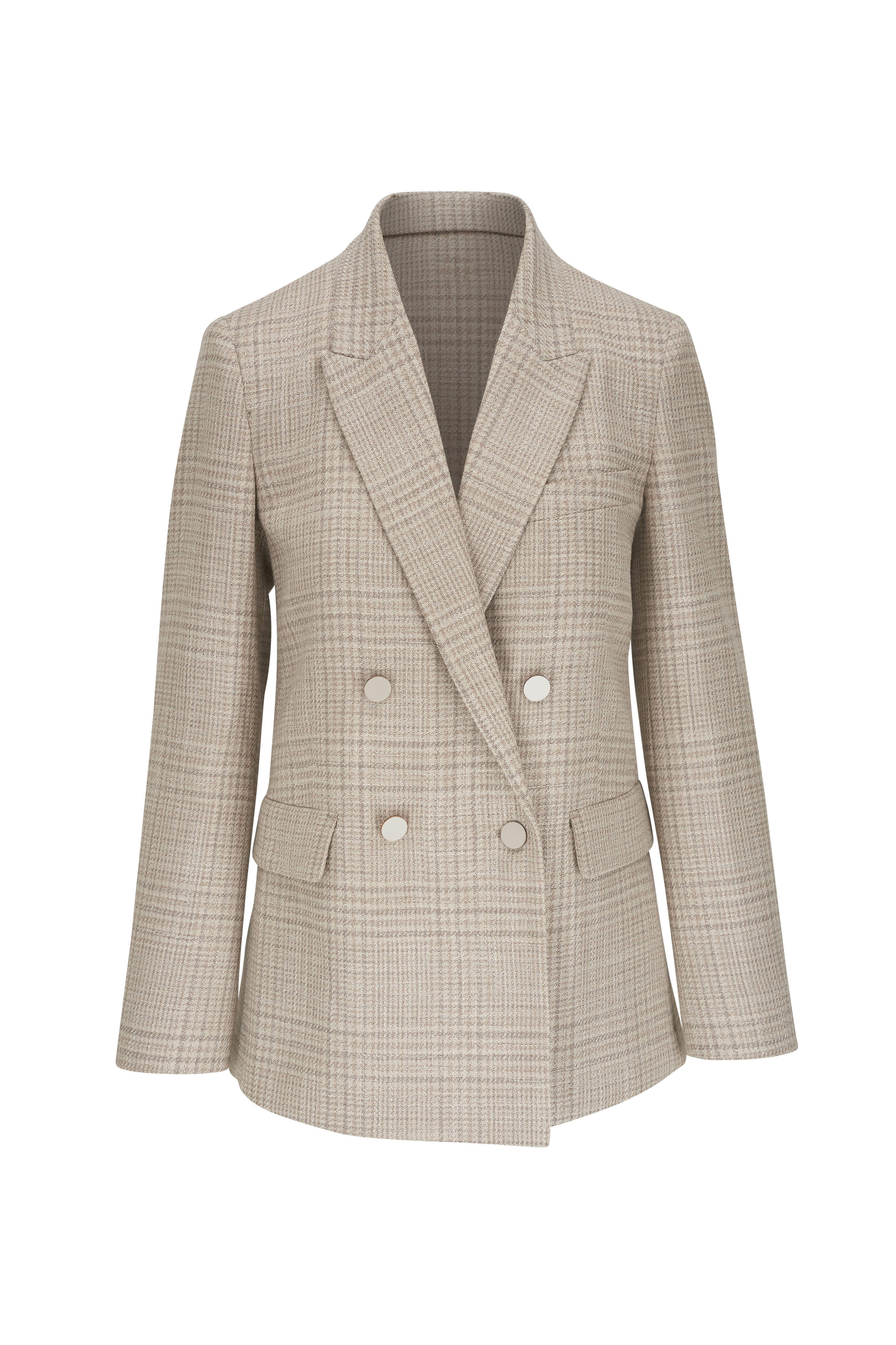 Fully lined. Notched lapels. Double-breasted front closure. Lower waist flap pockets; Chest welt pocket. Double vent. Made in Italy. 88% wool, 12% silk; Lining: 65% viscose, 35% lyocell. Dry clean.