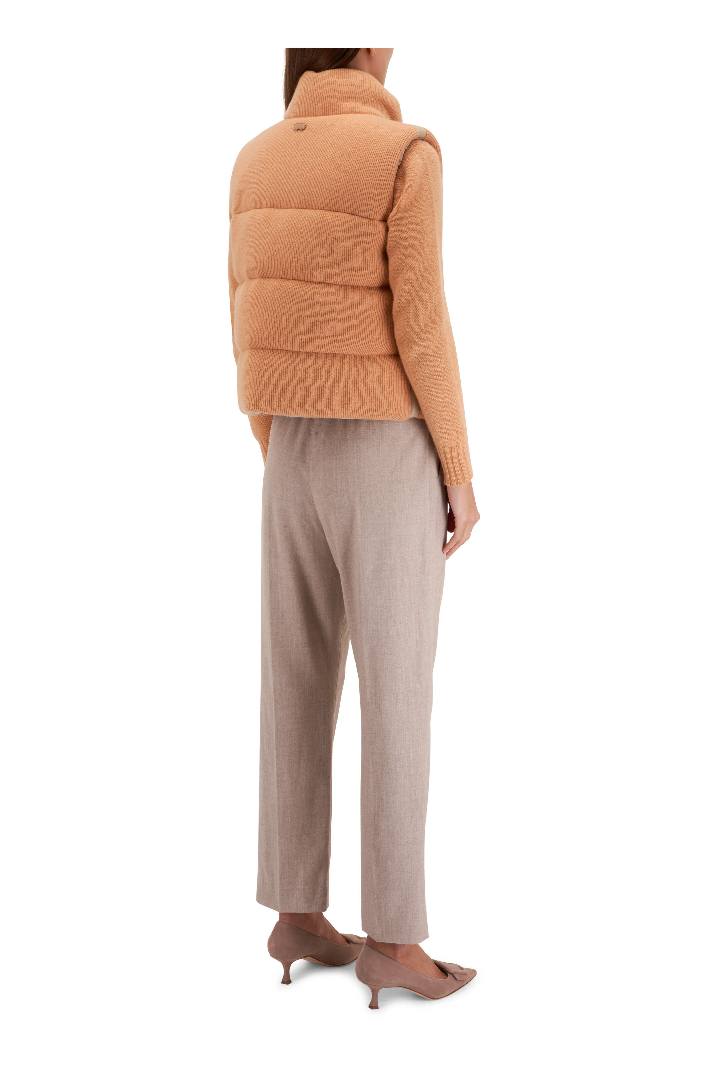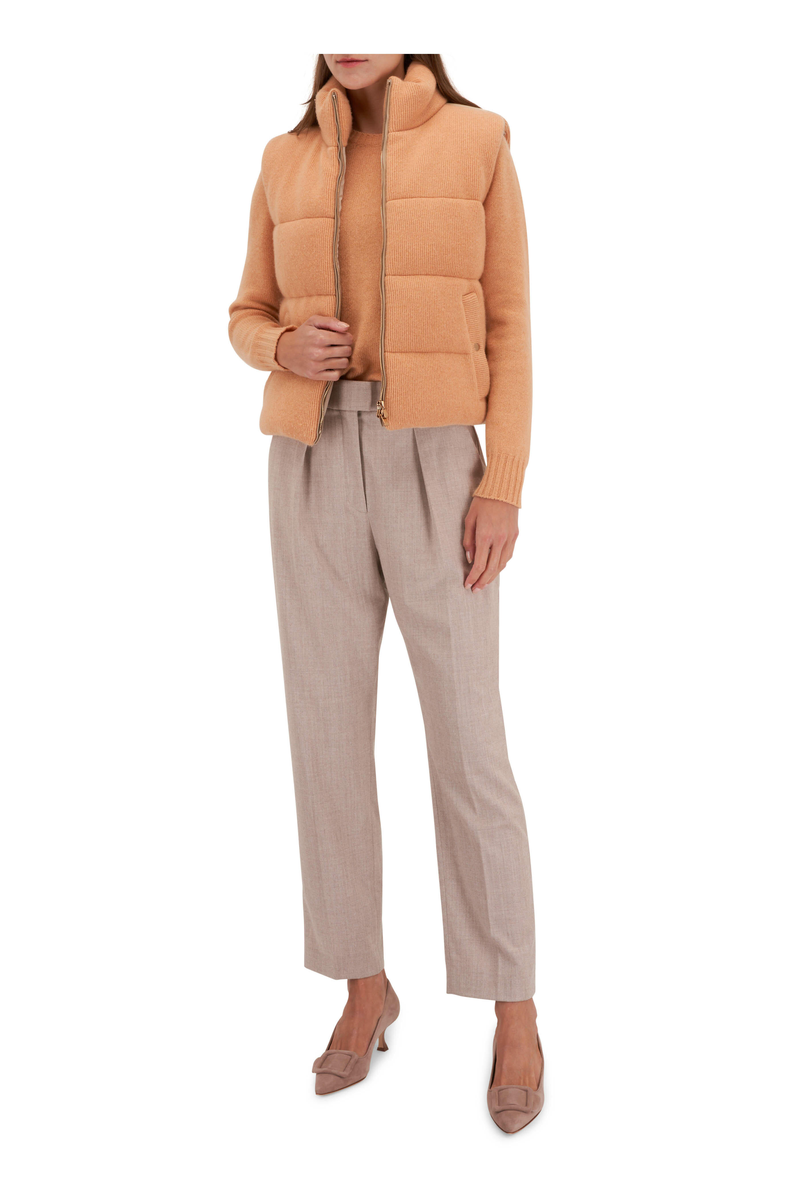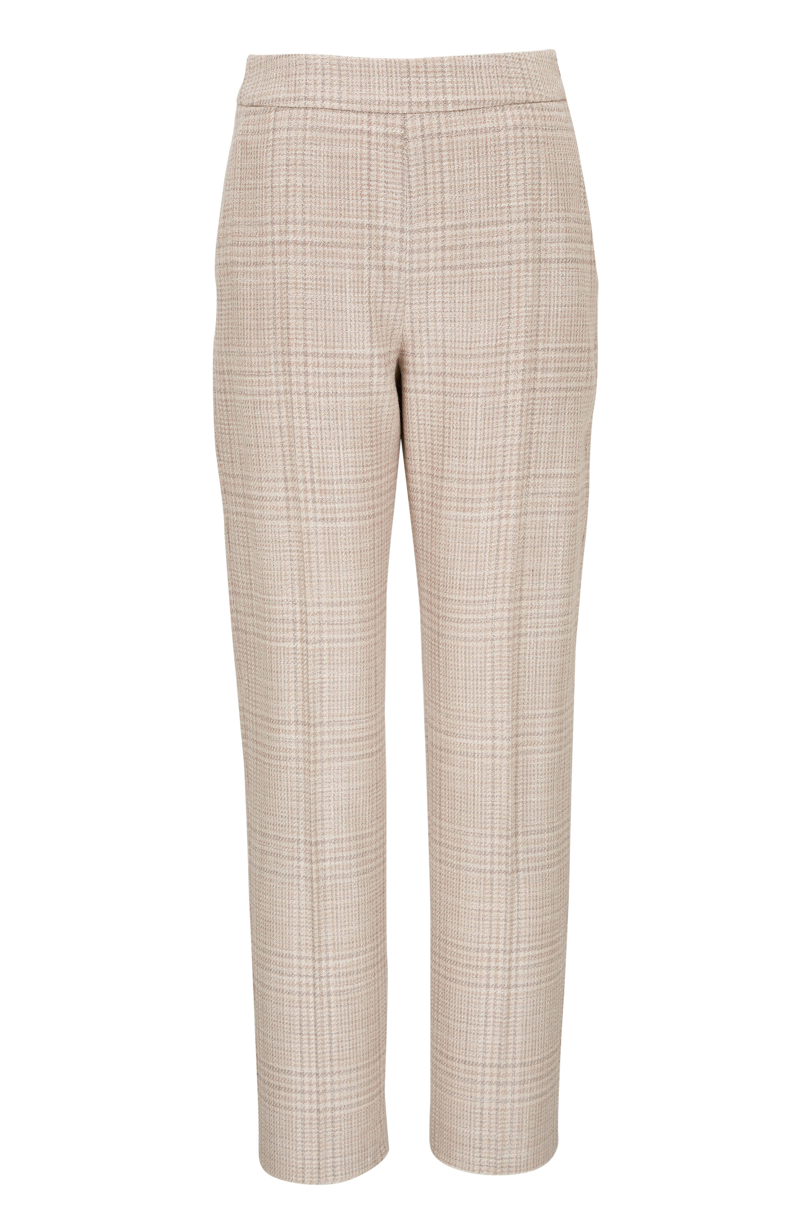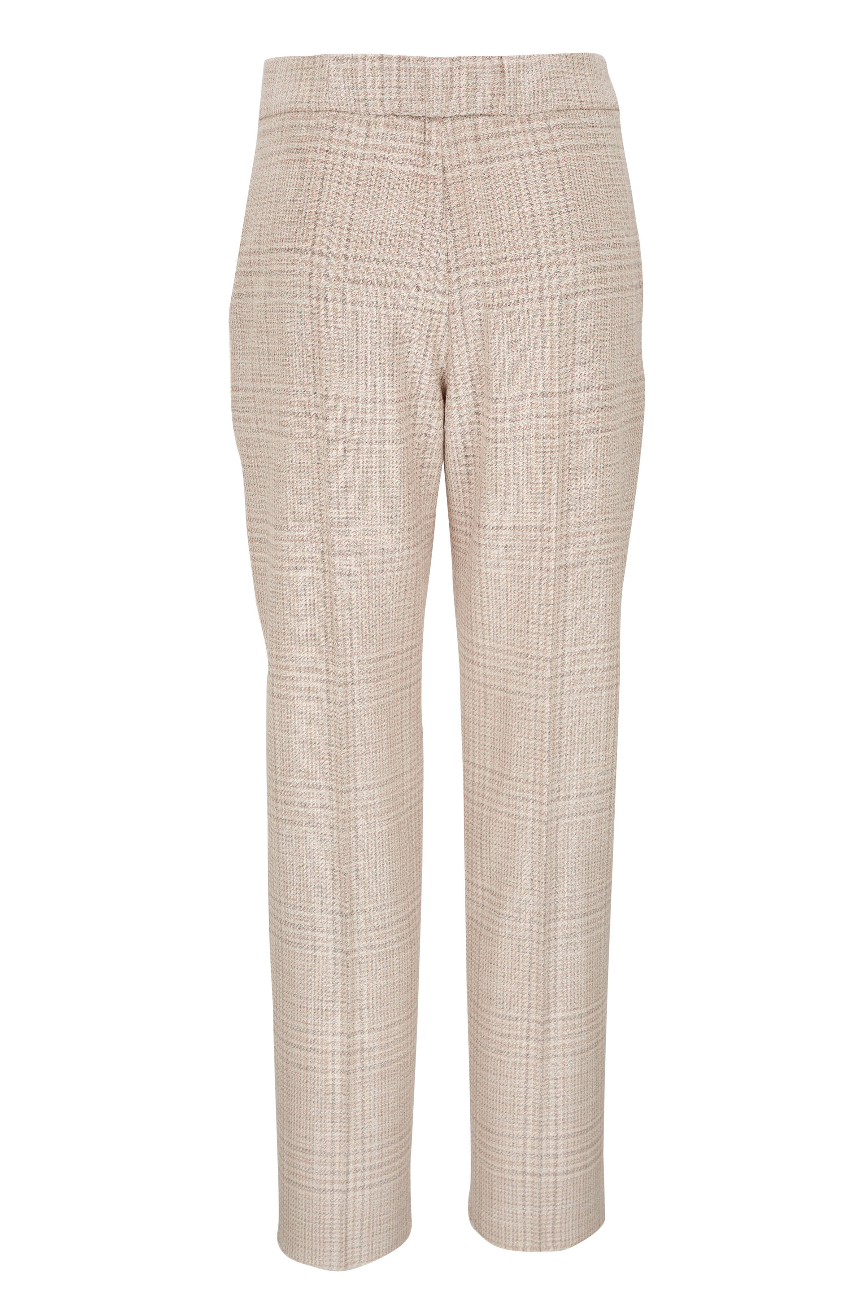 Concealed side zip. Banded waist. Side slip pockets. Creased front seams. Made in Italy. Rise: 12”. Inseam: 30”. 88% wool, 12% silk. Dry clean.