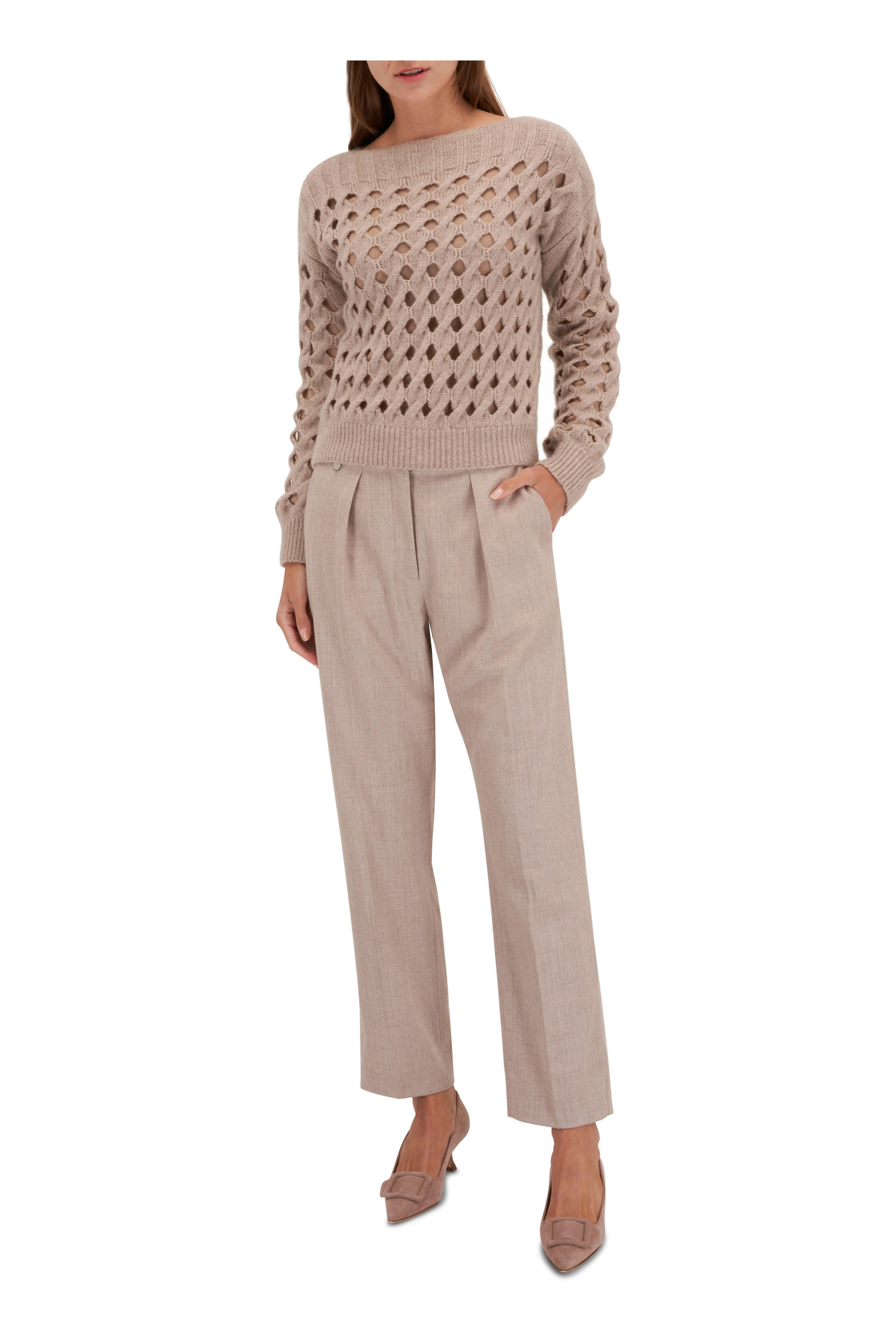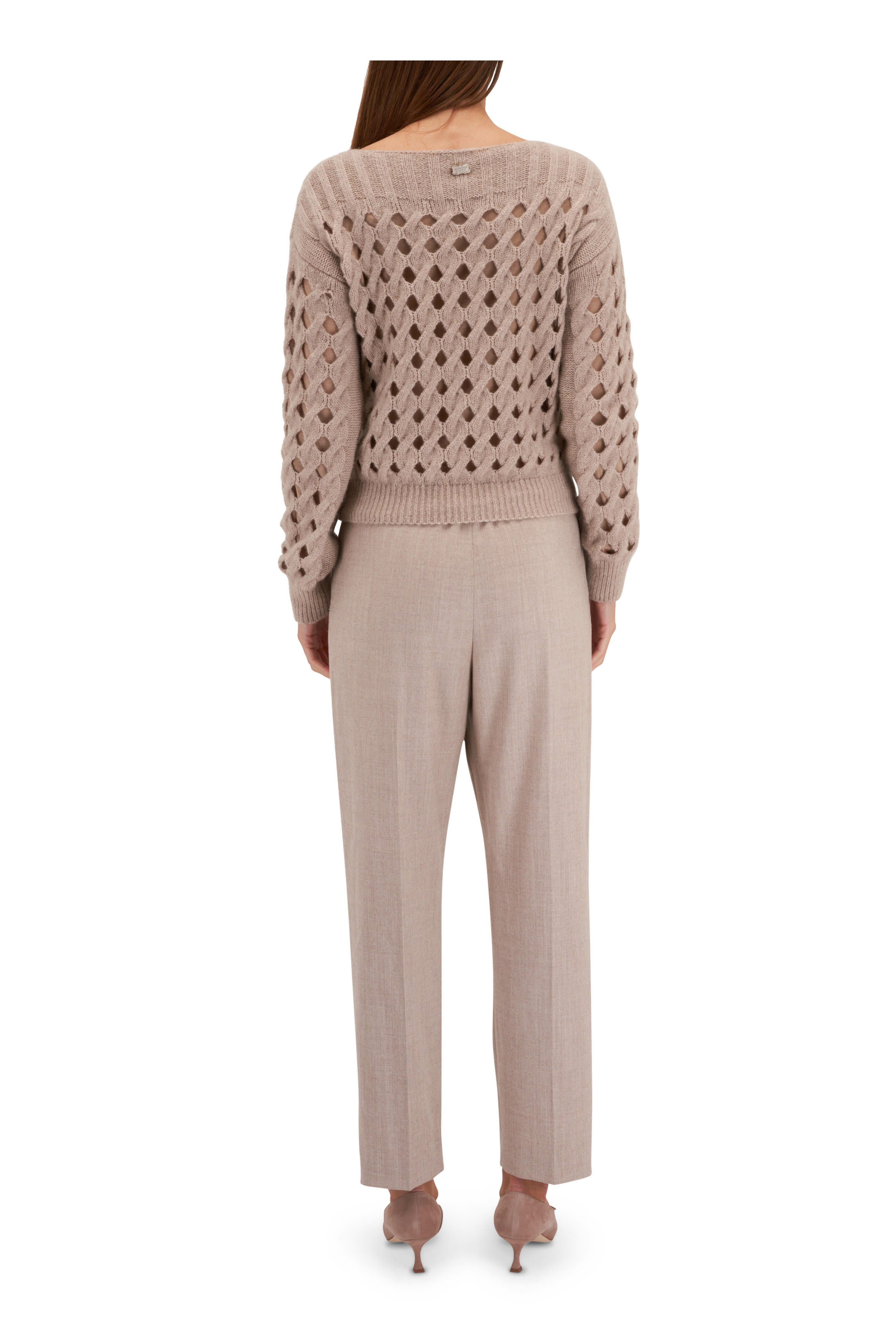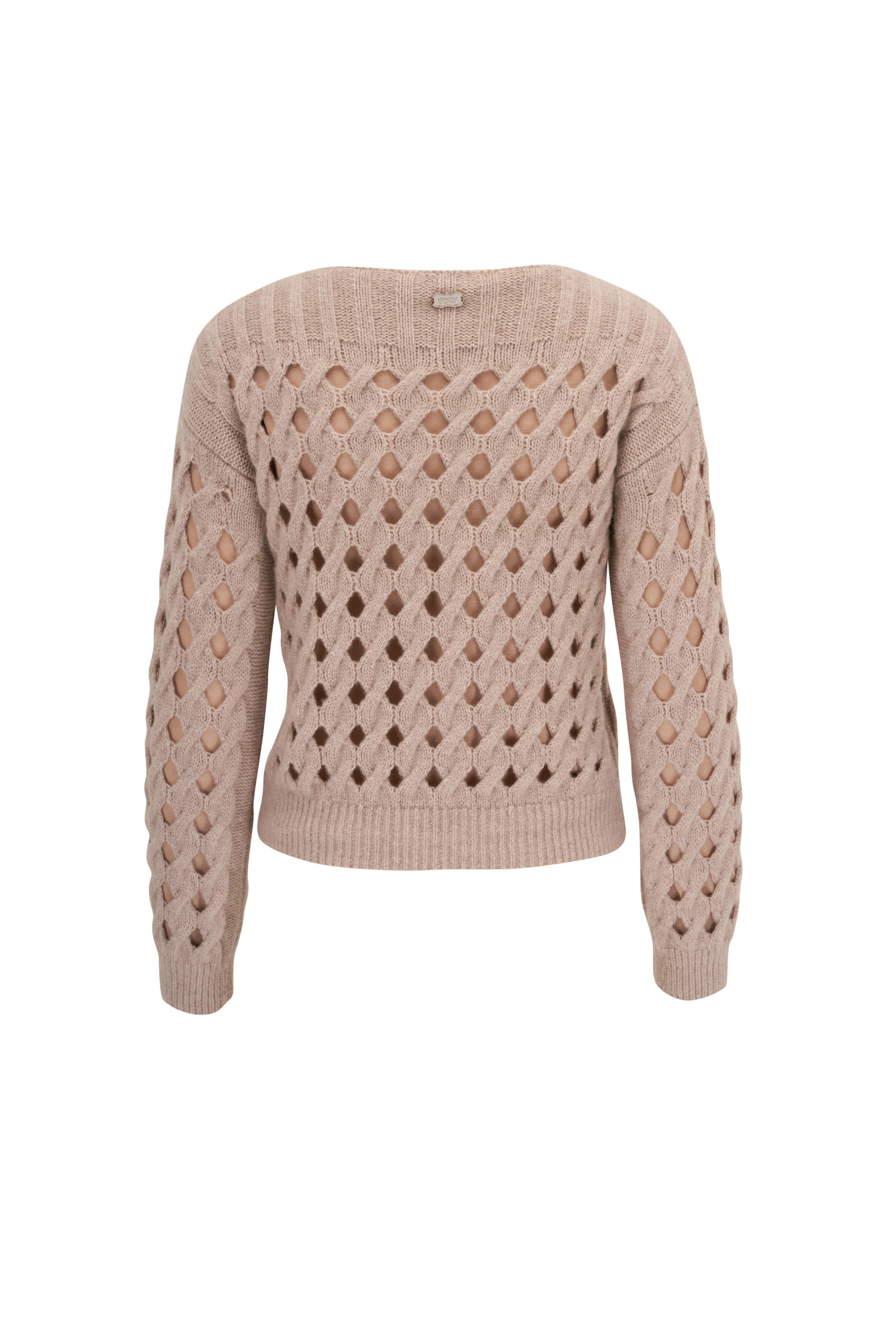 Bateau neckline. Allover open knit detail. Double layered. Ribbed trim. Made in Italy. 74% cashmere, 26% silk; lining: 70% wool, 30% silk. Dry clean.