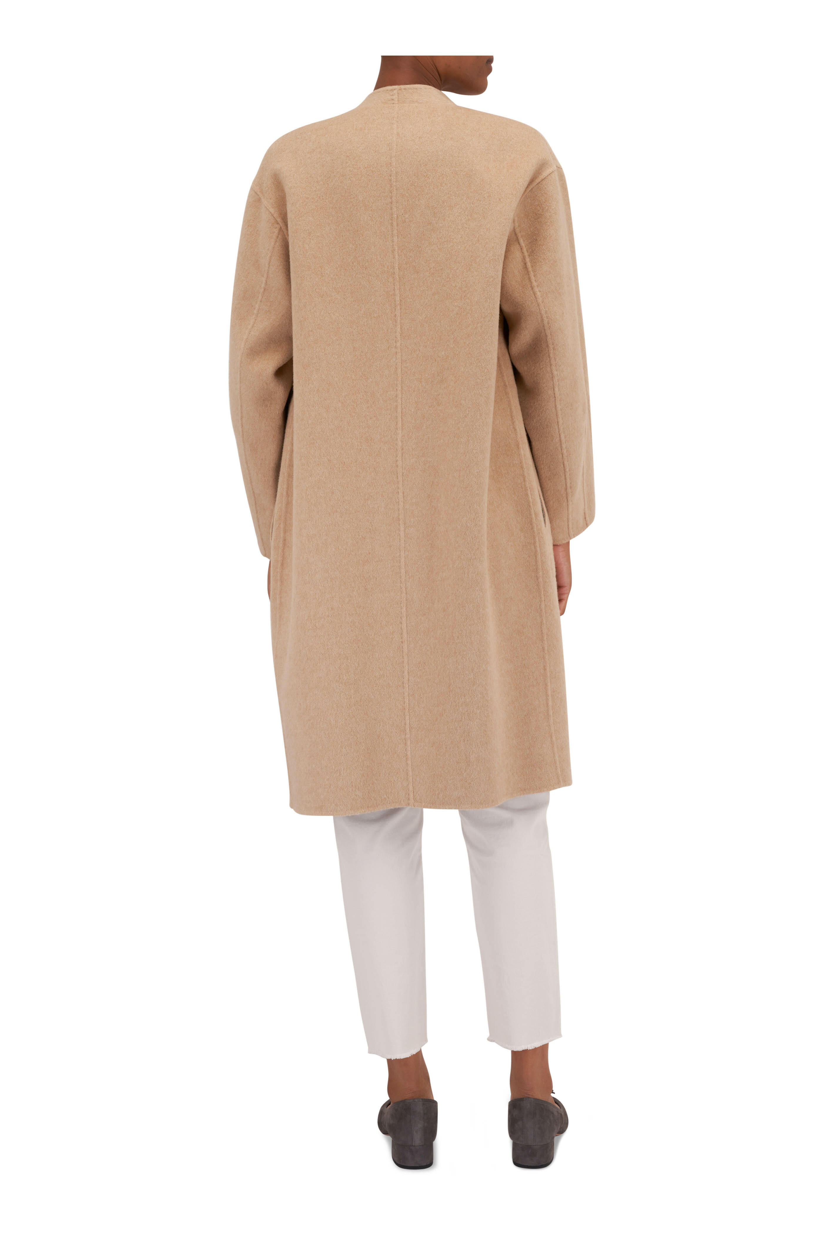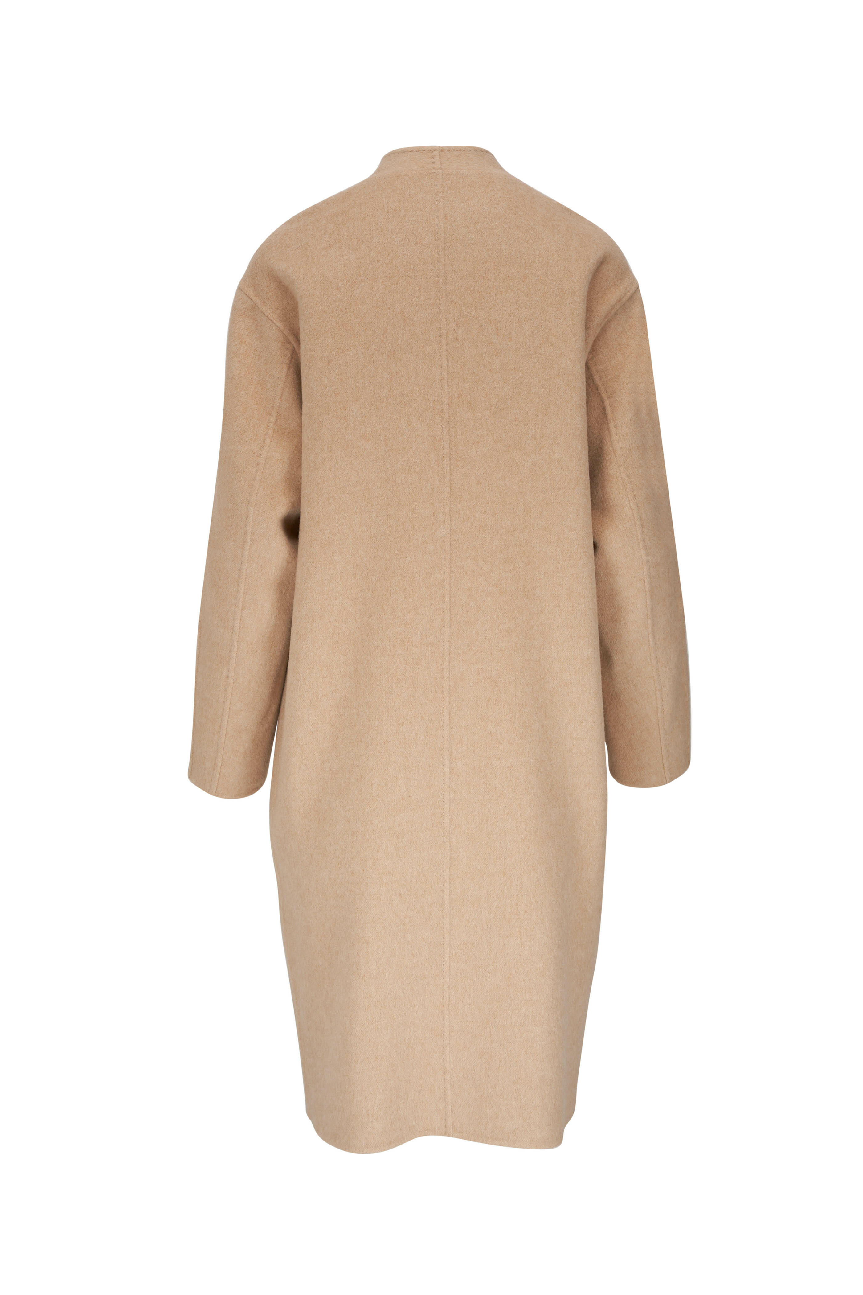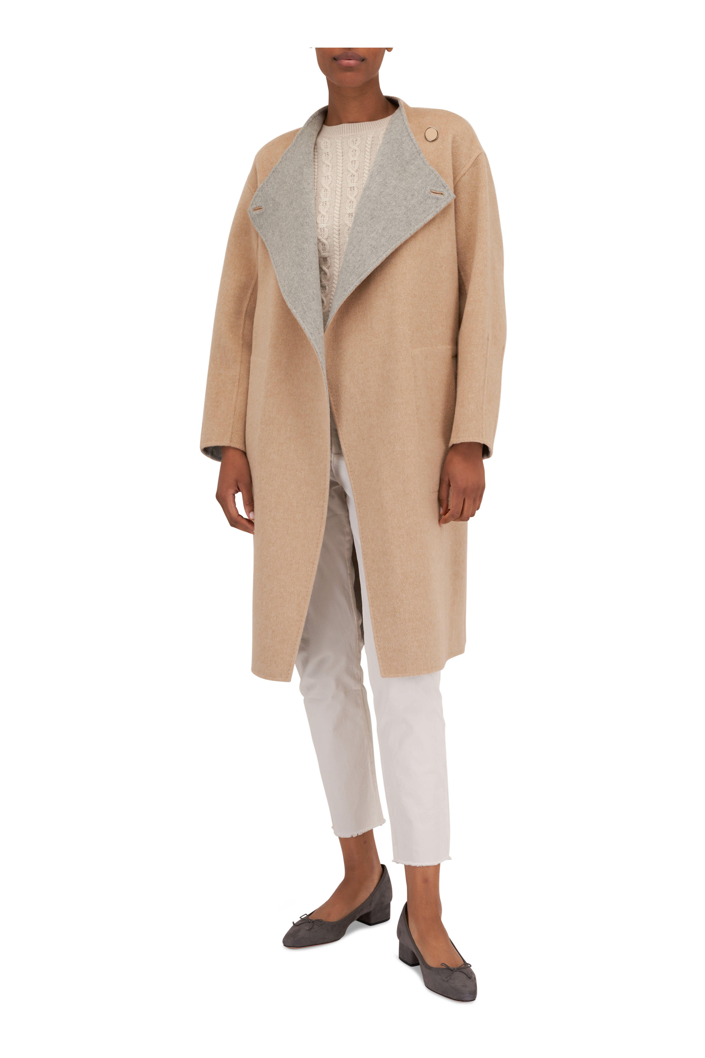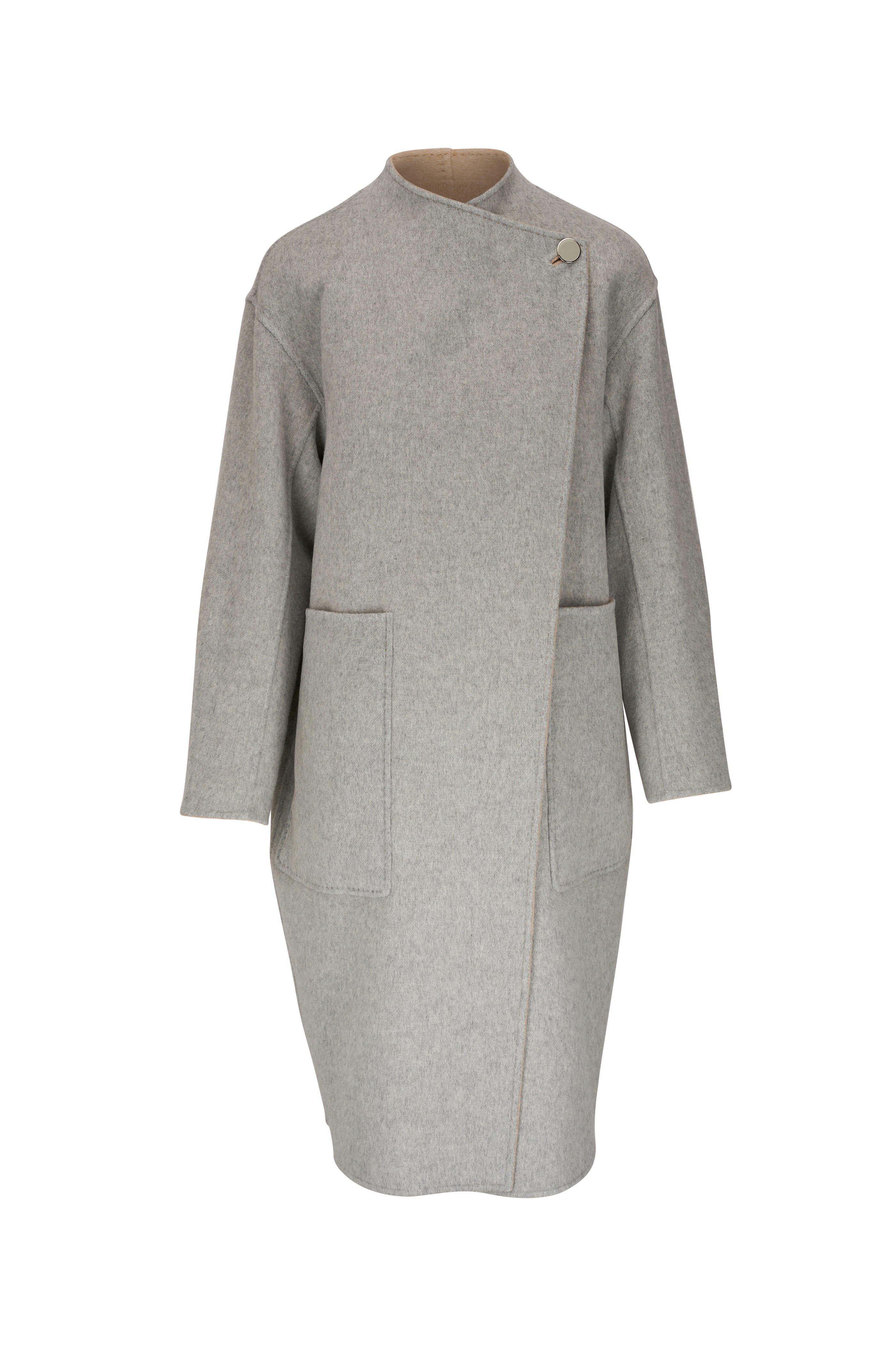 Asymmetric single neck button closure. Drop shoulders. Lower welt pockets; reverse to patch pockets. Pick stitch detailing. Imported. 41" shoulder to hem (Size Small). Oversized, column silhouette. Reversible for wearing as dune beige or heather gray. 91% wool, 9% cashmere. Dry clean.