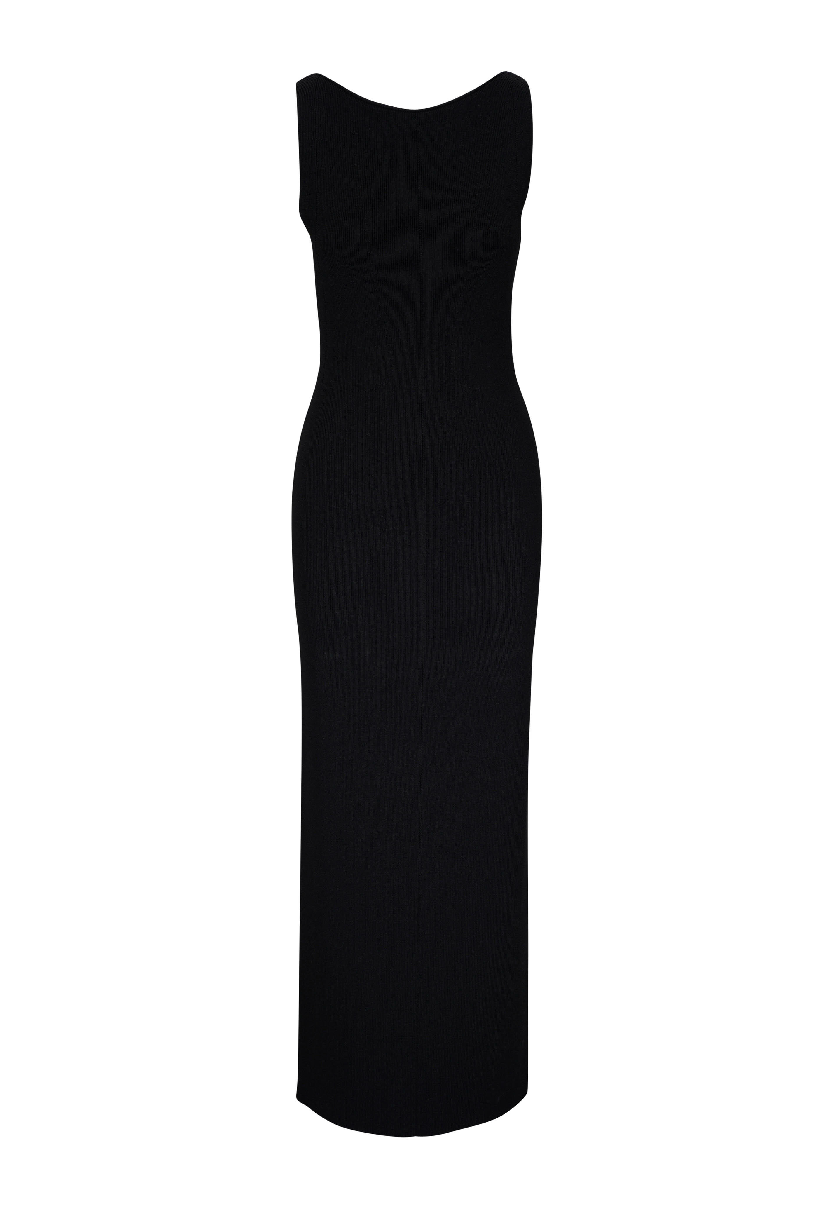 Bateau neckline. Slip-on style. Elongated arm holes. Back slit at hem. Made in Italy. Approx. 10" armhole drop. Approx. 56" shoulder to hem. Falls just above the ankle. 74% viscose, 15% polyester, 1% elastane. Dry clean.