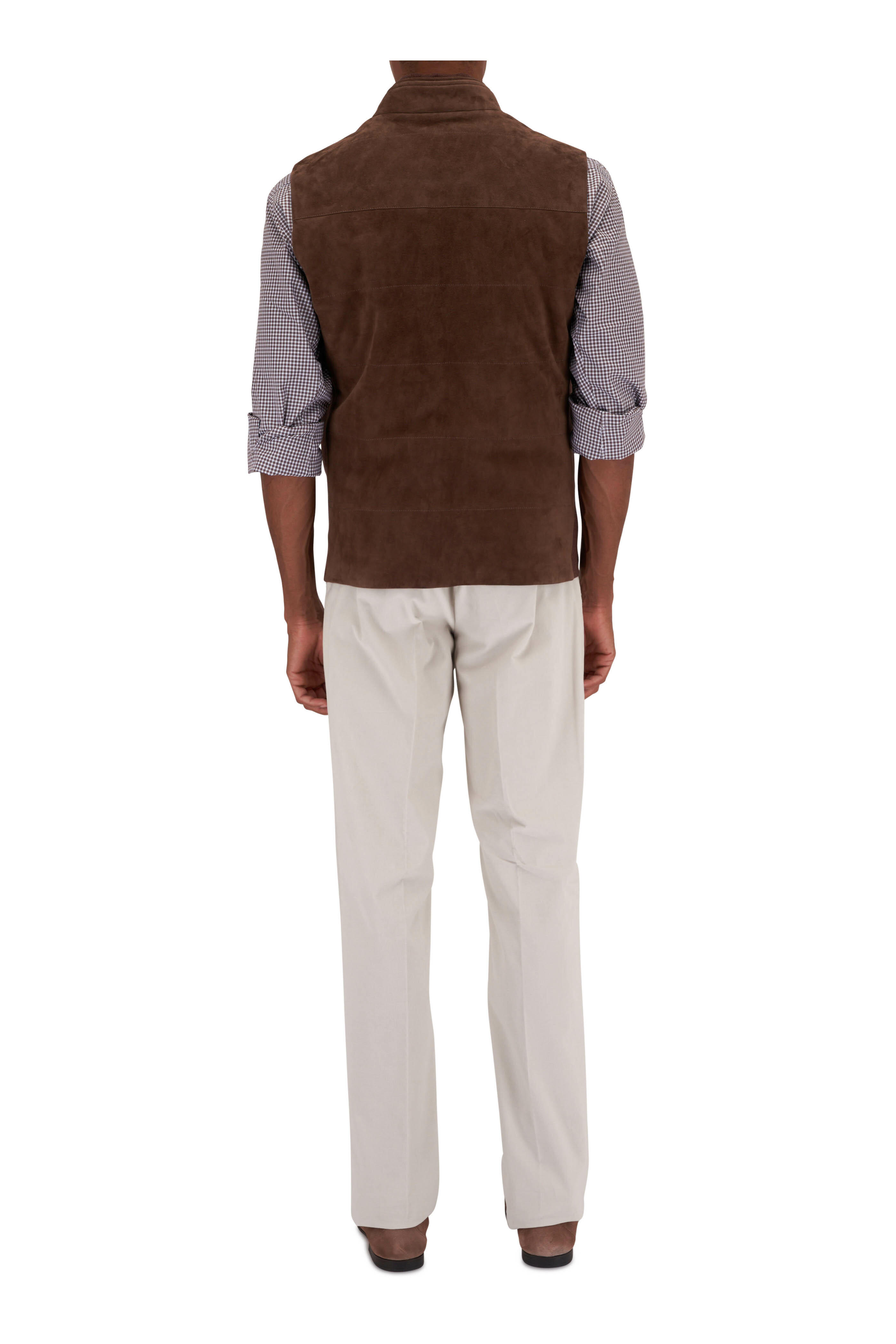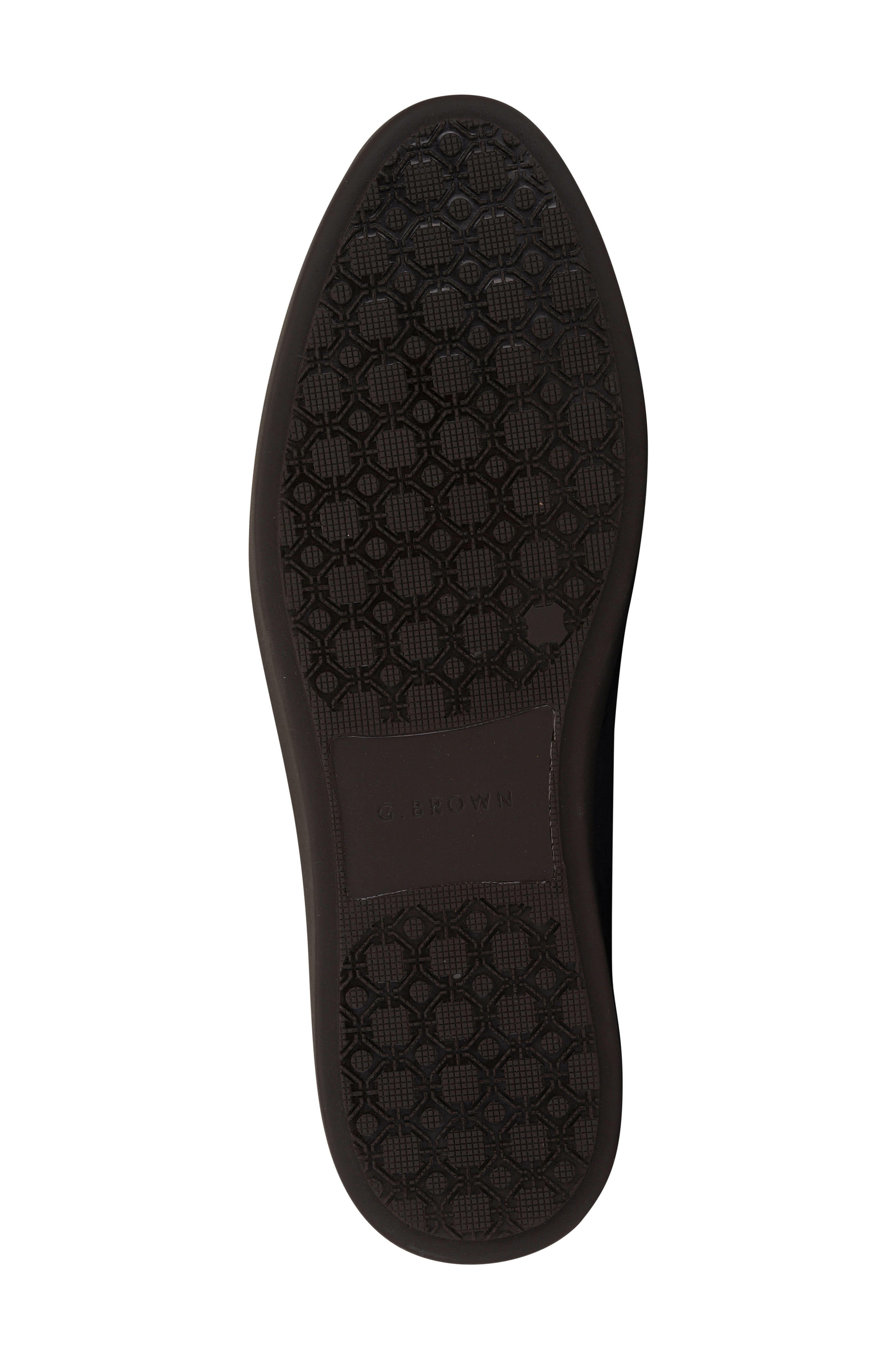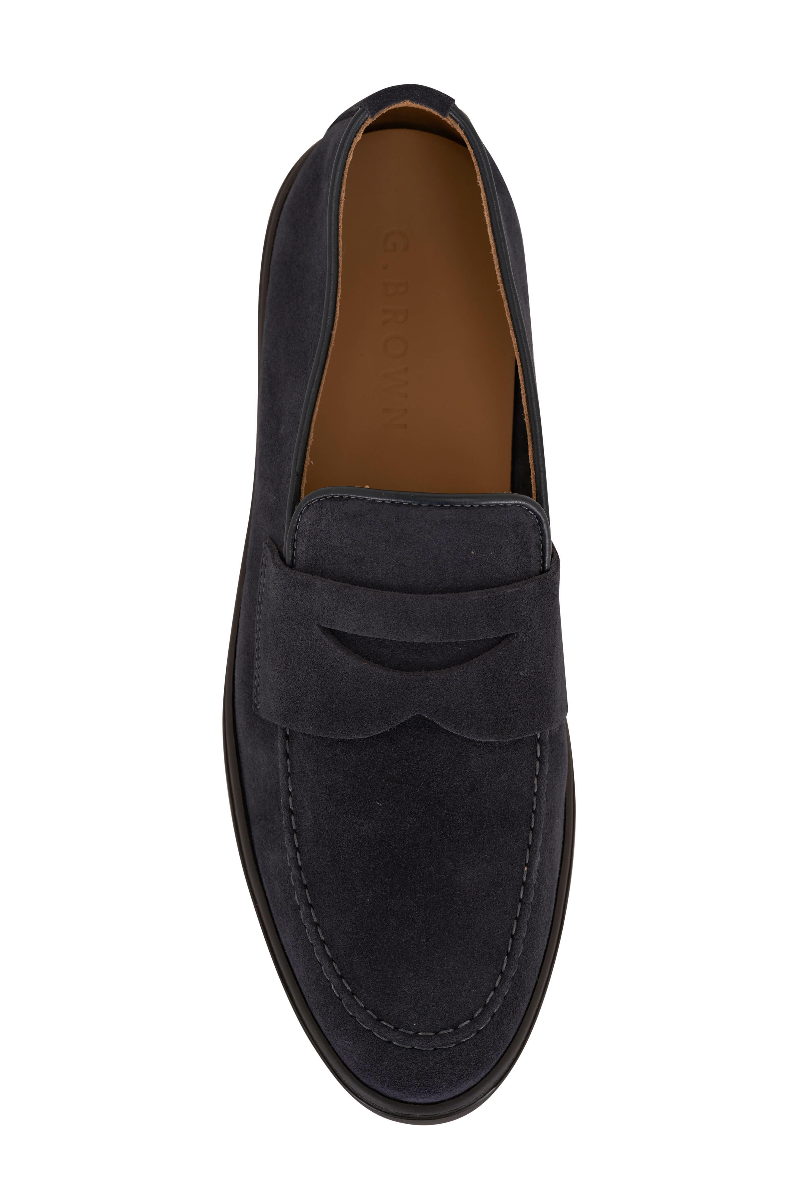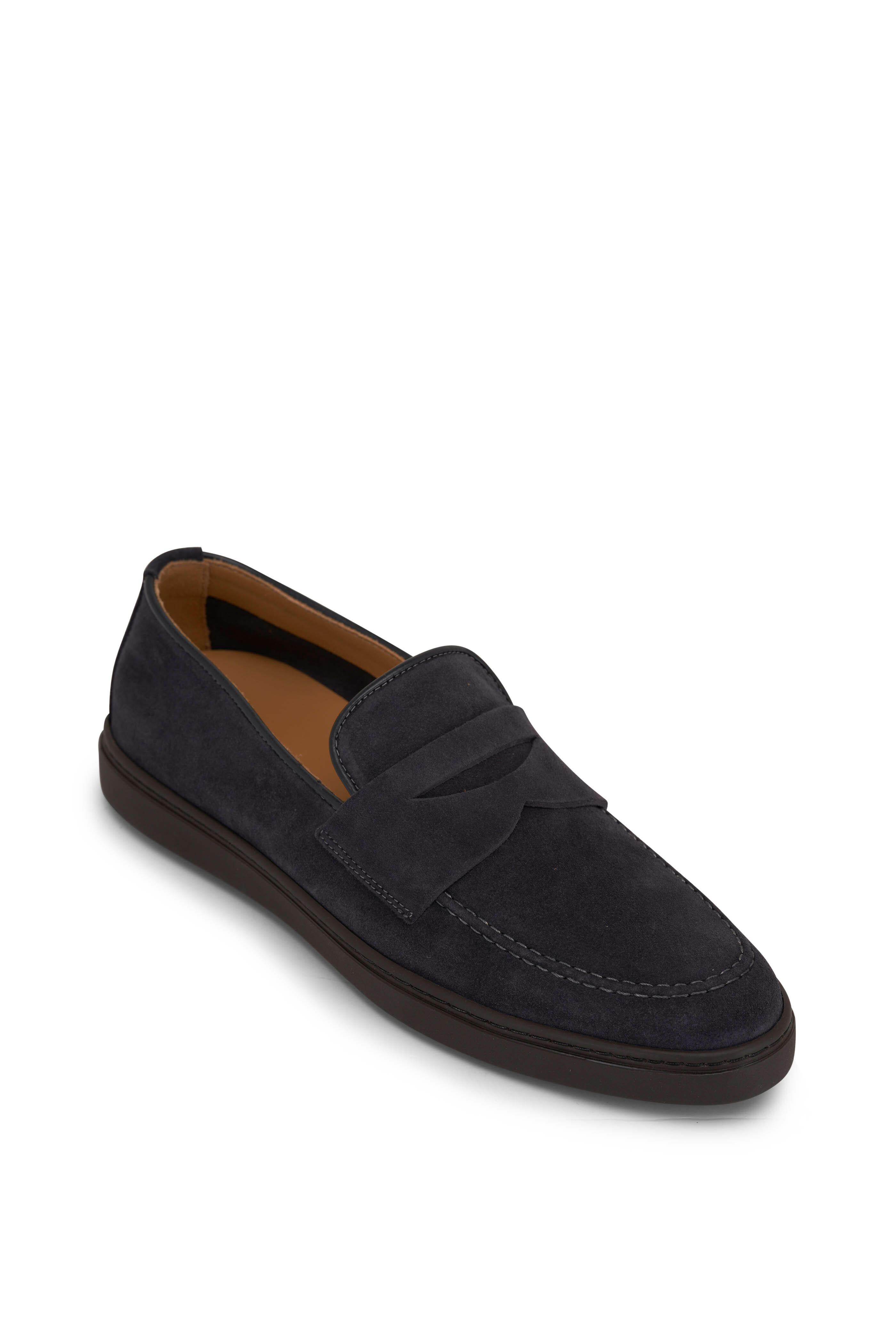 Calfskin suede upper. Apron toe. Penny strap across vamp. Leather lining and insole. Flexible rubber sole. Made in Portugal.