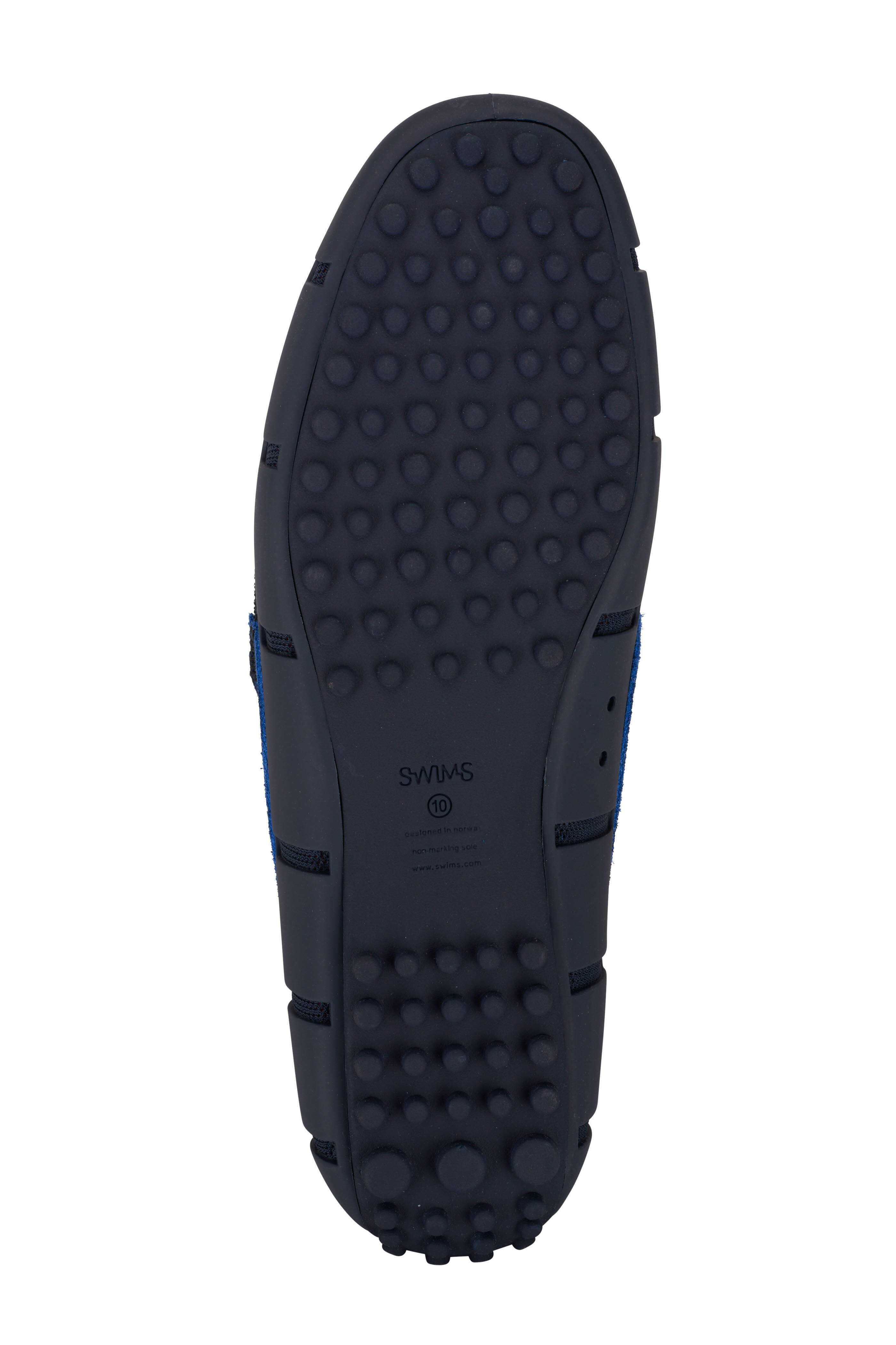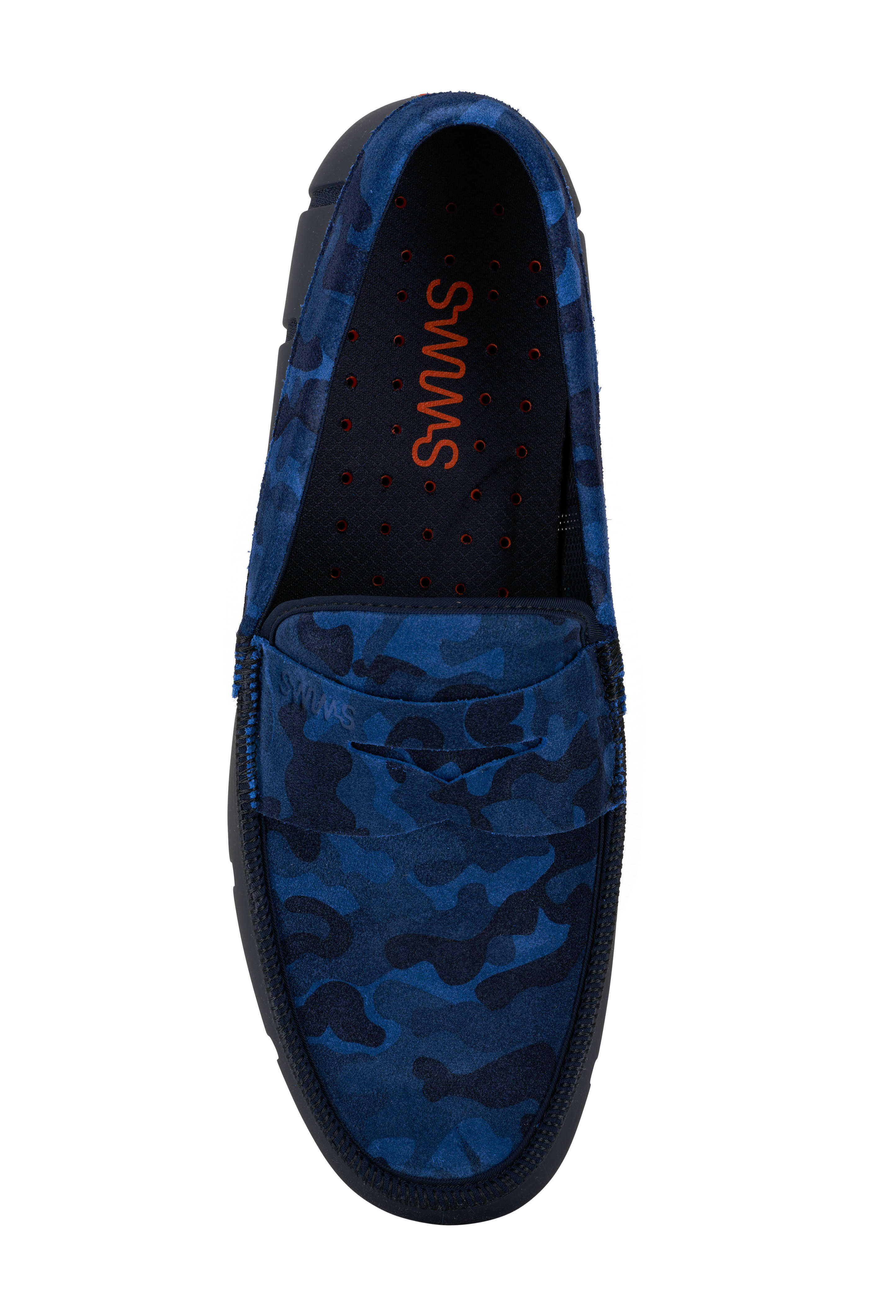 Suede and rubber upper. Moc toe. Penny strap at vamp. Unlined, detachable padded insole. Pebbled rubber sole. Imported.