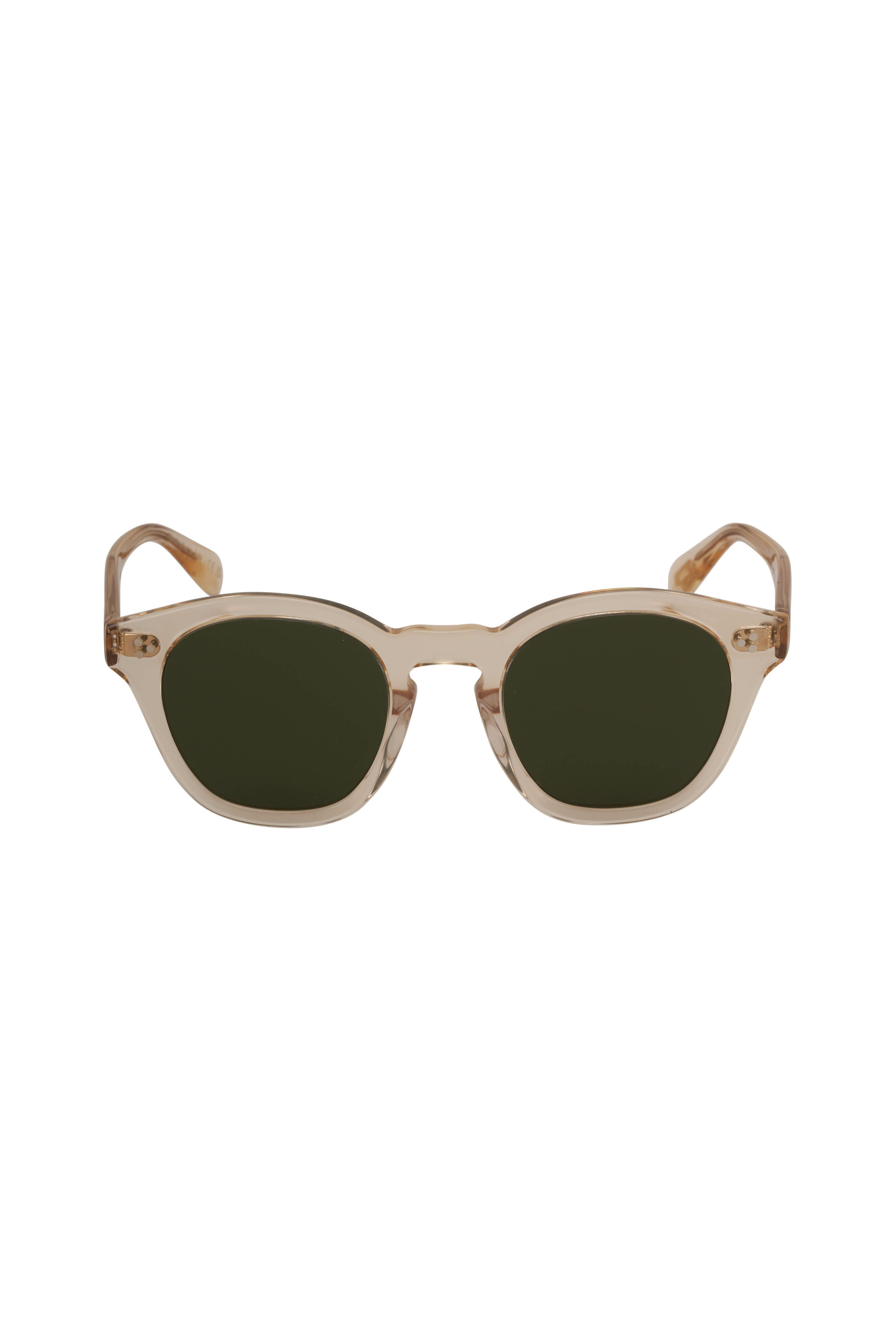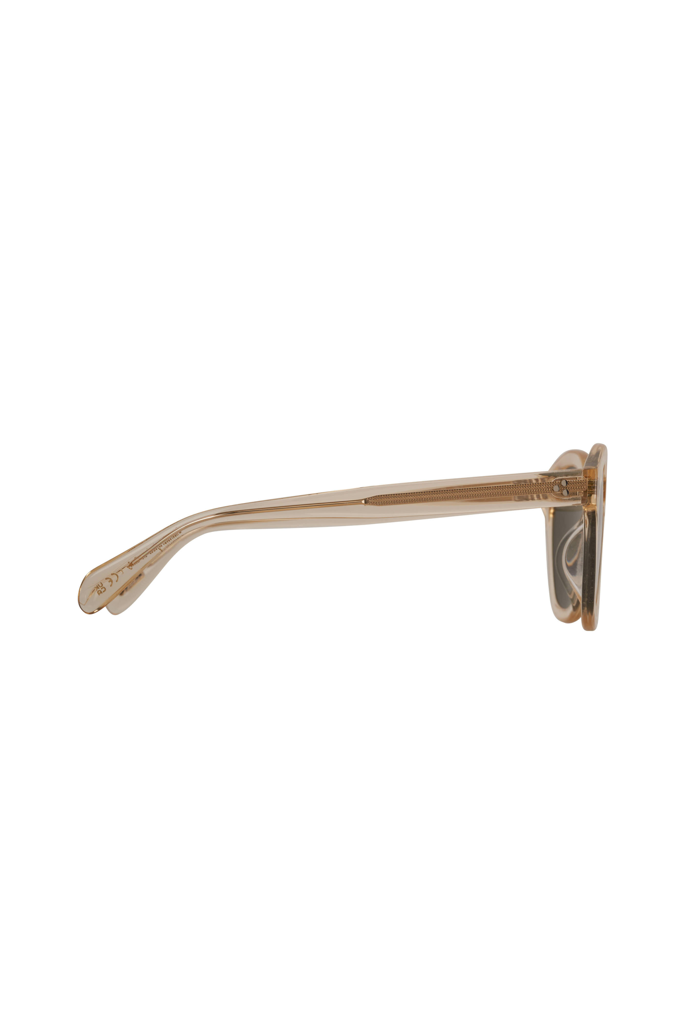 Buff. Green lenses. Acetate frames. Made in Italy. Regular Fitting. A medium lens front designed for those who prefer to cover an average portion of the face.. Universal Fit. This option accommodates most face shapes.